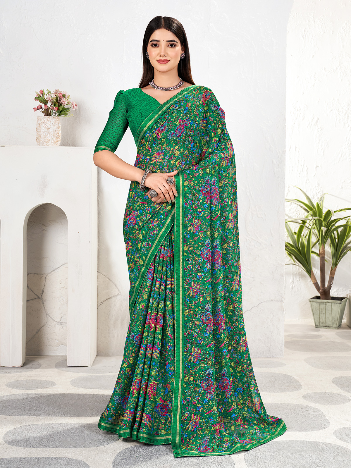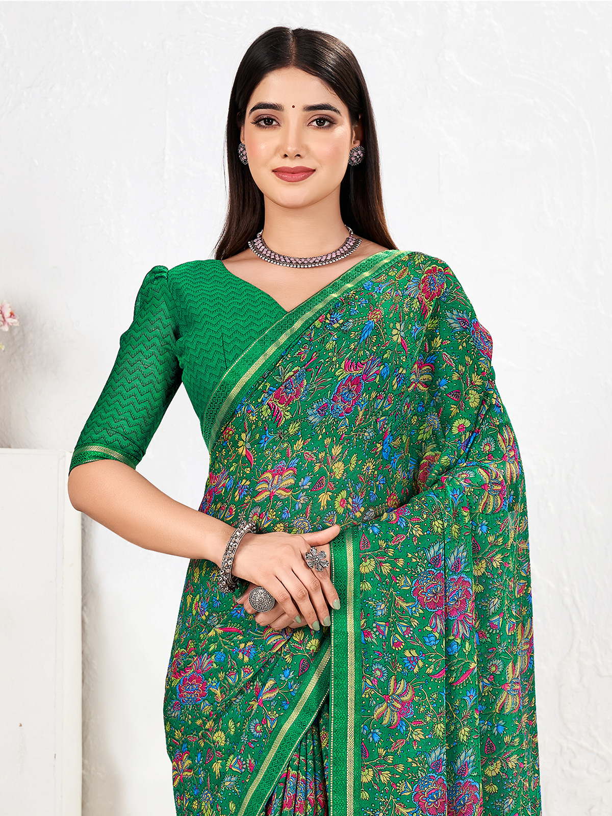 This elegant green georgette saree is detailed with fine zari work and timeless printed motifs. Lightweight and breathable, it ensures a flattering drape. Paired with an unstitched blouse, it is perfect for festive and casual occasions.