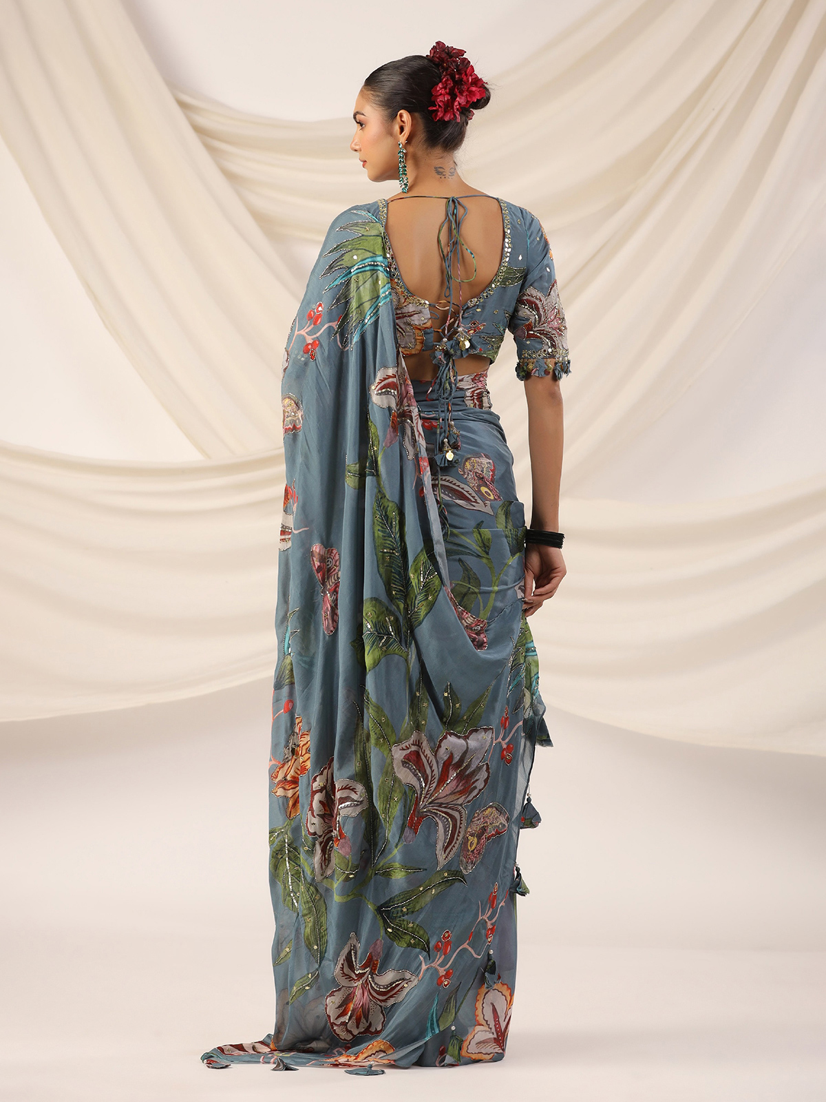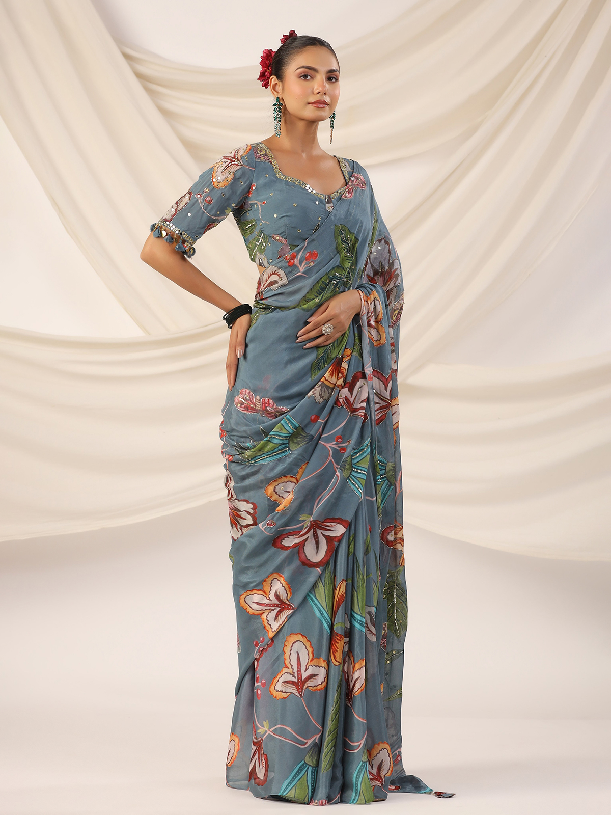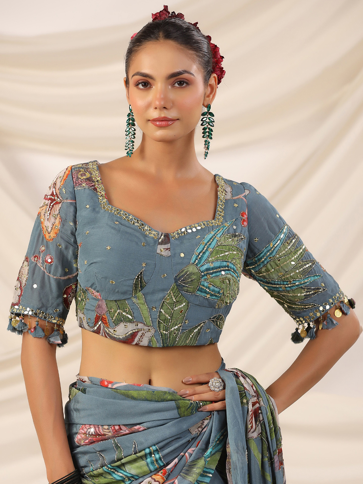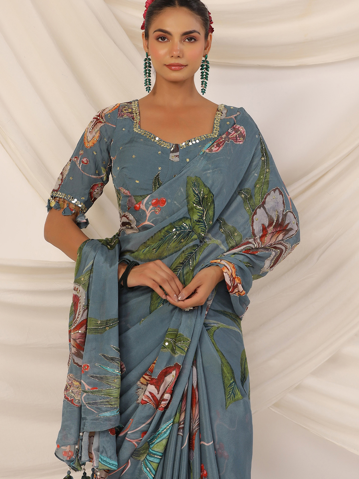 This elegant grey crepe georgette saree comes with a printed blouse beautifully embellished with mirror, aabla, cutdana, and sequins. A graceful choice for festive occasions and weddings, it offers just the right balance of traditional charm and festive sparkle.