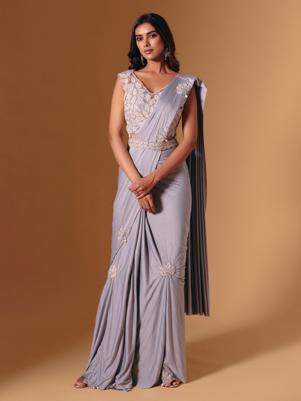 Elegant and understated, this grey lycra saree is adorned with delicate cutdana, sequin, and pearl accents. The designer waist belt adds a modern sculpted charm. A refined choice for receptions, weddings, and sophisticated evening parties.