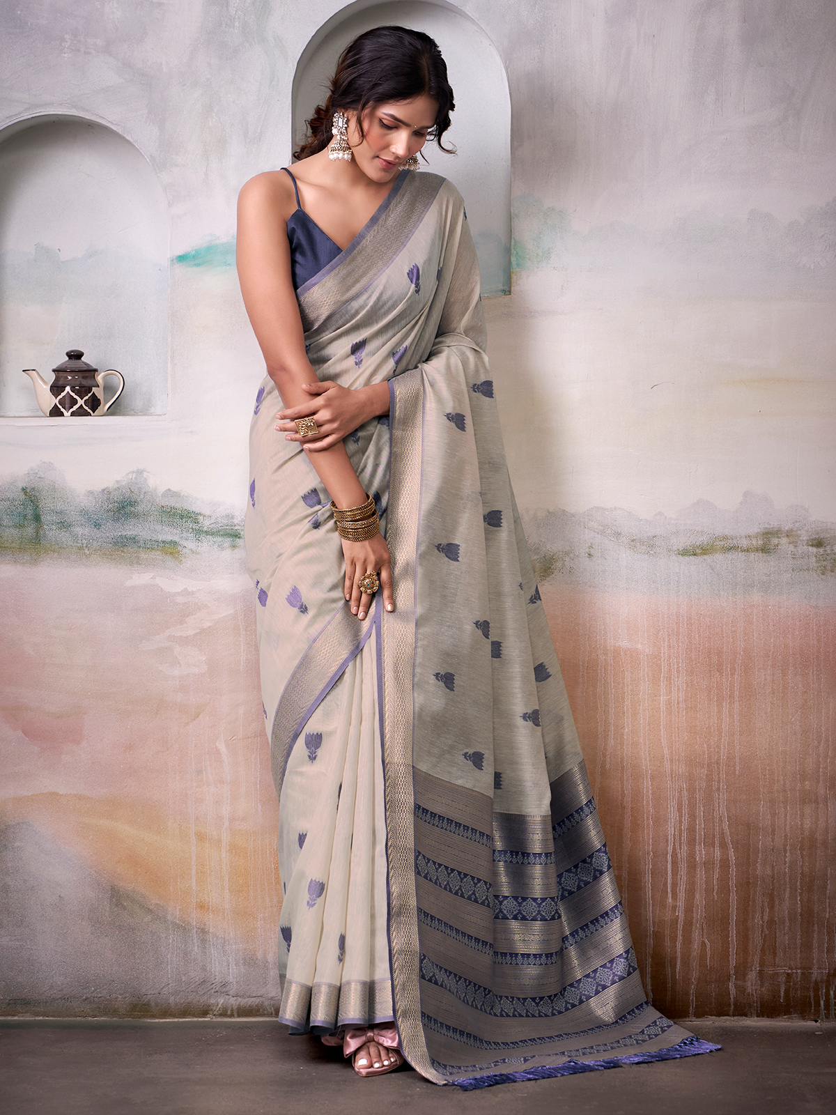 Discover understated elegance with this grey cotton saree, designed with beautiful traditional motifs and a vibrant blue border. Whether for summer weddings, festive events, or casual ethnic wear, it offers effortless sophistication. Includes an unstitched blouse piece for a tailored finish.