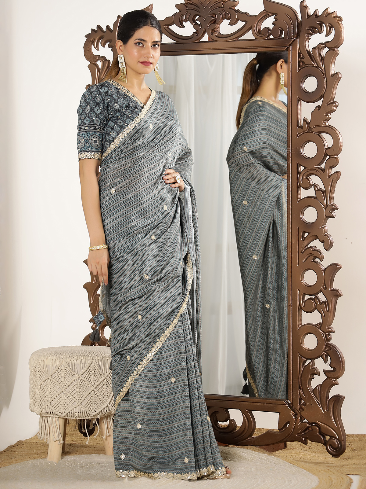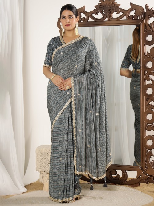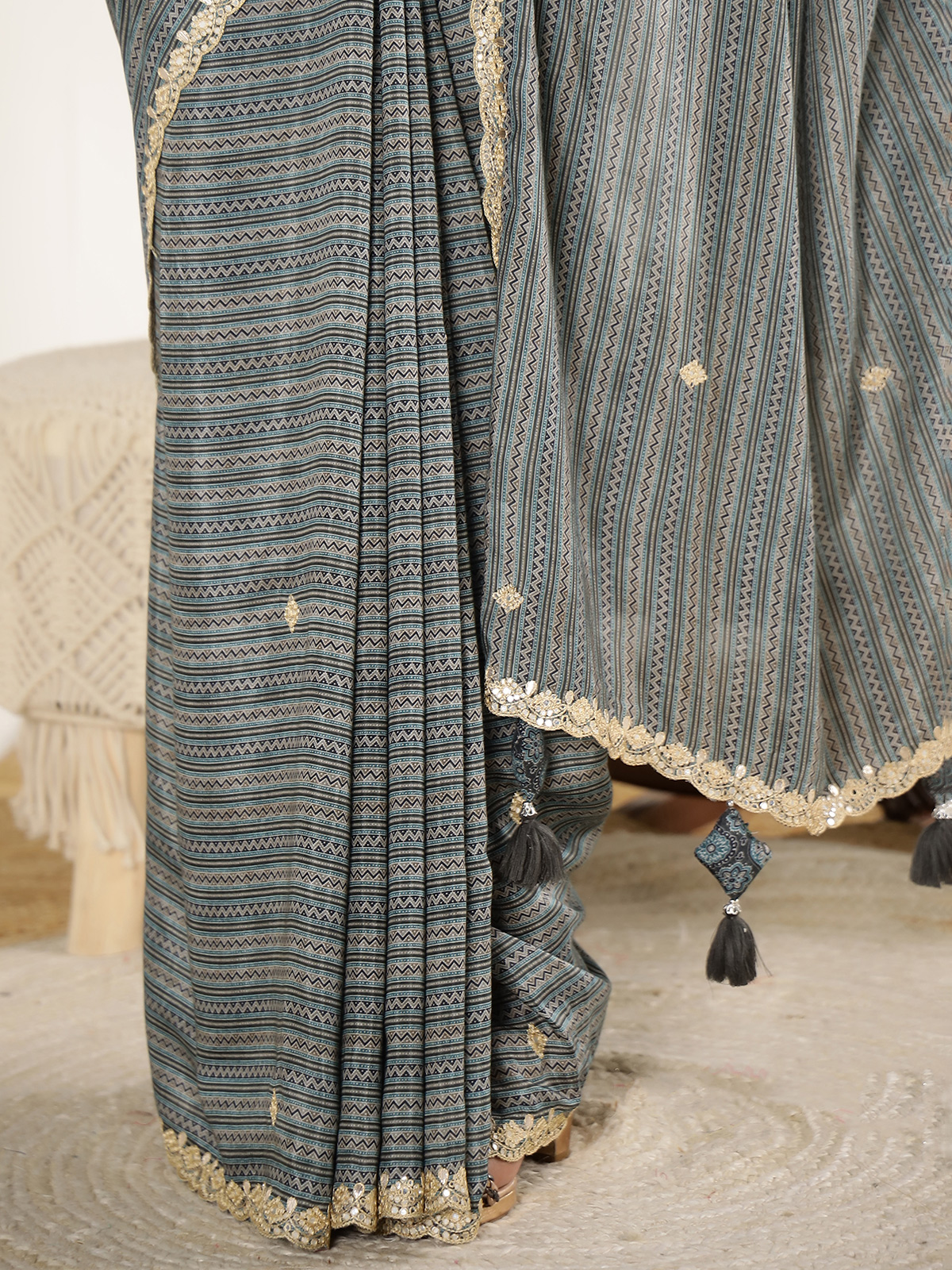Stay effortlessly chic in the grey printed muslin saree, featuring intricate mirror, gota, and resham work. Paired with a ready made blouse for all day comfort and style.