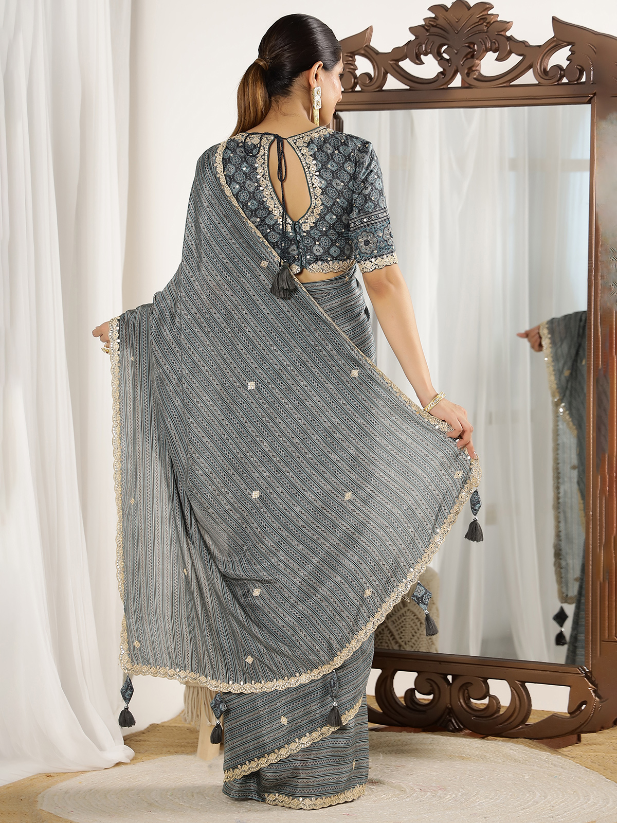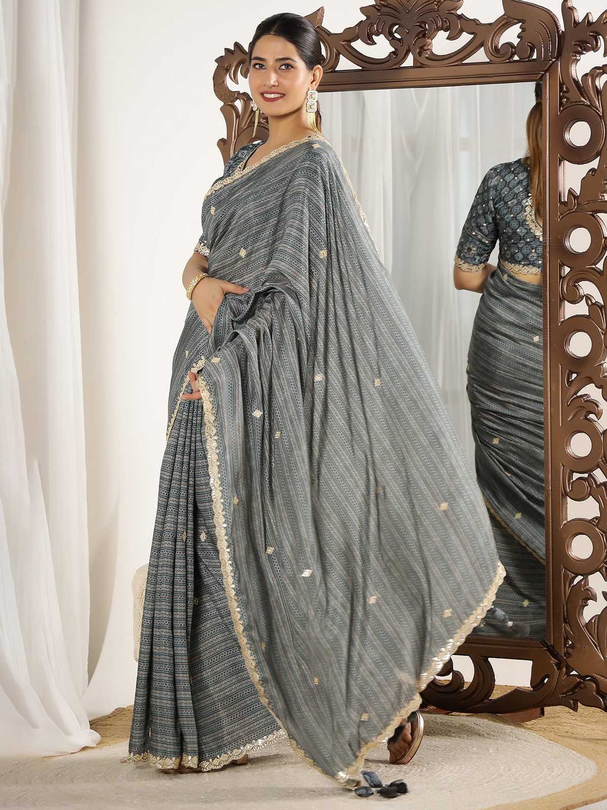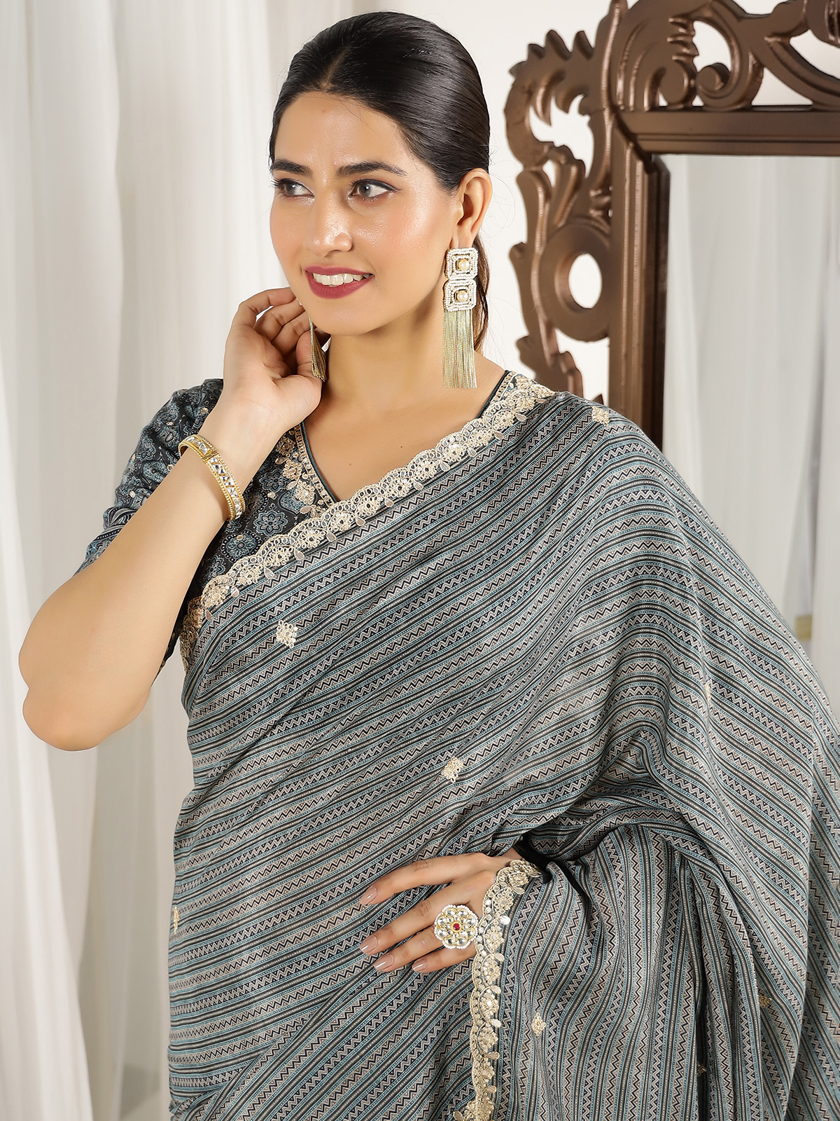 Stay effortlessly chic in the grey printed muslin saree, featuring intricate mirror, gota, and resham work. Paired with a ready made blouse for all day comfort and style.
