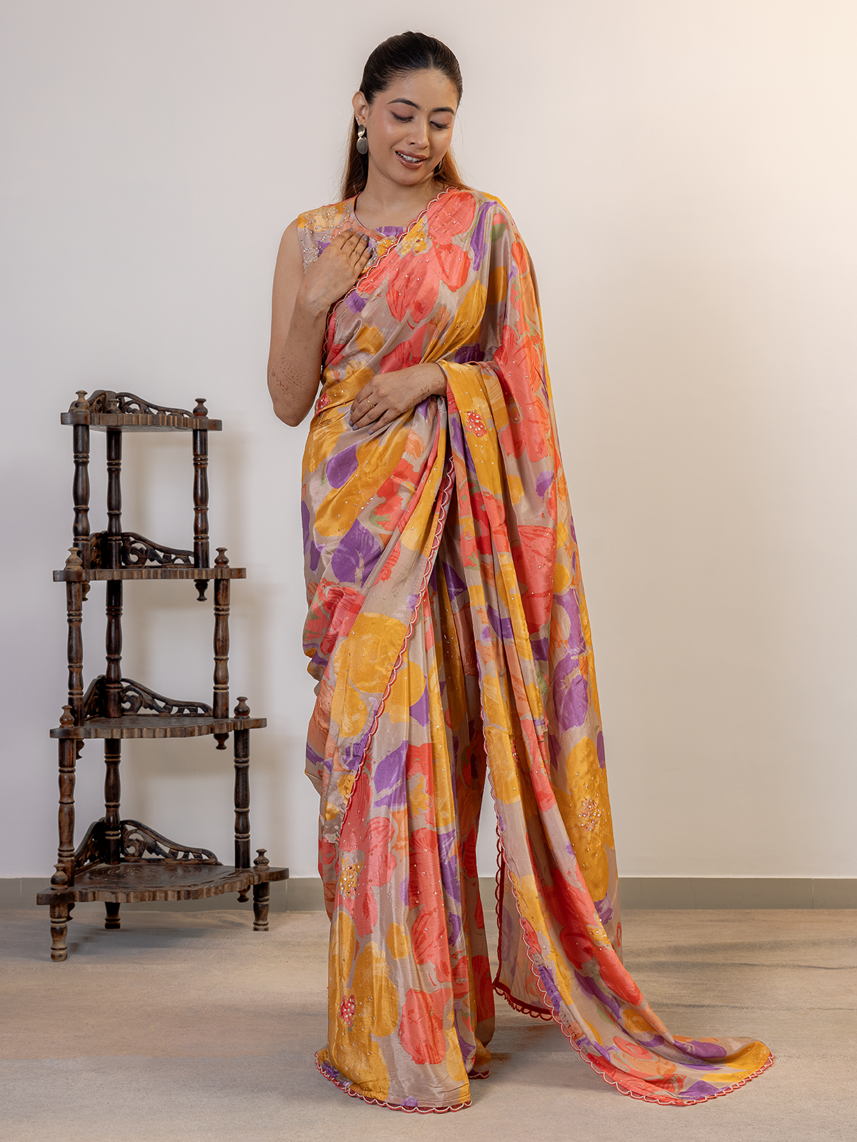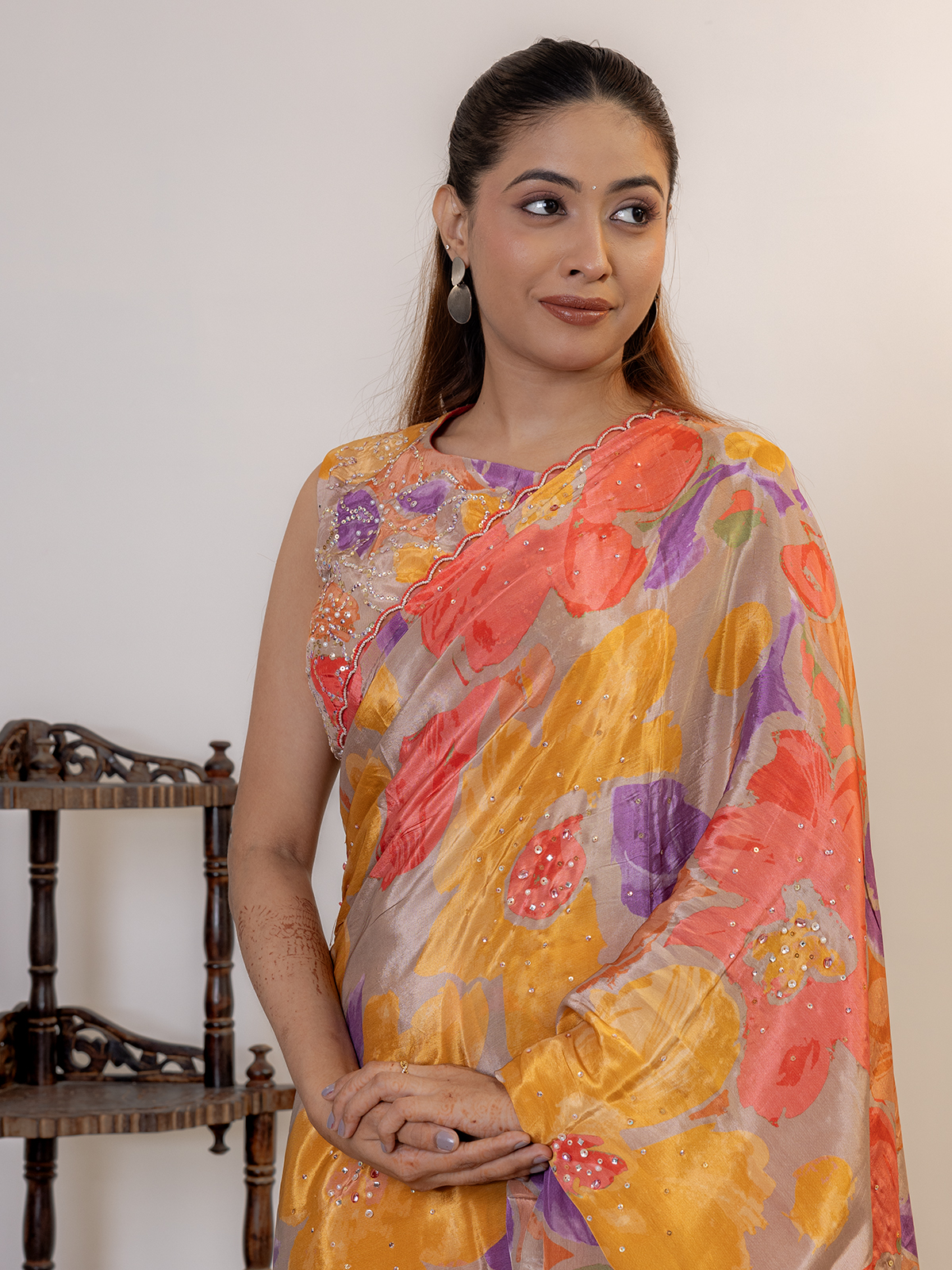Step into any celebration with this elegant grey silk saree, designed for both lightness and sophistication. Adorned with shimmering beads, sequins, and stone work, it ensures all eyes are on you. Paired with an unstitched blouse piece for a perfect finish.