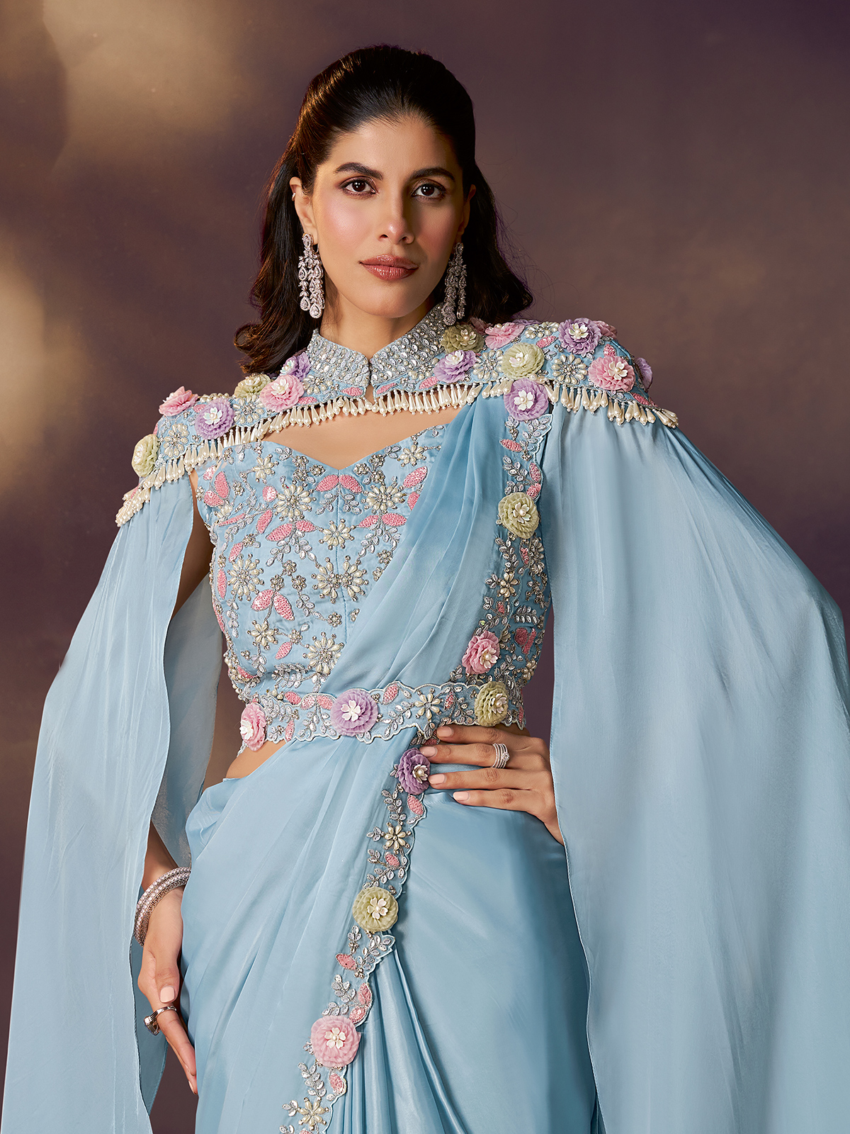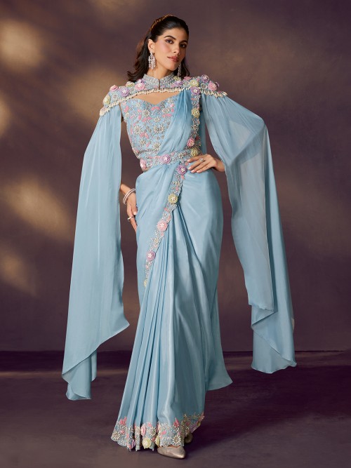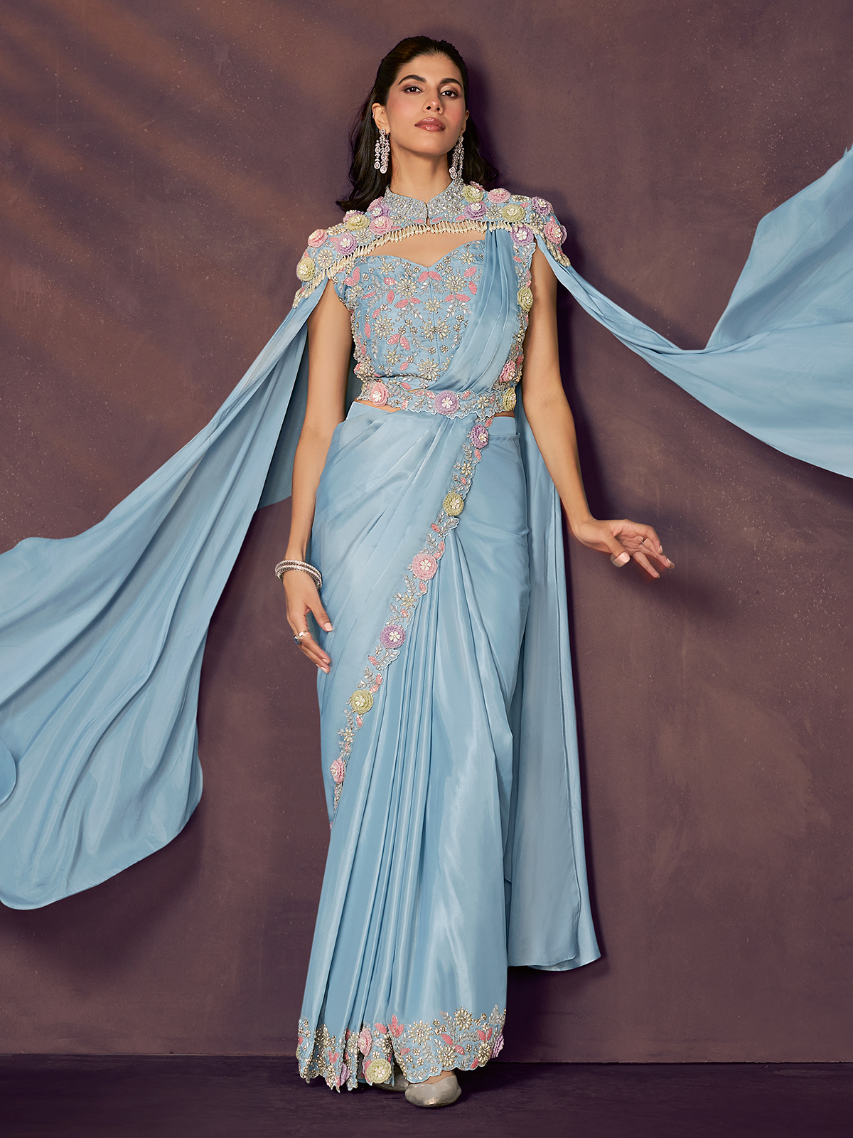 In serene grey two-tone satin silk, this saree glistens with embroidery, sequins, diamonds, pearls, and beads. The attached waist belt highlights the waist with refined elegance—perfect for wedding receptions and evening galas.