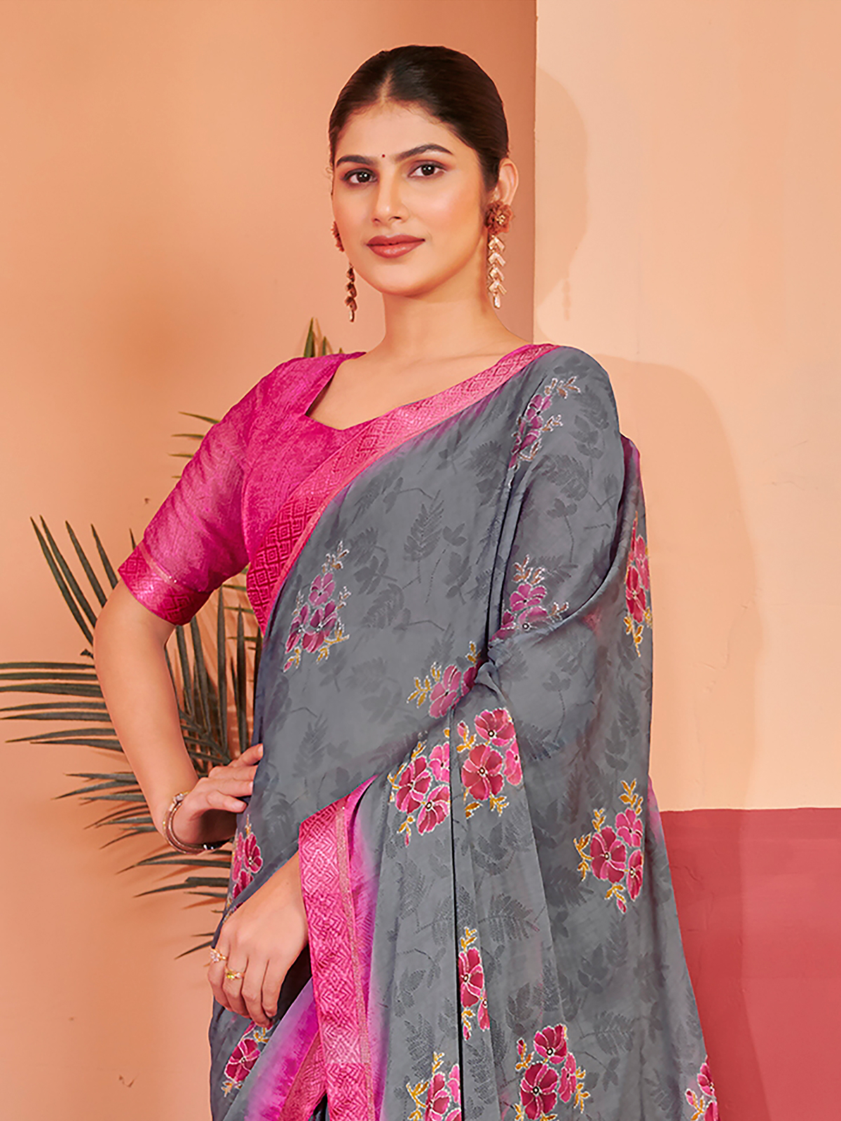 Crafted in airy georgette, this grey shaded saree is adorned with elegant floral prints that add subtle charm. Delicate lace detailing enhances the border, lending a refined feminine touch. Paired with an unstitched blouse piece, it offers effortless elegance, making it suitable for casual outings, puja functions and simple festive occasions.