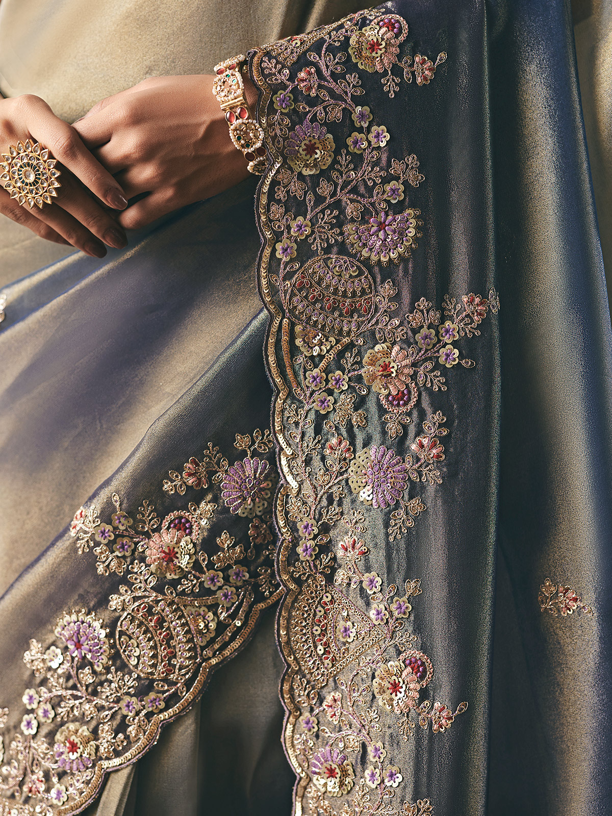 This modern grey shaded tissue silk saree features smooth tonal transitions that feel effortlessly contemporary. Delicate resham and sequins highlights glimmer softly, bringing a quiet sophistication to each pleat. Completed with an unstitched blouse, it is ideal for festive nights, weddings, receptions and stylish party occasions.