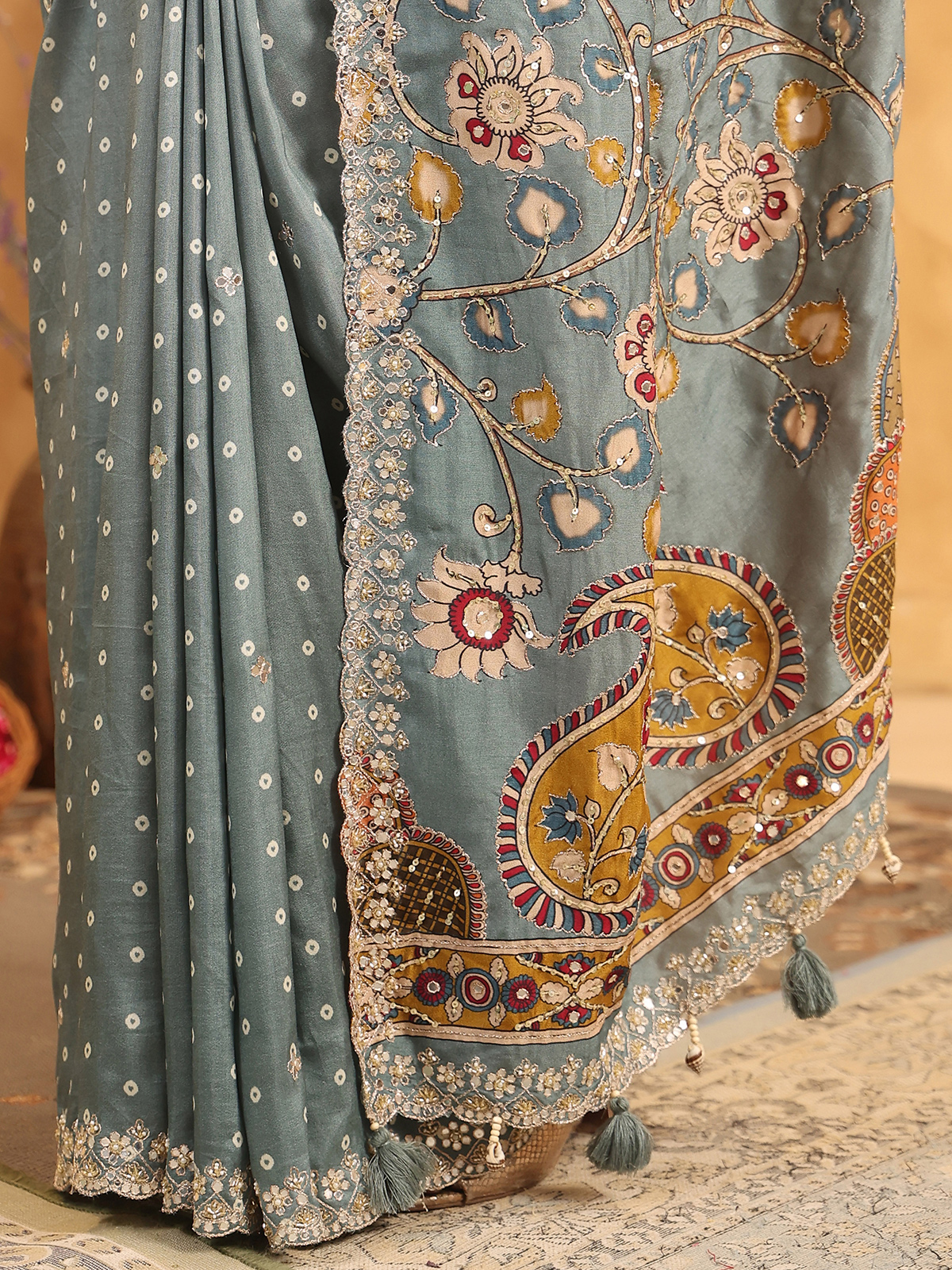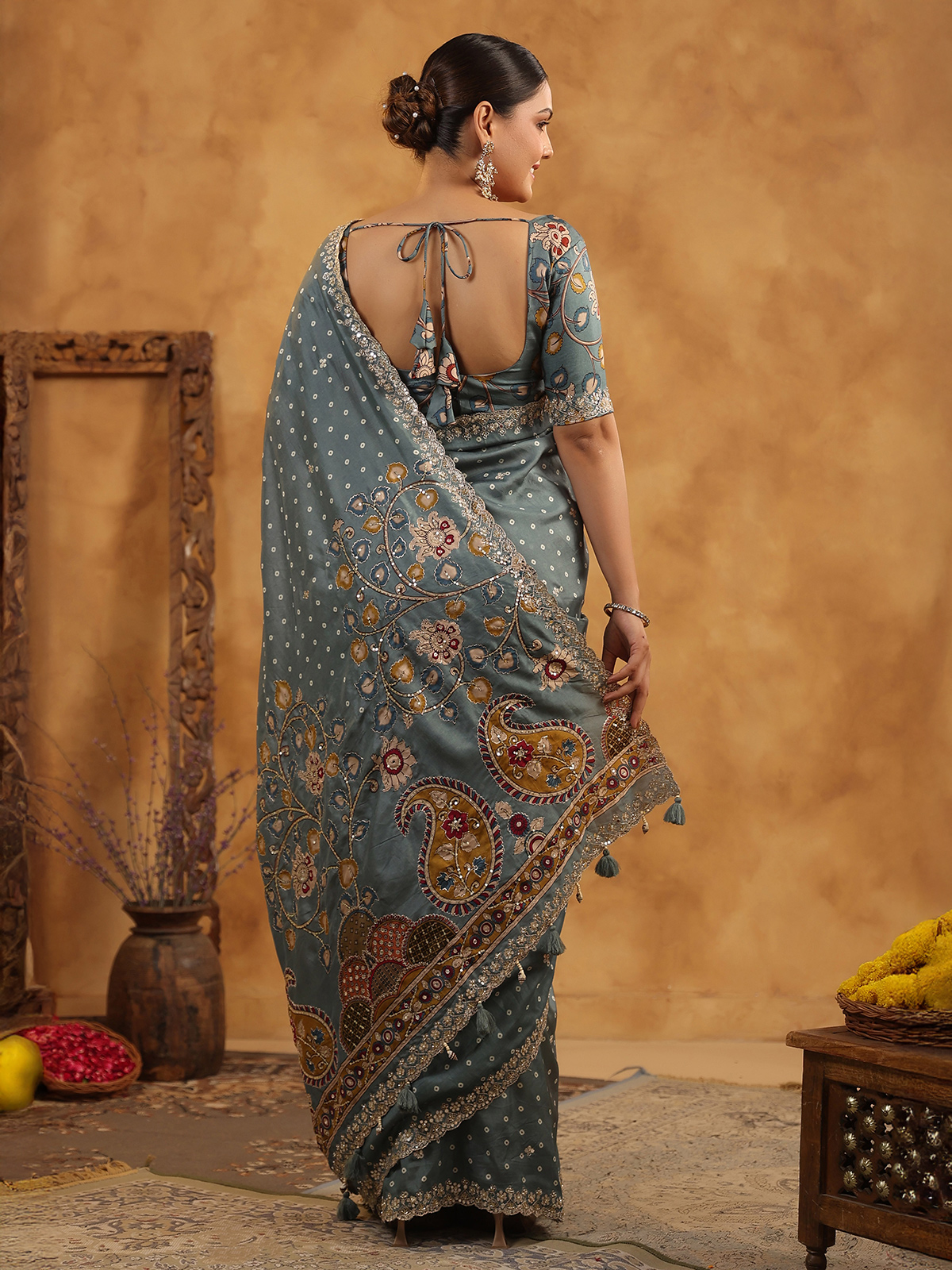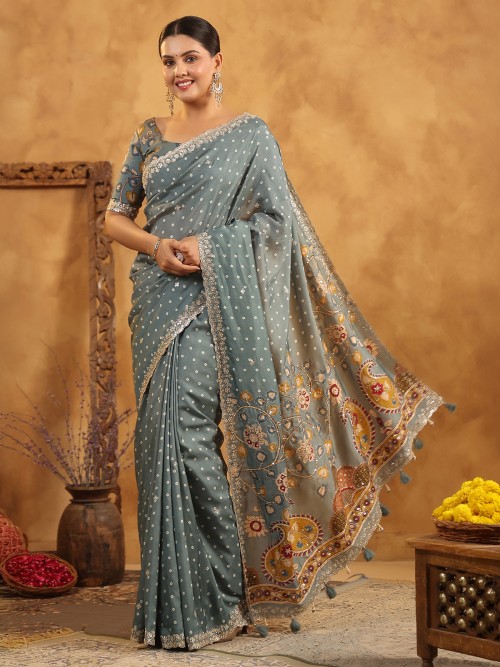 Grey Silk Saree Featuring Traditional Resham Work