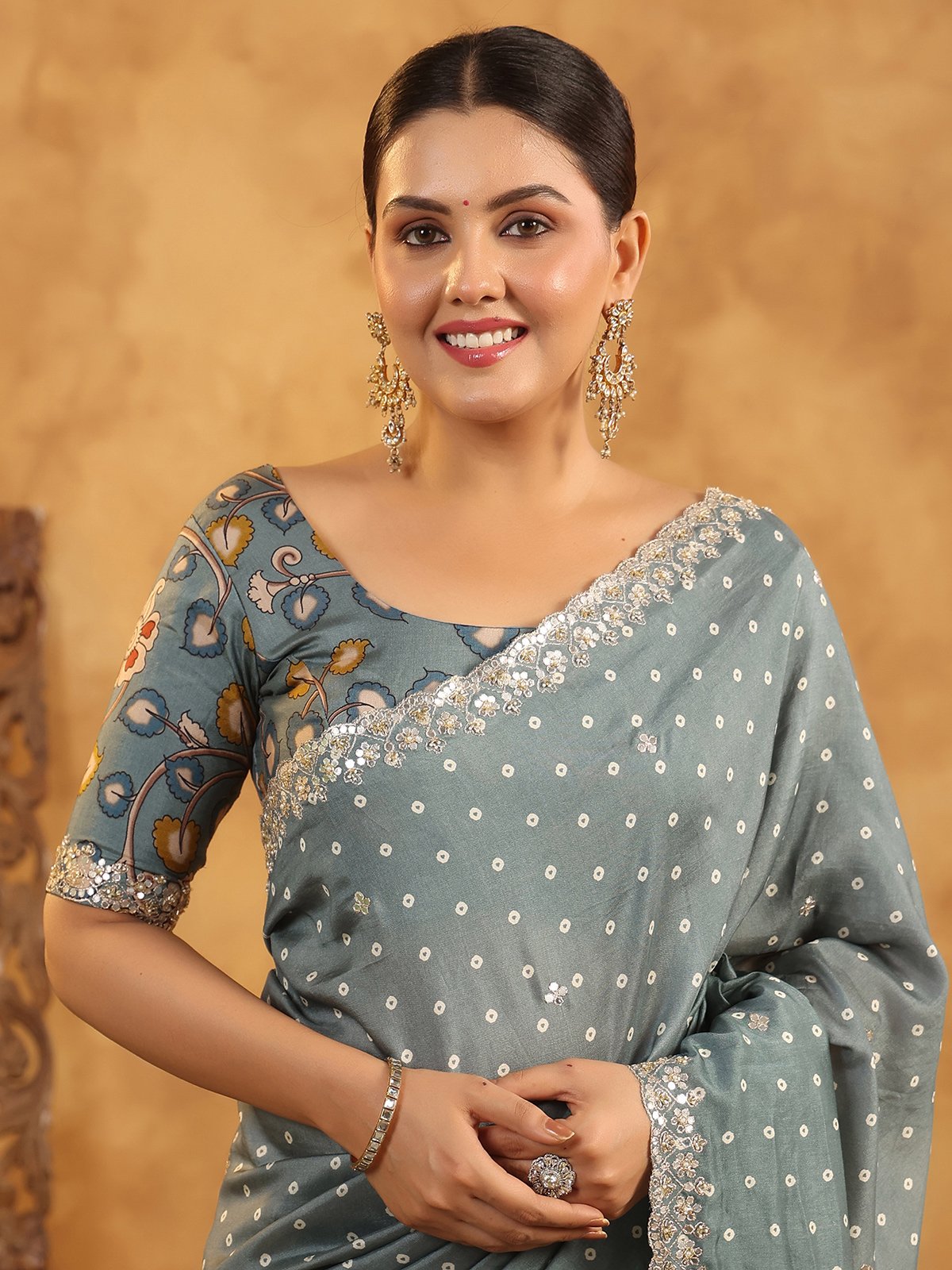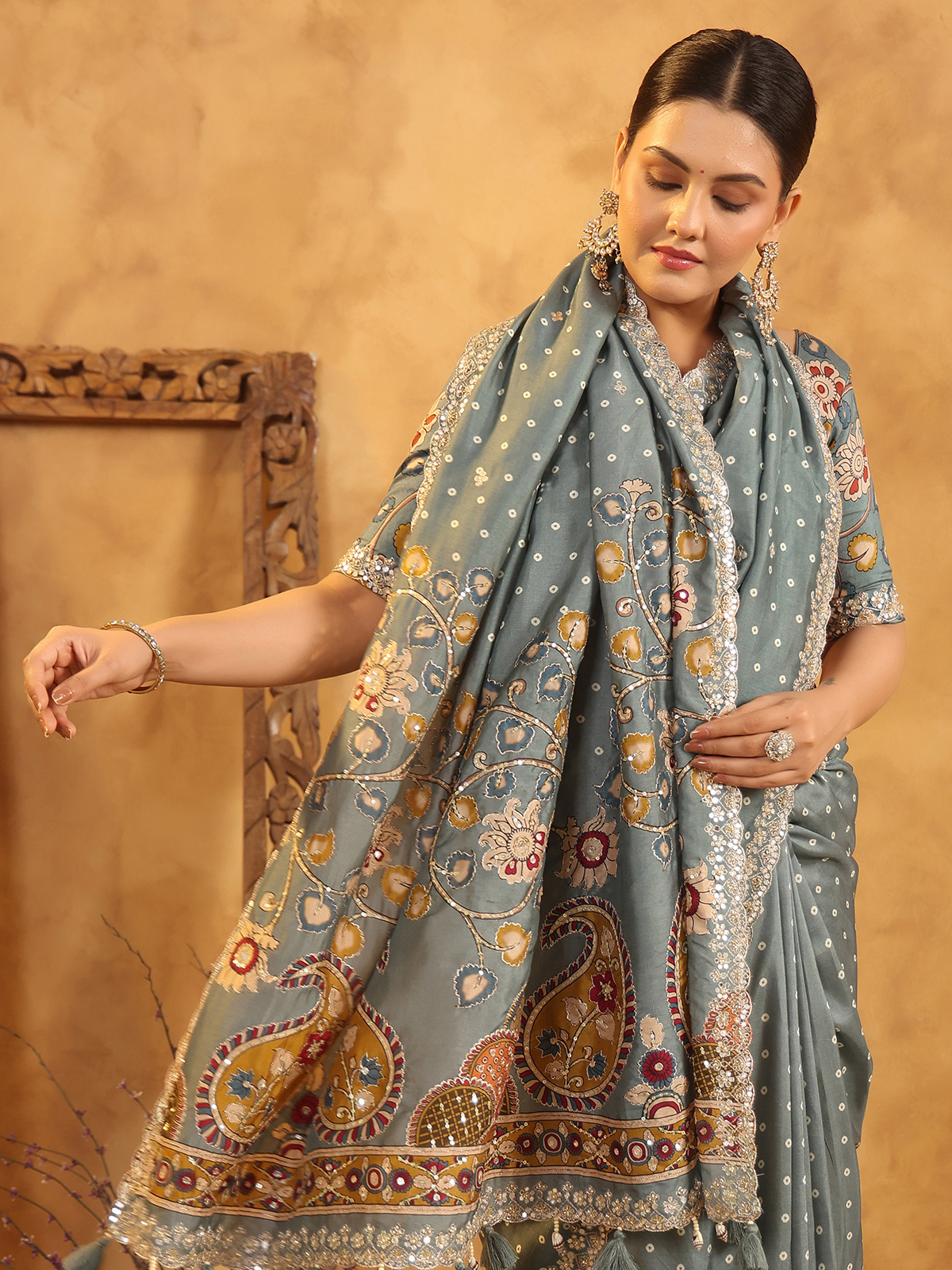 Modern sophistication shines in the grey silk printed saree, moving fluidly with every step. Resham, sequins, cutdana, and beads sparkle with subtle festive charm. Comes with an unstitched blouse piece for wedding celebrations.
