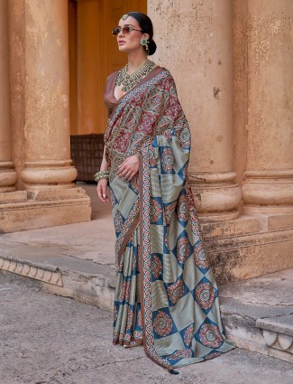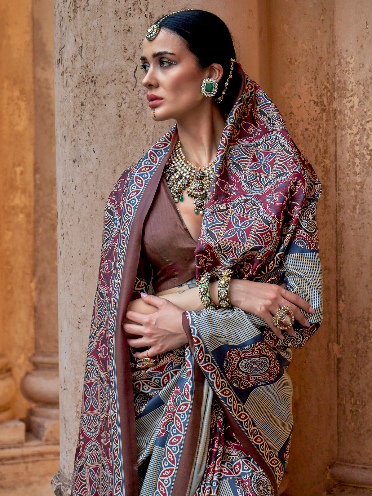 Make a bold impression with this grey printed silk saree, designed with trendy patterns and a sleek drape. A smart pick for festive dinners or evening outings. Unstitched blouse included.