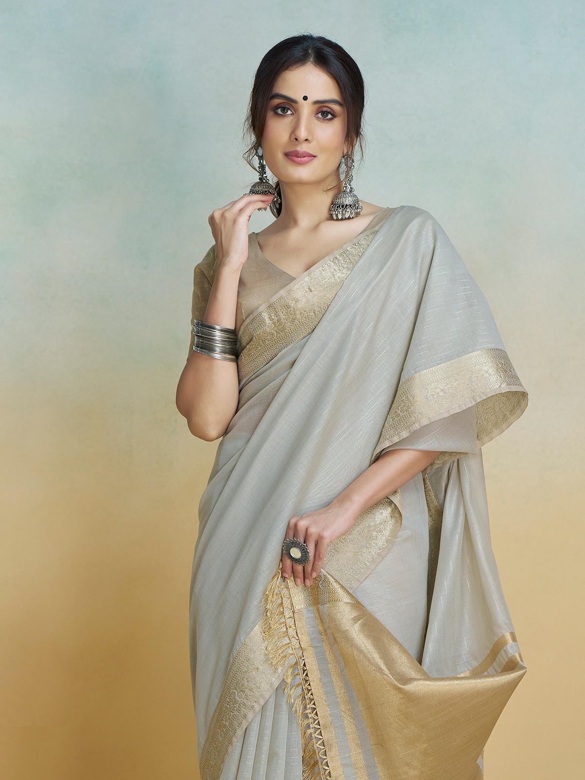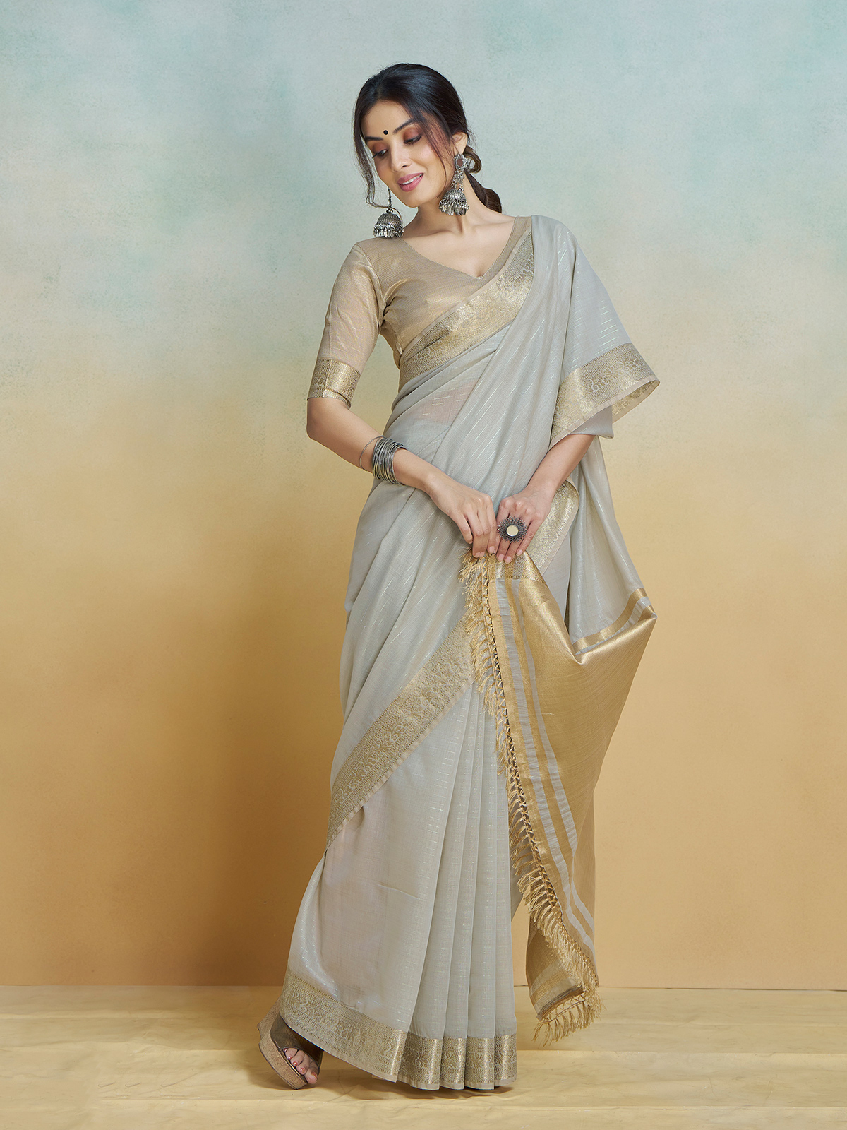 Embrace timeless grace with this grey silk saree, featuring exquisite zari weaving that shimmers with every movement. Accompanied by an unstitched blouse for a tailored fit, its perfect for weddings, festive gatherings, or cultural celebrations. A harmonious blend of tradition and elegance that elevates your festive wardrobe effortlessly.
