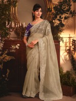 Grey Tissue Organza Saree Accented With A Rich Purple Blouse