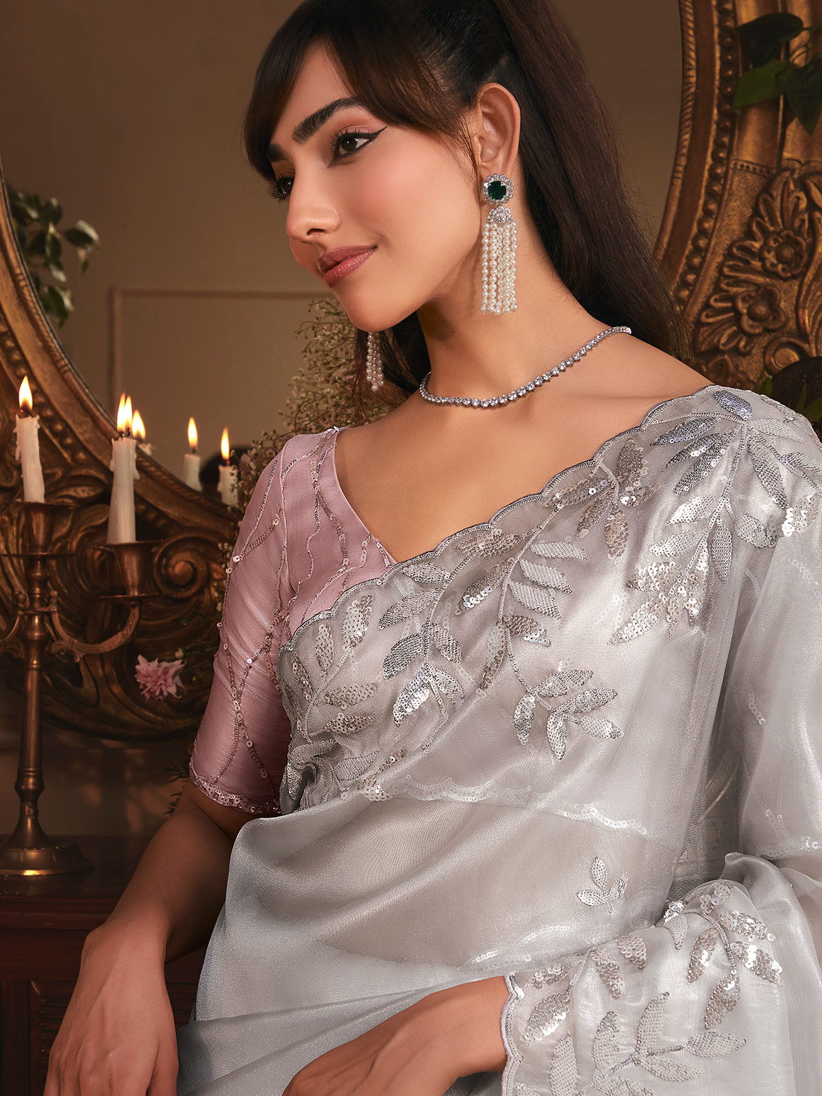 Grey Tissue Organza Saree Detailed With Sparkling Sequin