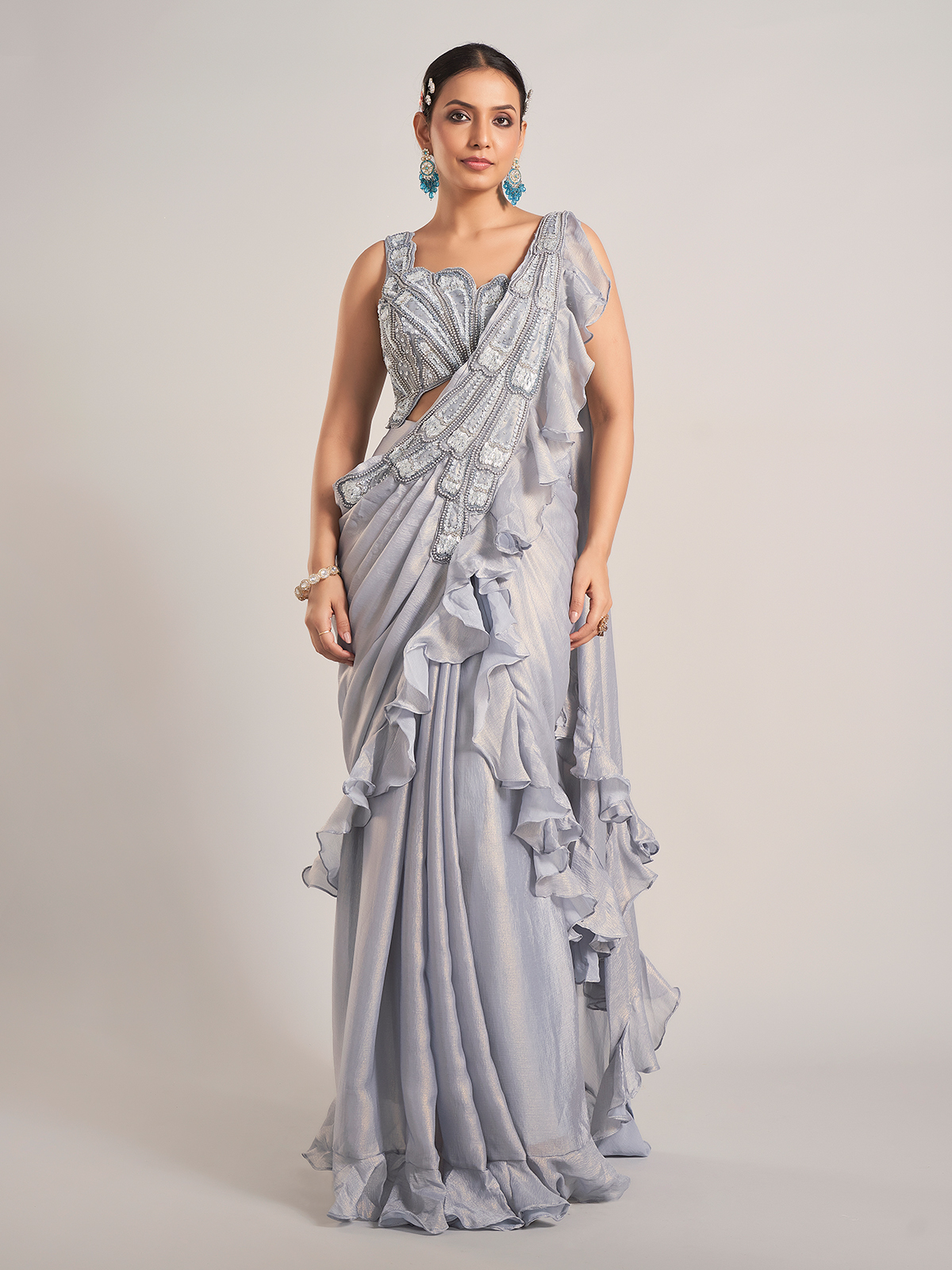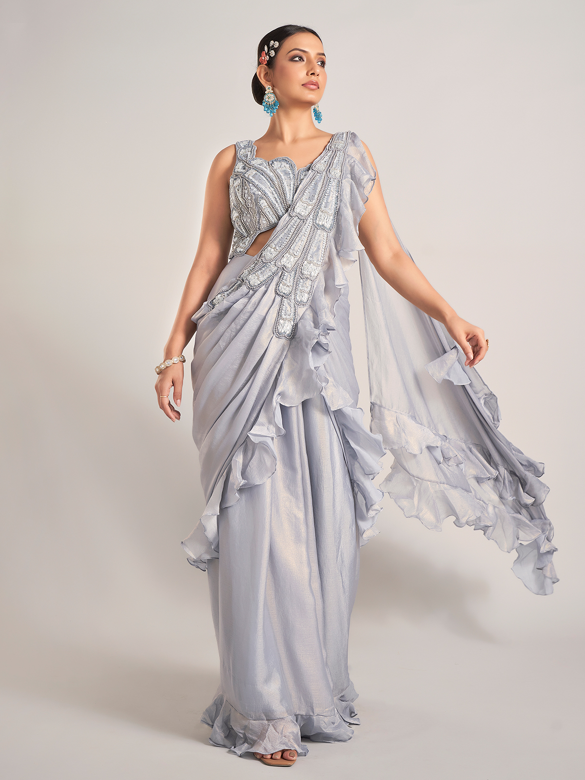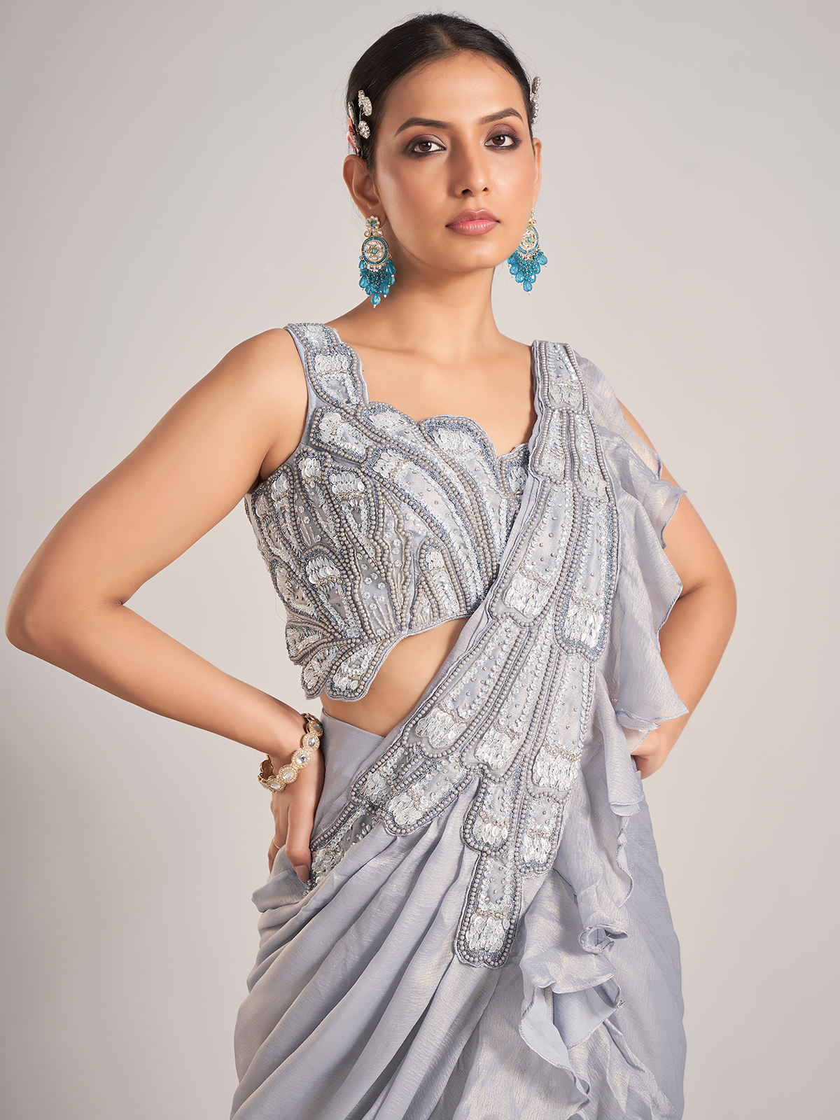Grace blooms beautifully in this grey tissue silk ready-to-wear saree, enriched with sparkling beads, sequins, stones, and cutdana detailing. Paired with a designer blouse, it offers an effortless drape and a refined festive charm ideal for weddings, receptions, and party celebrations.