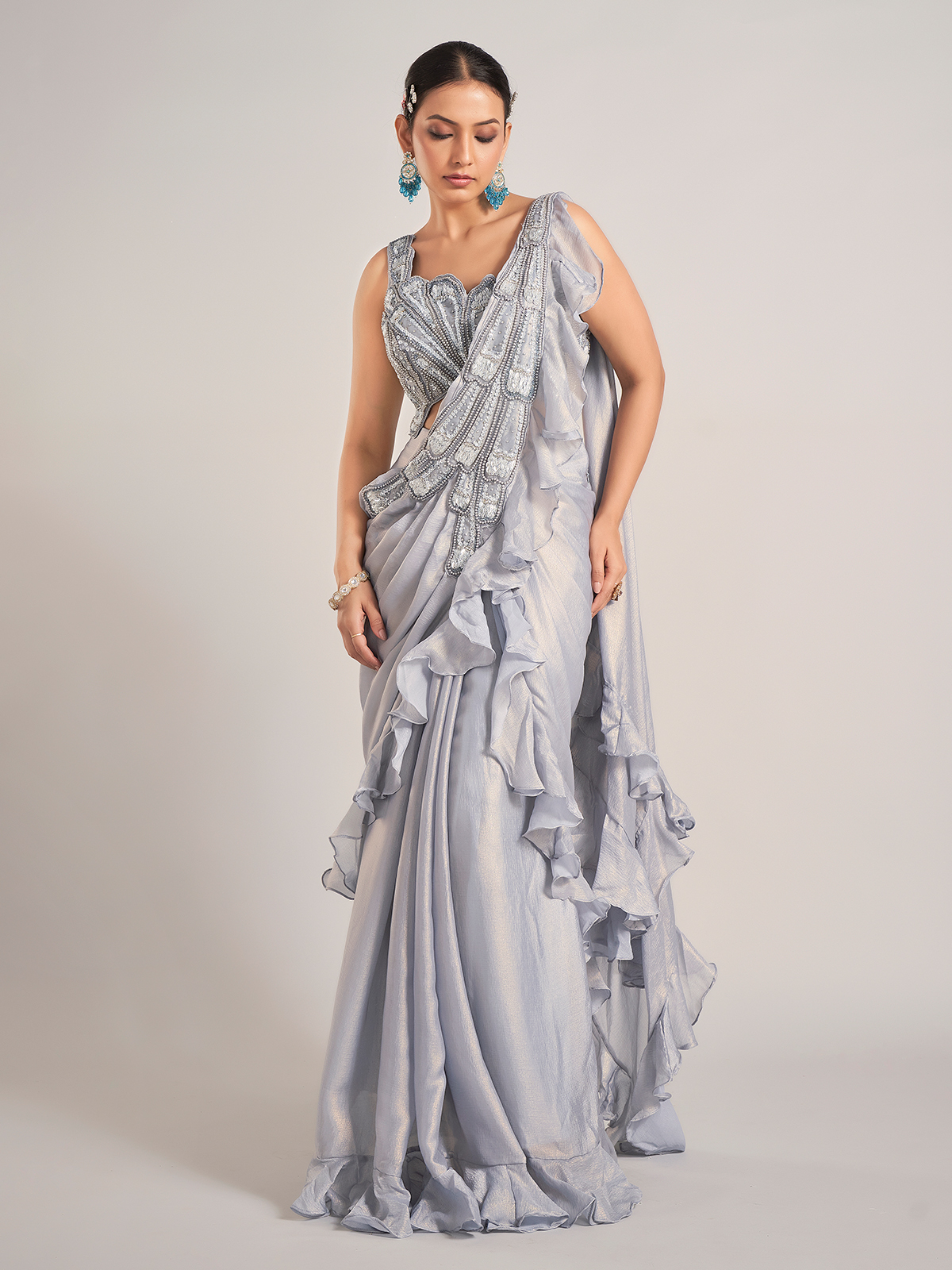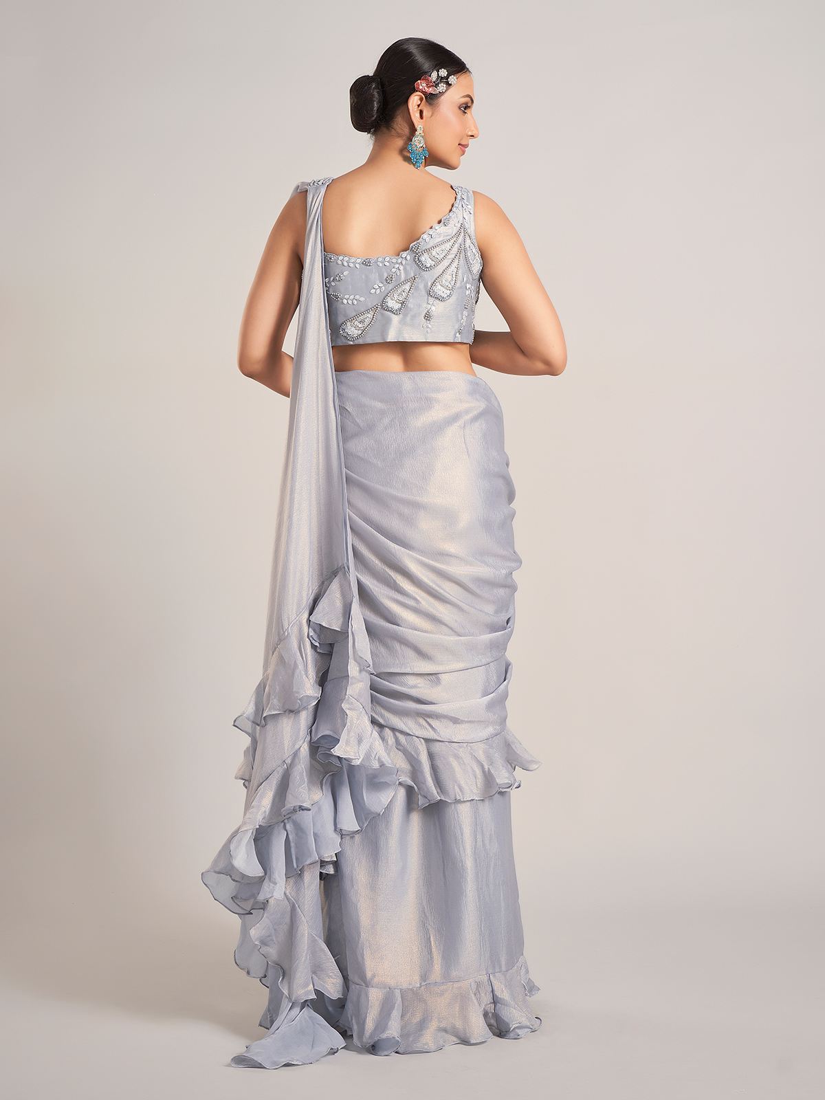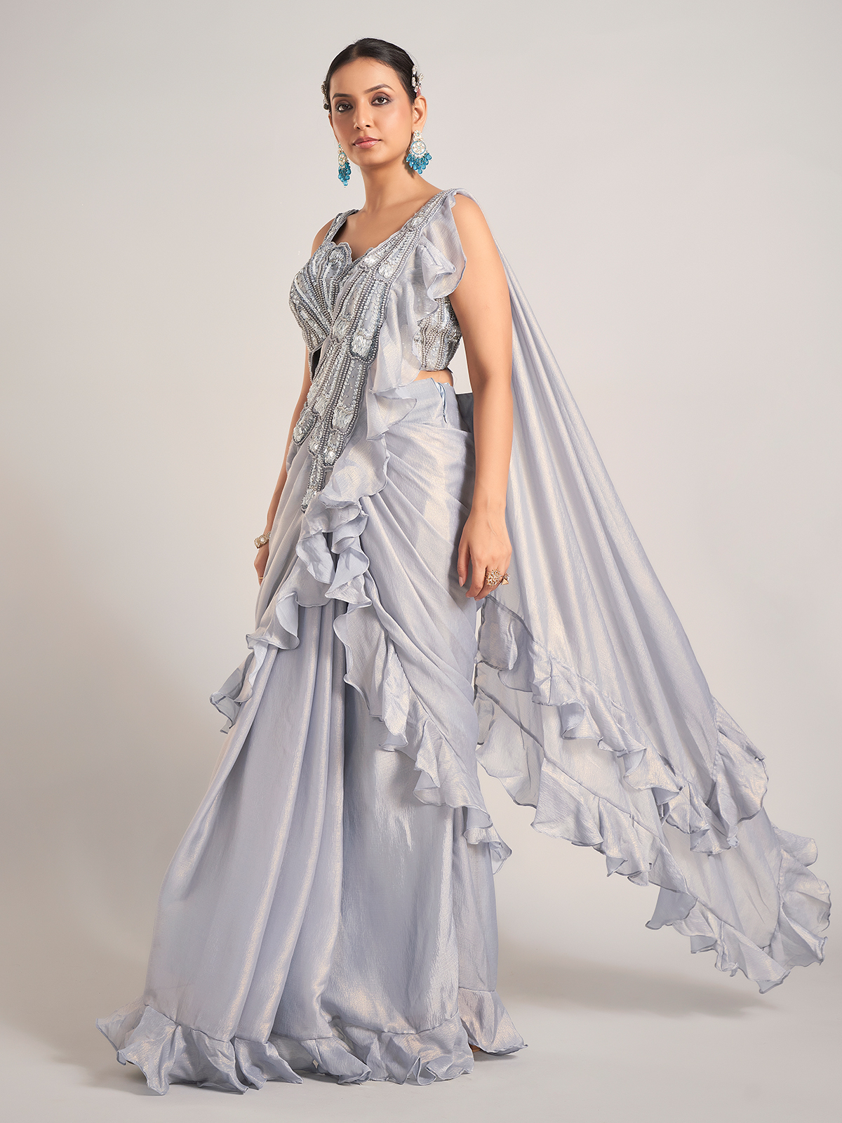 Grace blooms beautifully in this grey tissue silk ready-to-wear saree, enriched with sparkling beads, sequins, stones, and cutdana detailing. Paired with a designer blouse, it offers an effortless drape and a refined festive charm ideal for weddings, receptions, and party celebrations.