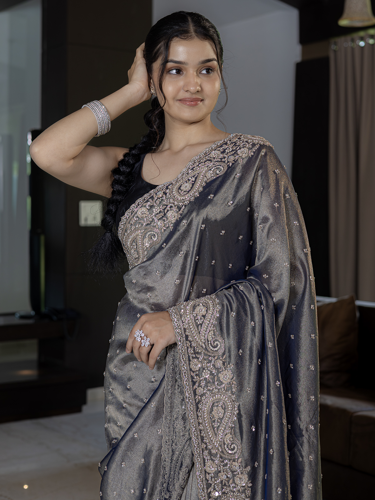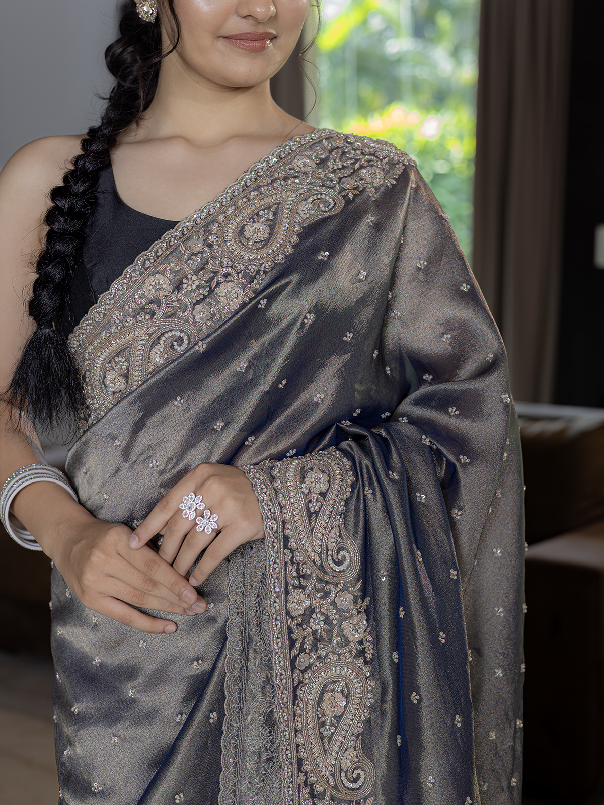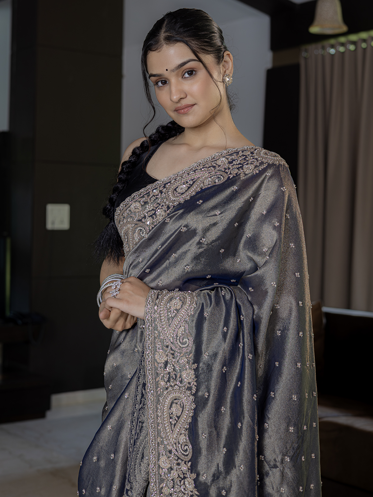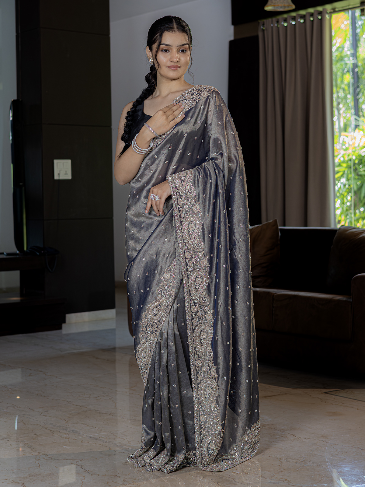 Elegant and refined, this grey tissue silk saree glimmers with sequins, cutdana, beads, and zardosi artistry. The luxurious finish and understated hue create a majestic aura for weddings, receptions, and sangeet occasions. Includes an unstitched blouse piece.