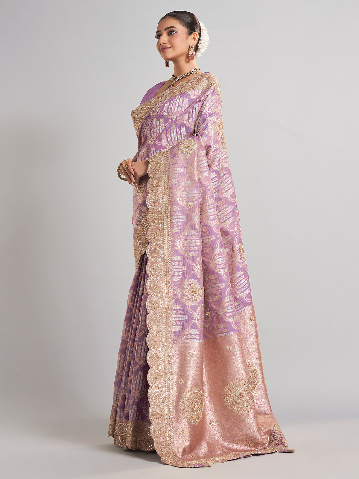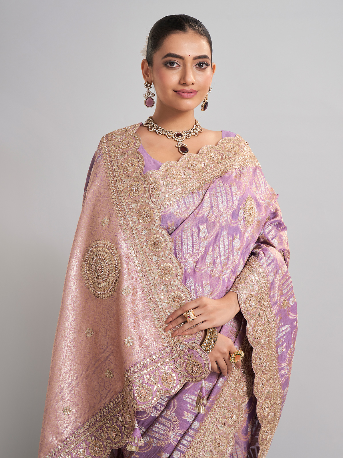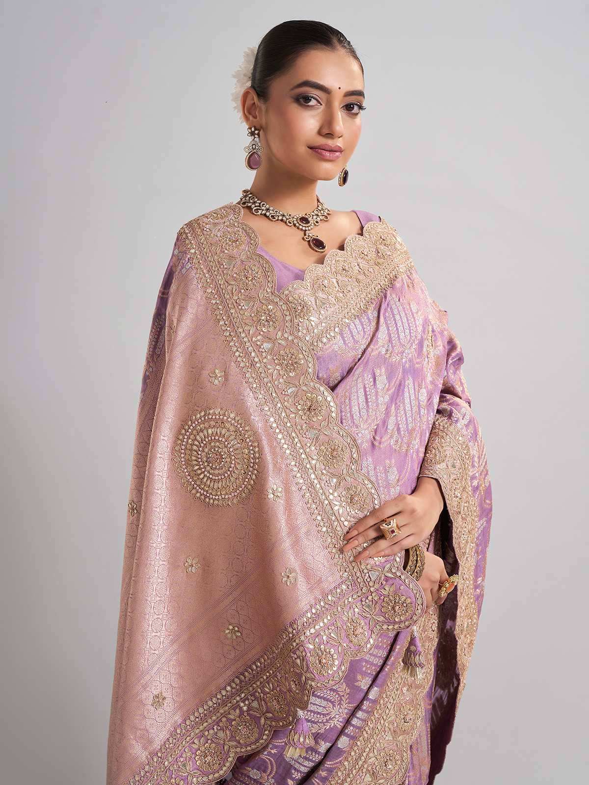 Radiating soft grandeur, this lavender purple banarasi silk saree features intricate zardosi, beads, and sequins. A refined choice for wedding receptions or bridal celebrations, with an unstitched blouse piece for a custom look.