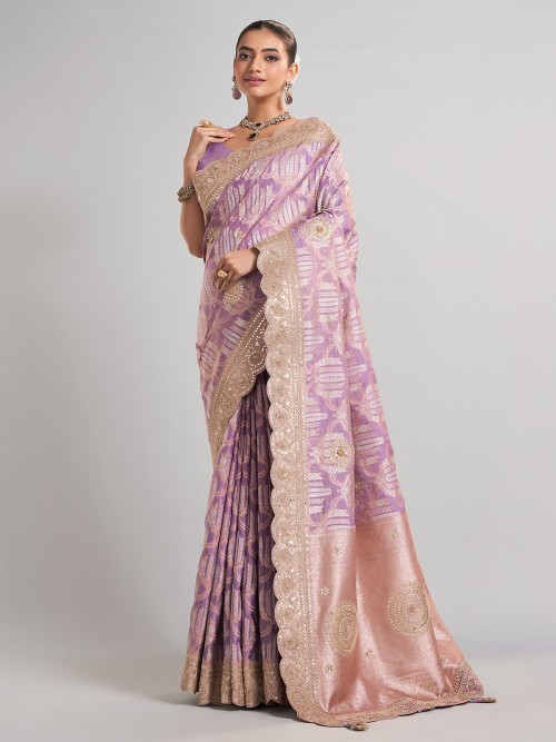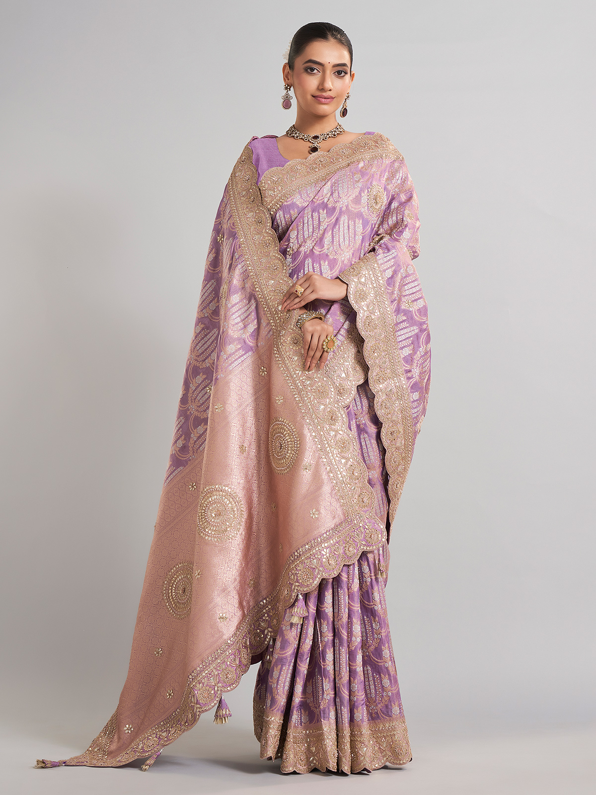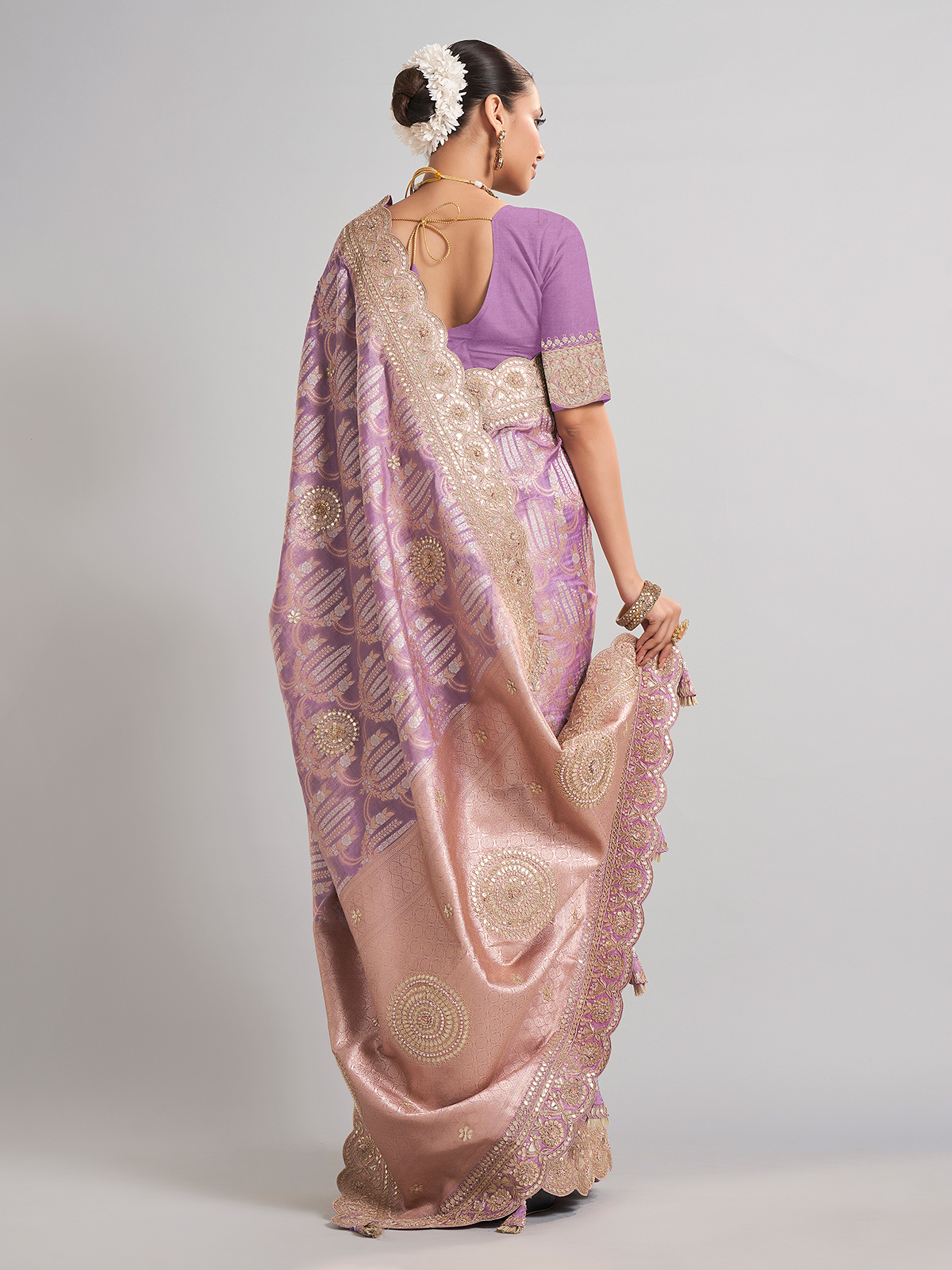 Radiating soft grandeur, this lavender purple banarasi silk saree features intricate zardosi, beads, and sequins. A refined choice for wedding receptions or bridal celebrations, with an unstitched blouse piece for a custom look.