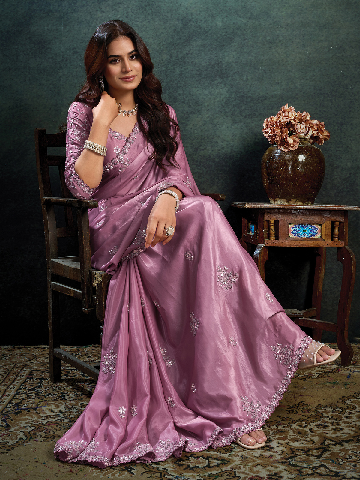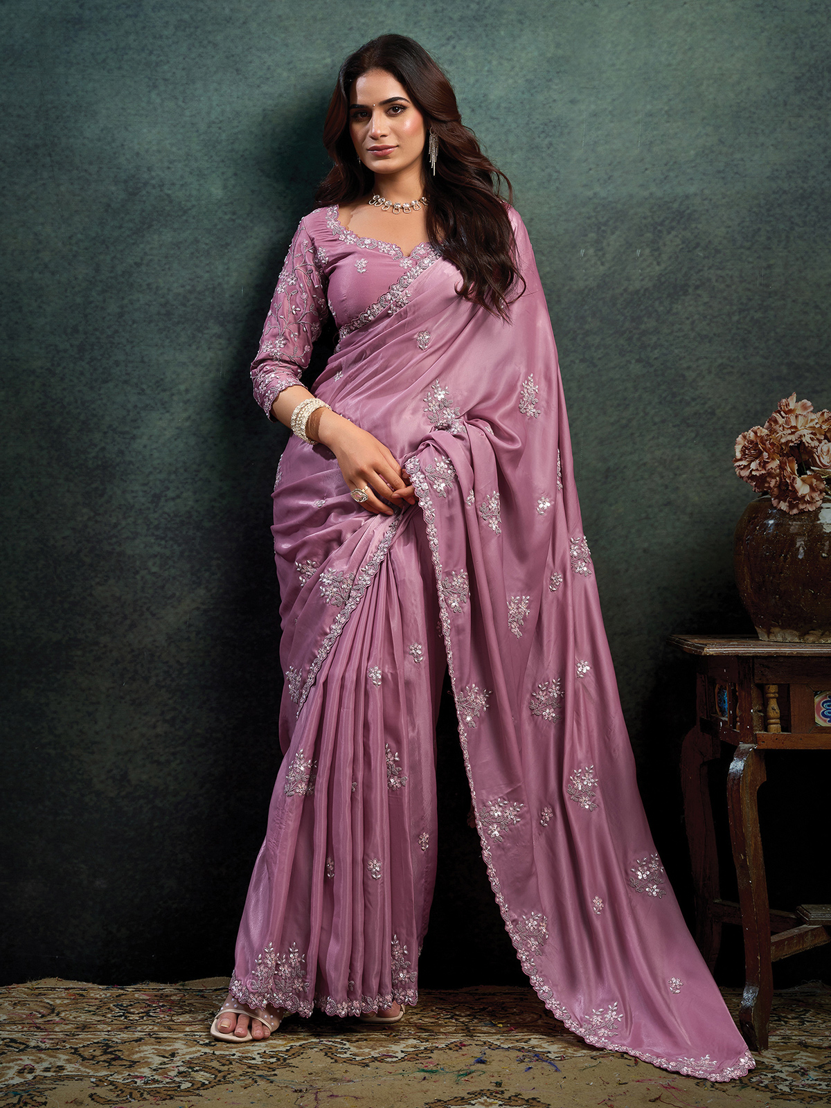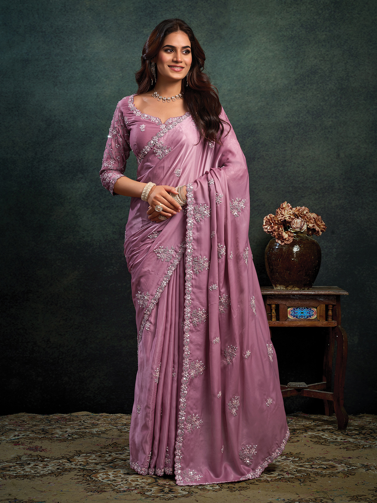This lavender purple soft satin silk saree is adorned with embroidery, sequins, pearls and stone detailing for elegant festive shimmer. The fluid texture enhances its graceful silhouette. Paired with an unstitched blouse piece, it is perfect for weddings, receptions, festive occasions and sangeet celebrations.