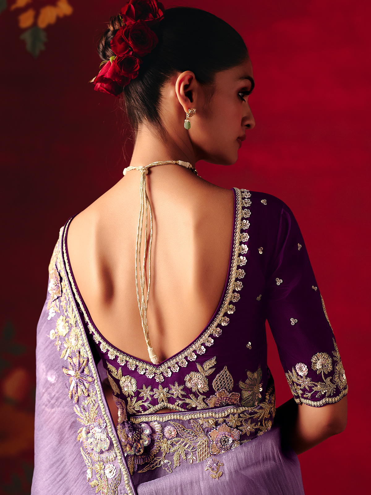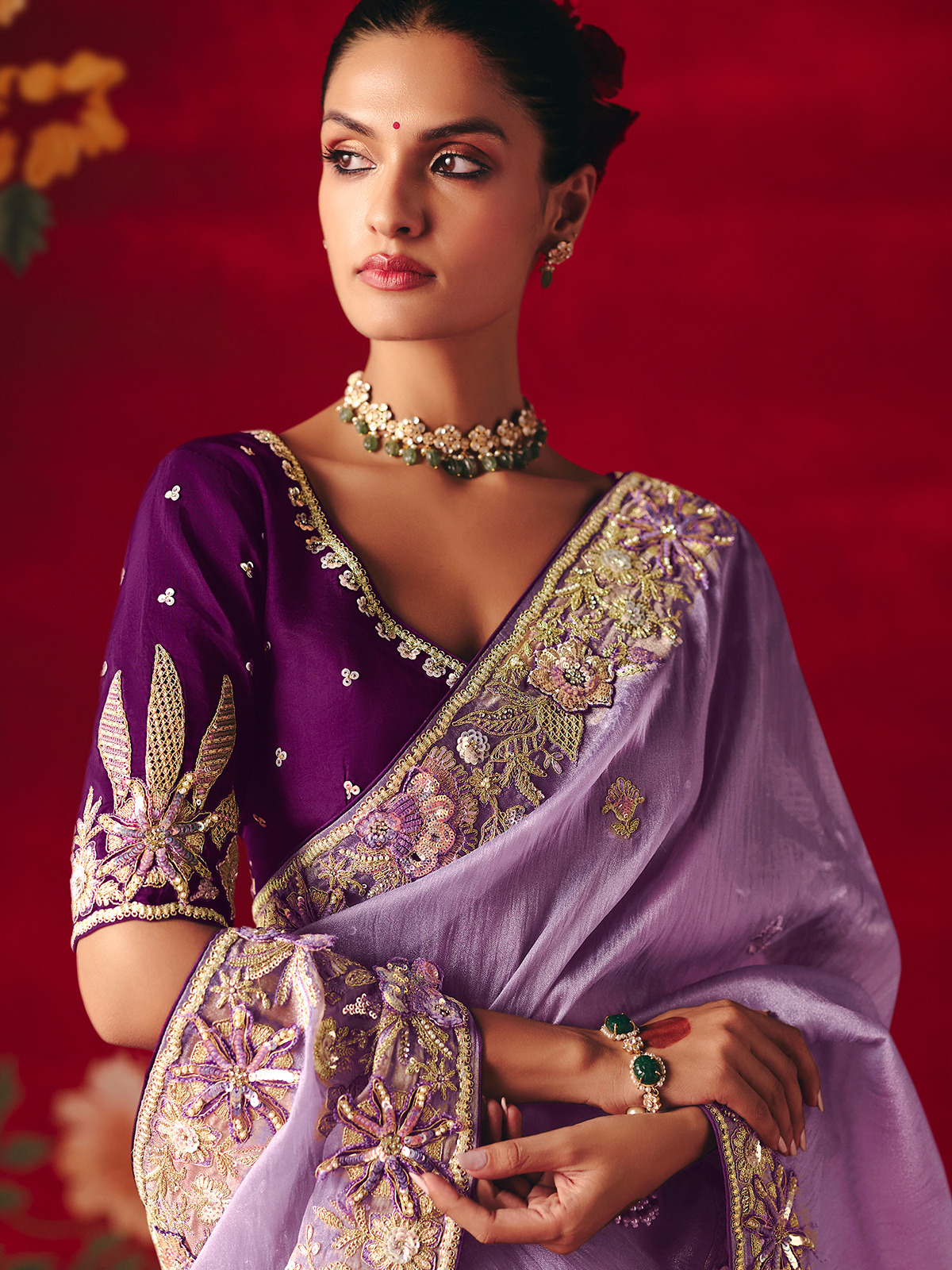 This dreamy lavender purple tissue organza saree is adorned with rich embroidery accented by sequins, pearls, stone and resham work. Comes with an unstitched blouse piece, making it a graceful choice for weddings, festive wear and receptions.