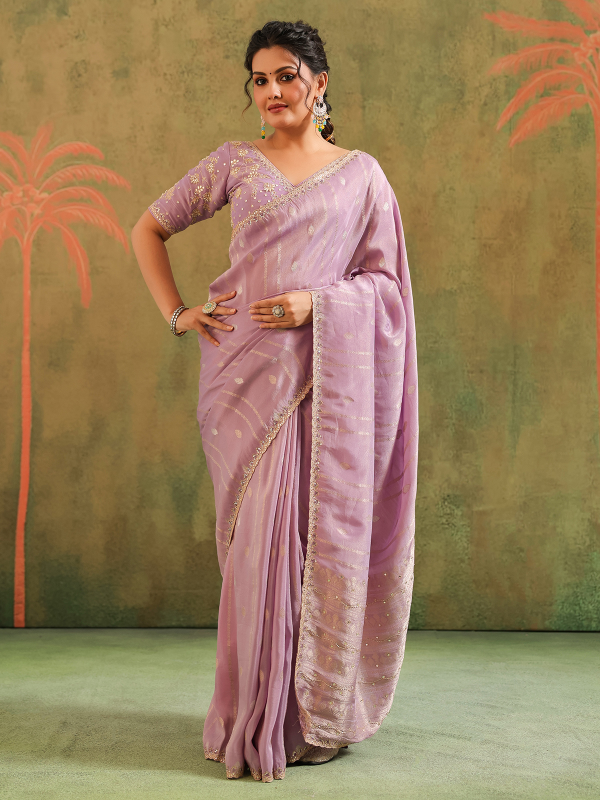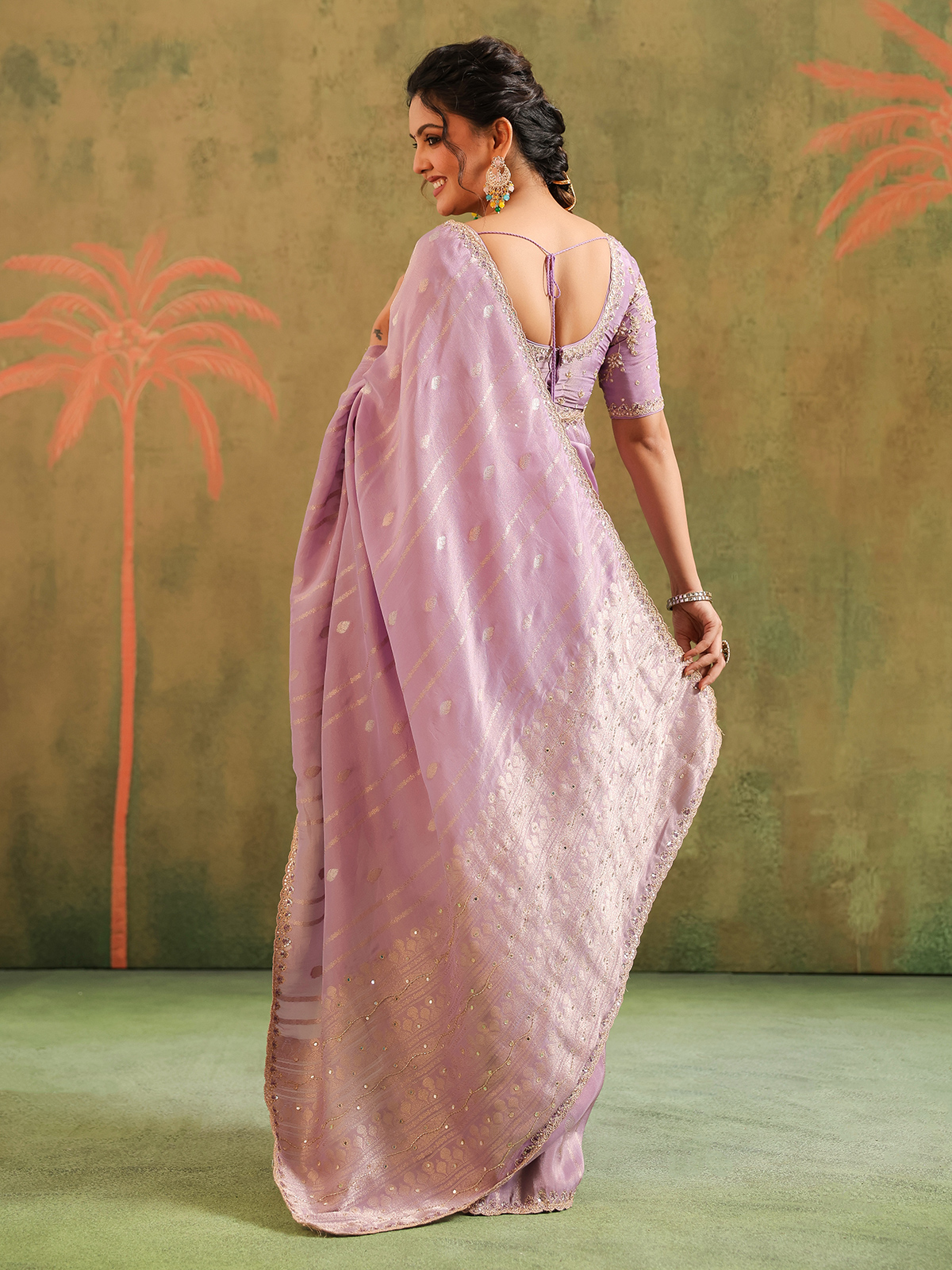 Wrapped in lavender silk, the saree radiates timeless beauty. Aabla, zari, cutdana, sequins, beads, and thread glimmer like constellations against twilight, merging artistry with tradition. Teamed with an unstitched blouse piece, it becomes an enchanting ensemble, ideal for festive evenings that celebrate joy, refinement, and heritage.