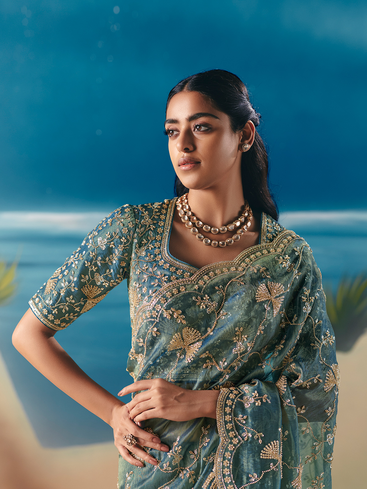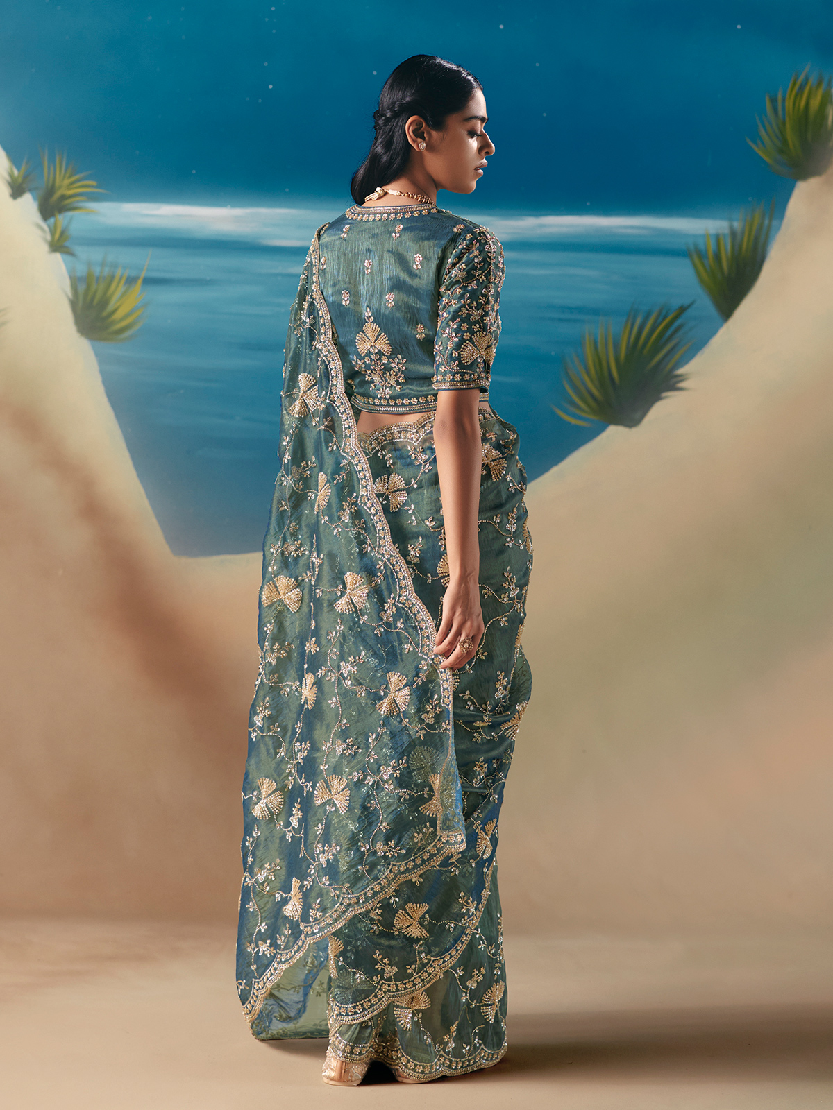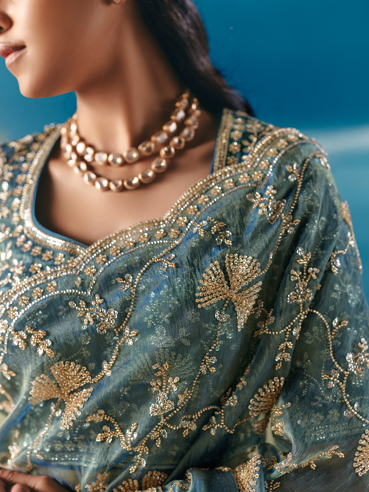 Draped in light blue satin organza, this saree glows with sequins, cutdana, beads and stone embellishments. Soft, airy and elegant, it comes with an unstitched blouse for customization. A charming choice for weddings, receptions and evening celebrations where serene colour meets luminous festive detailing.