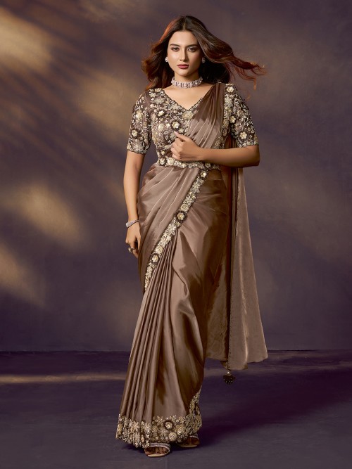 Light Brown Satin Silk Saree With Embroidered Grace