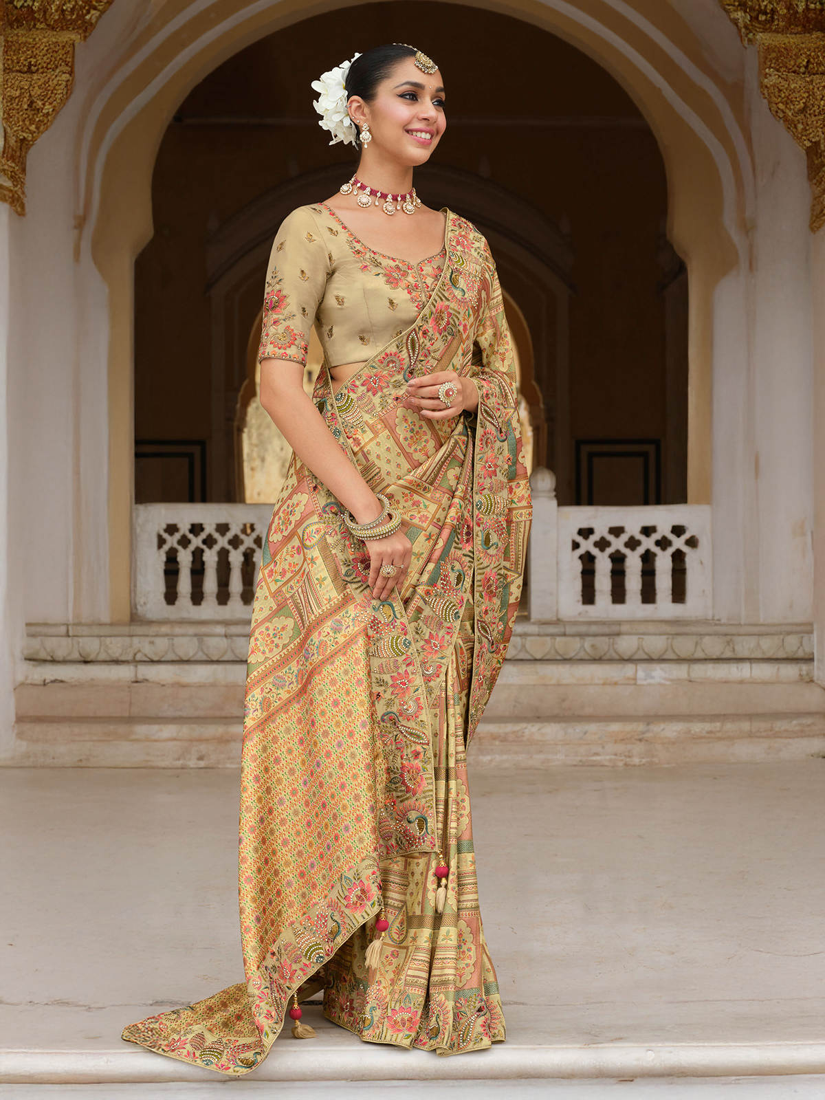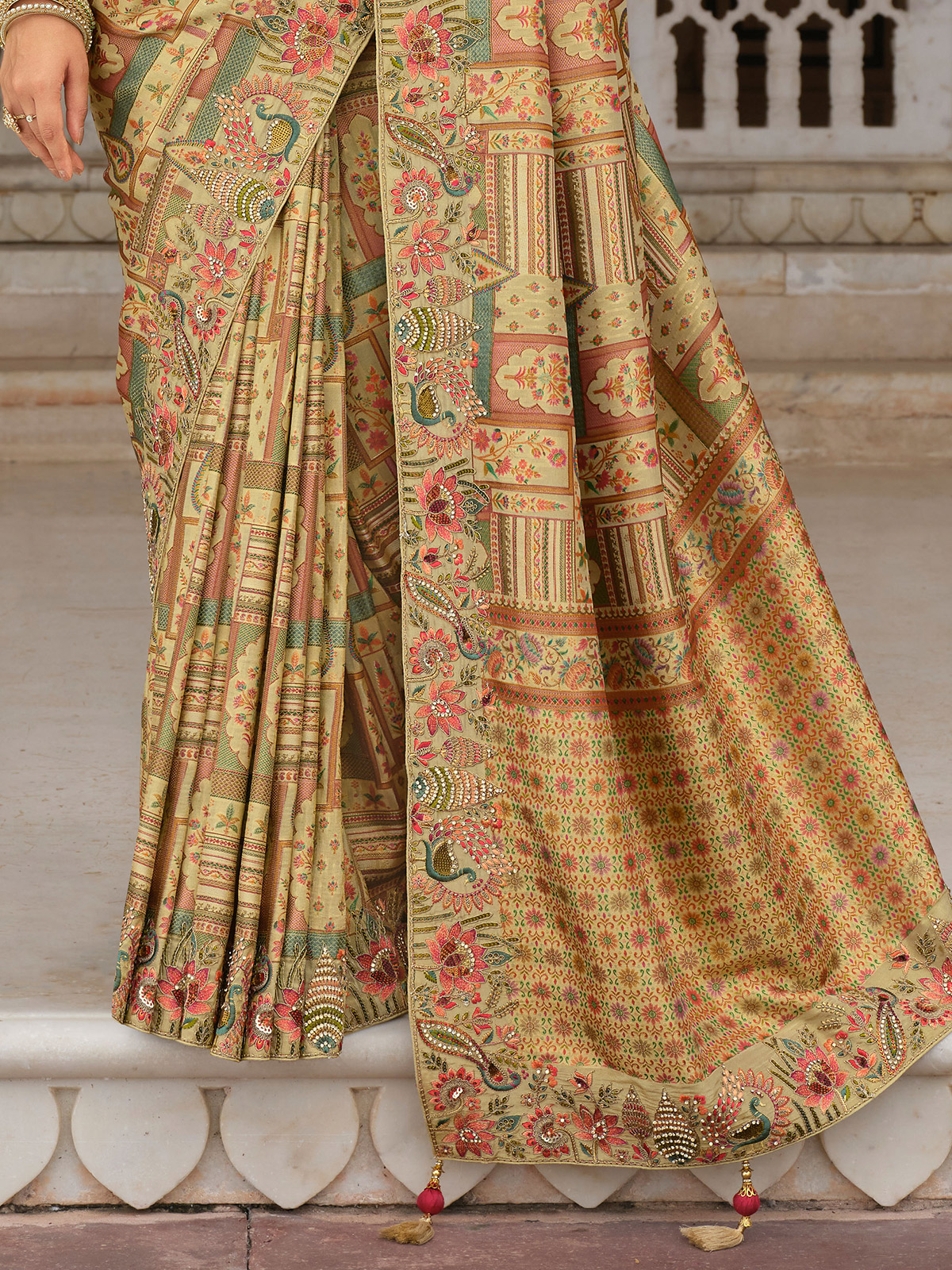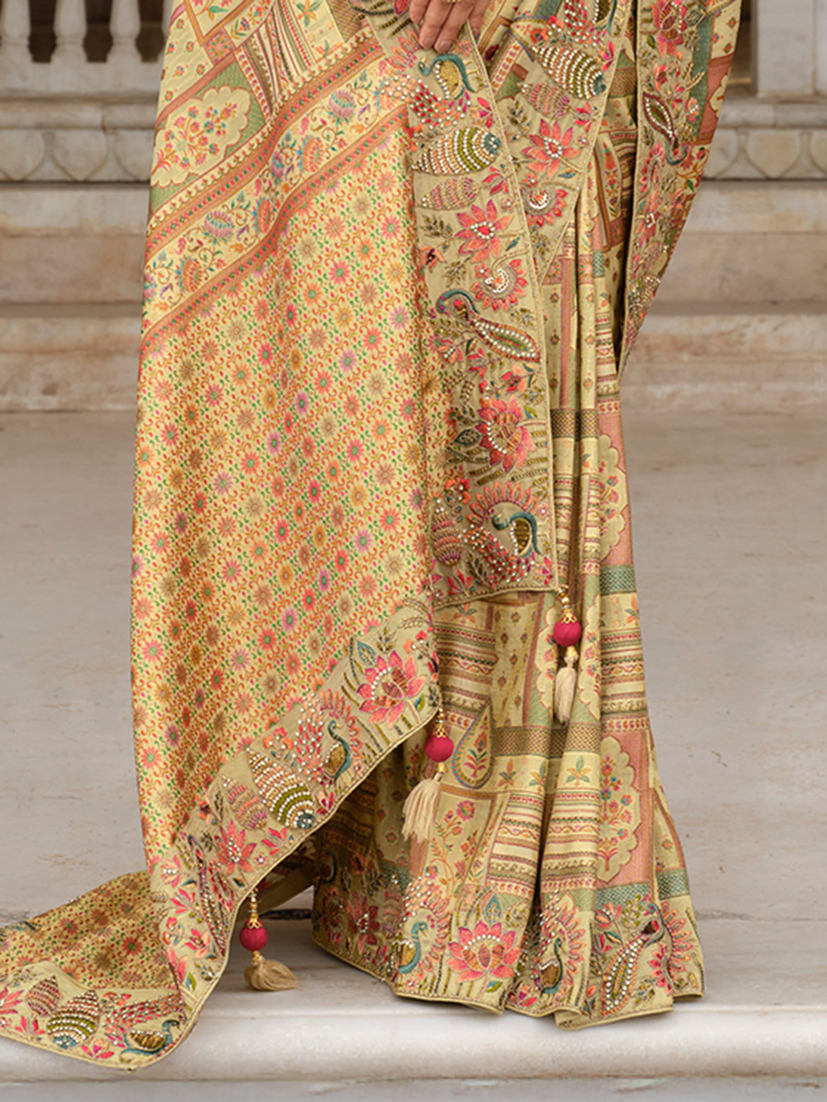 Highlighted by fresh green tones, this light green silk saree is decorated with khatli work enriched by sequins, zardosi, embroidery and stone detailing. The printed finish enhances its charm for mehendi events, weddings and receptions, finished with an unstitched blouse.