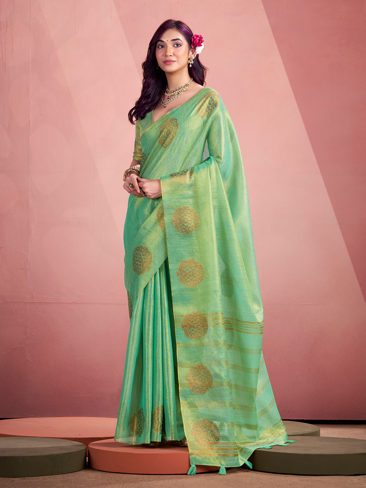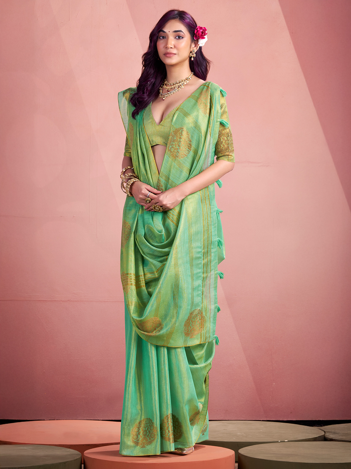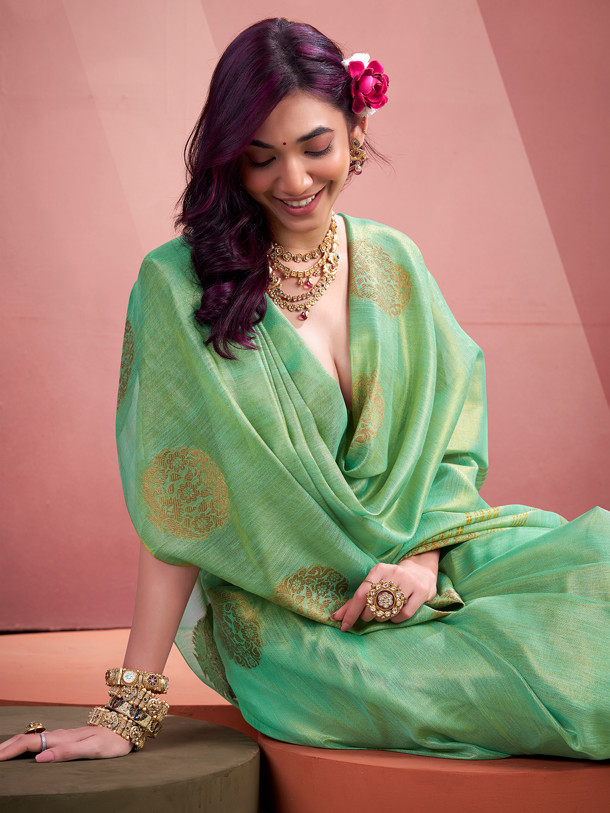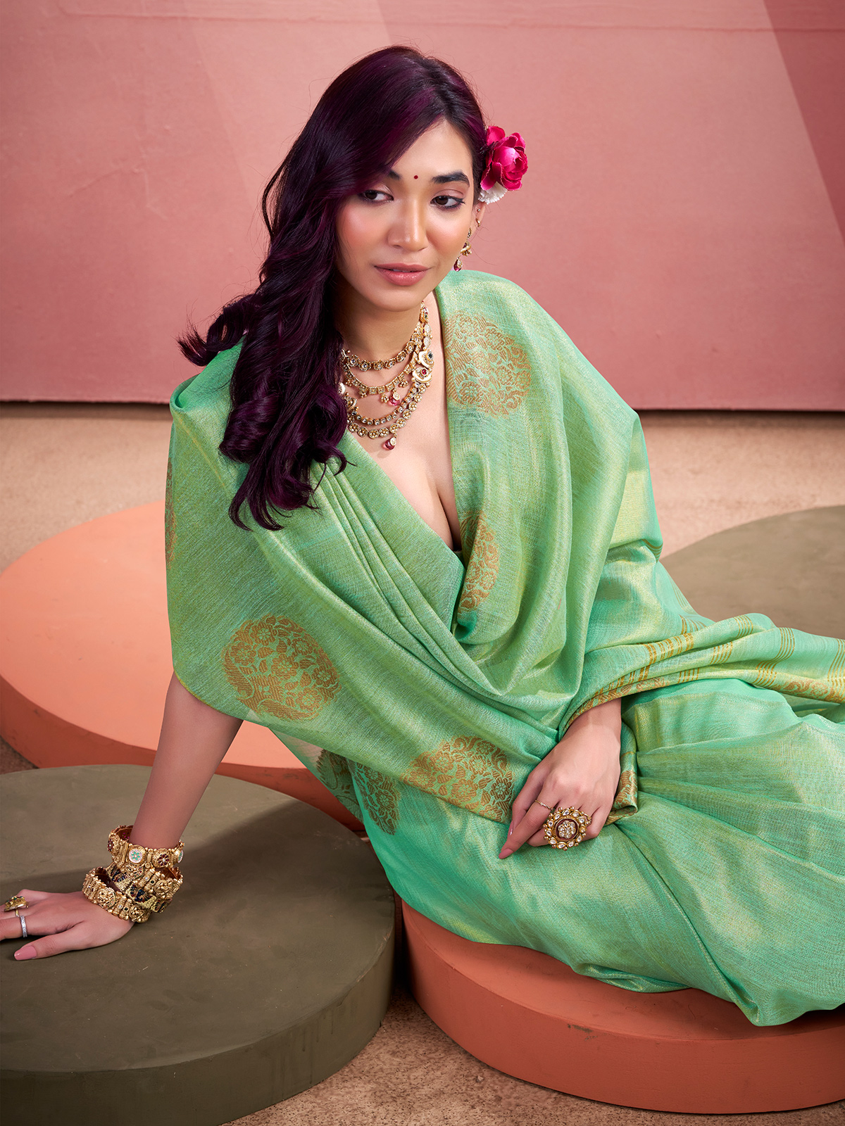 Step into the limelight in this soft light green saree, crafted from luxurious tissue silk and enriched with ornate zari accents. Whether for a wedding or a festive evening, this saree delivers poise and charm. Complete with an unstitched blouse piece for your perfect fit.