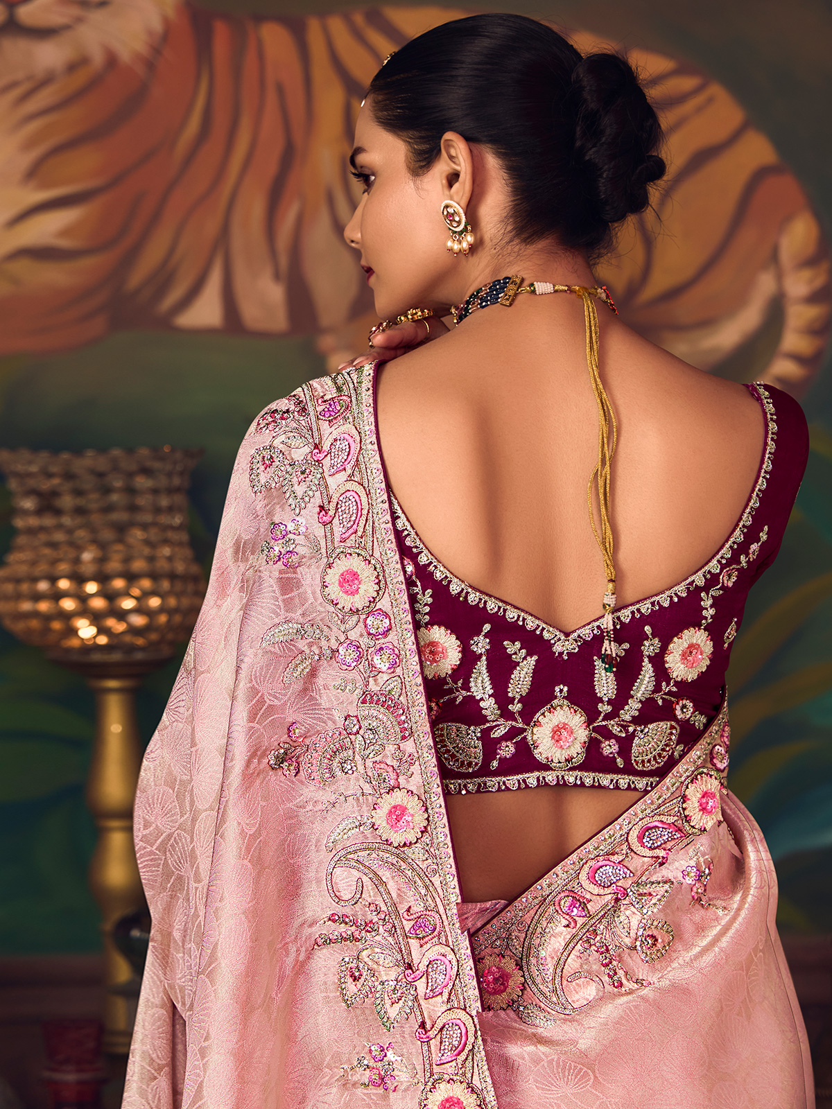 This light pink silk saree is adorned with refined embroidery highlighted by sequins, pearls, diamond accents and zari work. Completed with a contrast unstitched blouse piece, it offers a delicate yet festive look for weddings and reception celebrations.