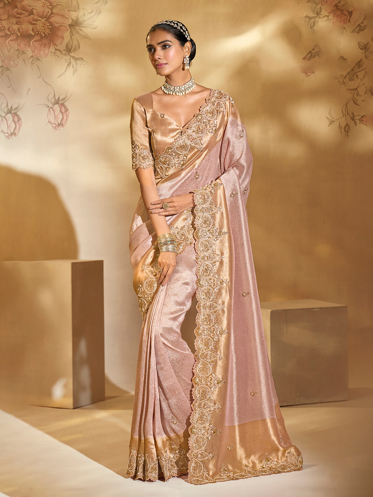 Light pink silk unfolds like a gentle blush at sunrise, glowing with serene charm. Resham, beads, sequins, cutdana, zari, and embroidery shimmer like a constellation across its drape, adding sparkle to every fold. Styled with an unstitched blouse piece, this saree is crafted for weddings and festivals, where softness meets celebratory radiance.