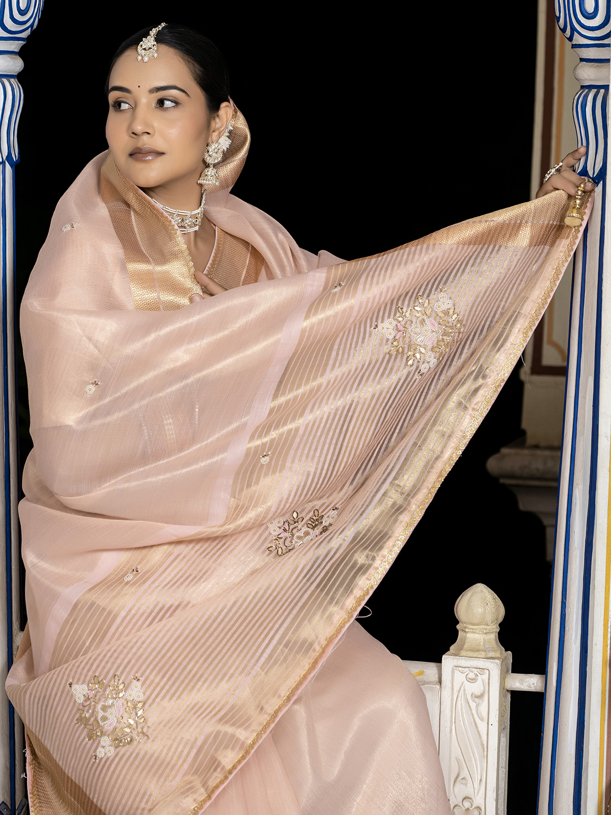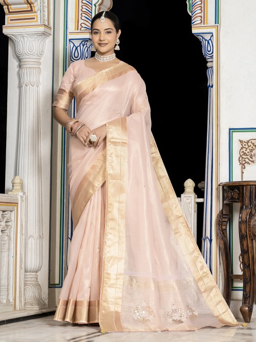 Delicate and dazzling, this light pink tissue silk saree features exquisite zari, gota patti, cutdana, bead, and sequin embellishments. Its airy texture and subtle shine make it a graceful pick for festive gatherings or parties. Comes with an unstitched blouse for a tailored finish.