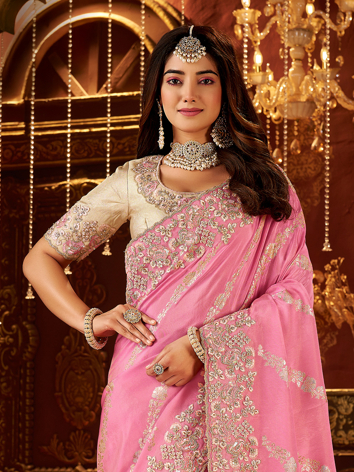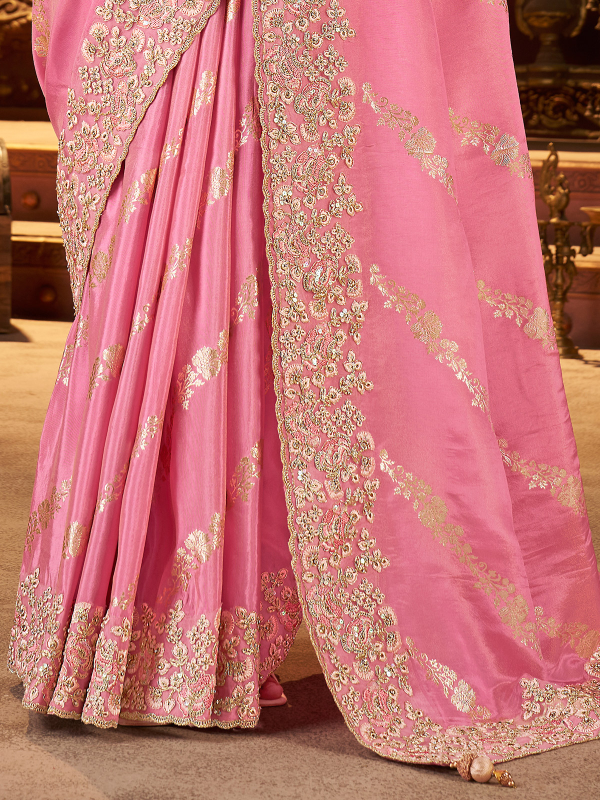 Designed in soft light pink soft silk, this saree features elegant embroidery with sequins, thread, stone, zardosi, and zari work. The contrast unstitched blouse piece adds refinement, making it suitable for weddings and festive celebrations.