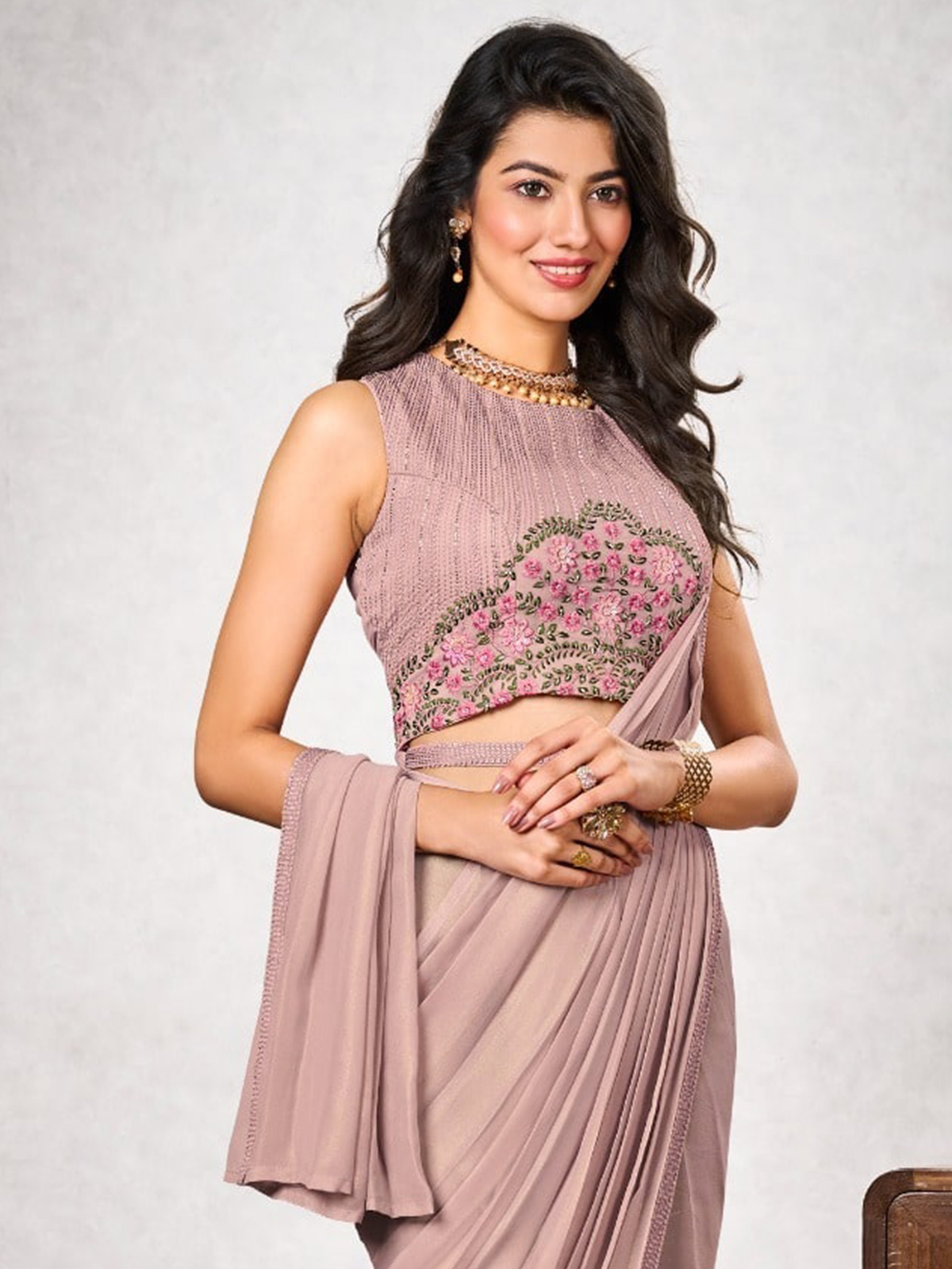 Achieve a full fledged wedding look in our light pink shimmer georgette ready to wear saree. Adorned with embroidery and sequins, it strikes the perfect balance between traditional glimmer and trendy sparkle. Comes with a ready made blouse.