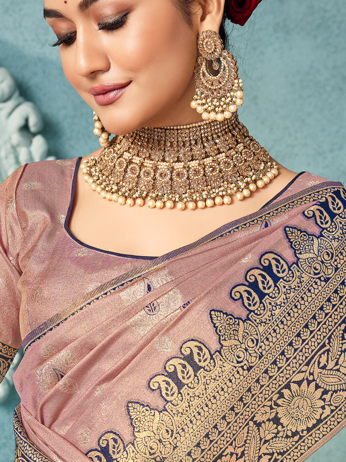 Designed in soft light purple silk, this saree showcases delicate zari work enhanced by a contrast border. Teamed with an unstitched blouse piece, it creates a graceful festive ensemble suited for weddings, traditional celebrations and elegant reception occasions.