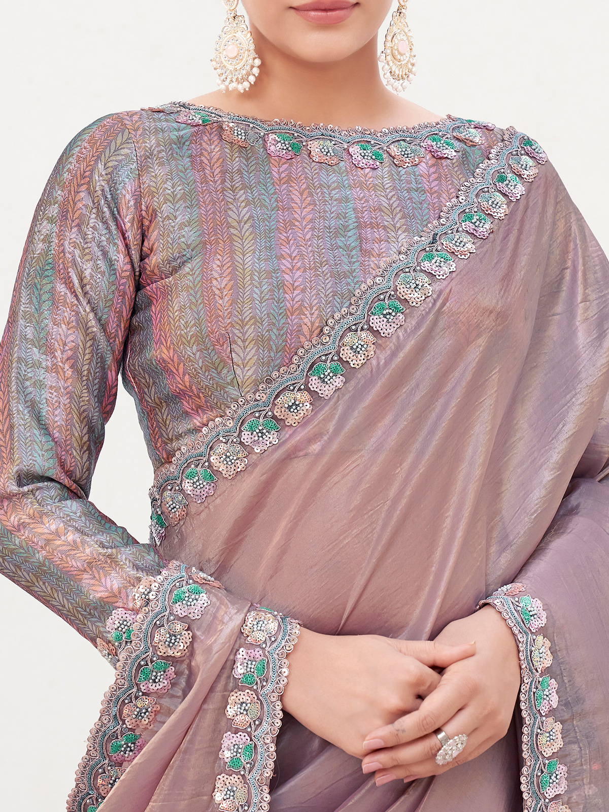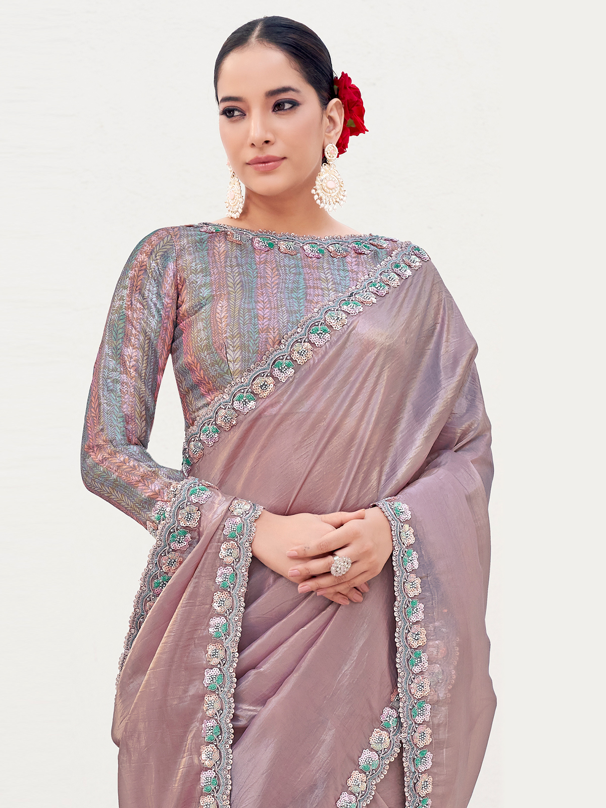 Wrapped in elegance, this light purple silk saree is highlighted with fine zardosi, sequin and bead embellishments. The fabric has a soft glow and smooth fall, perfect for festive gatherings or party events. It comes with an unstitched blouse, allowing you to tailor the look to your own style.