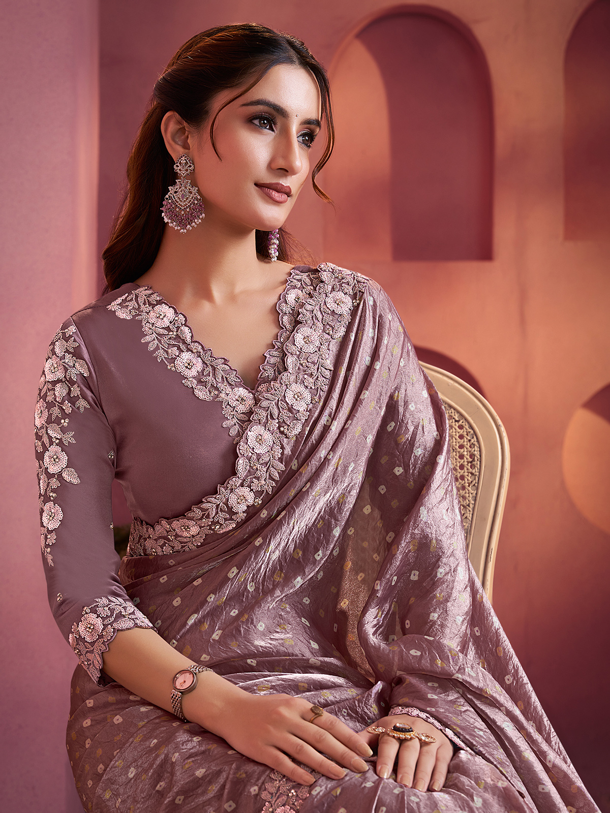 This light wine two-tone satin silk saree is adorned with elegant bandhani prints and shimmering thread, sequins, and diamond accents. The lustrous texture enhances its festive and wedding-ready charm. Includes an unstitched blouse piece.