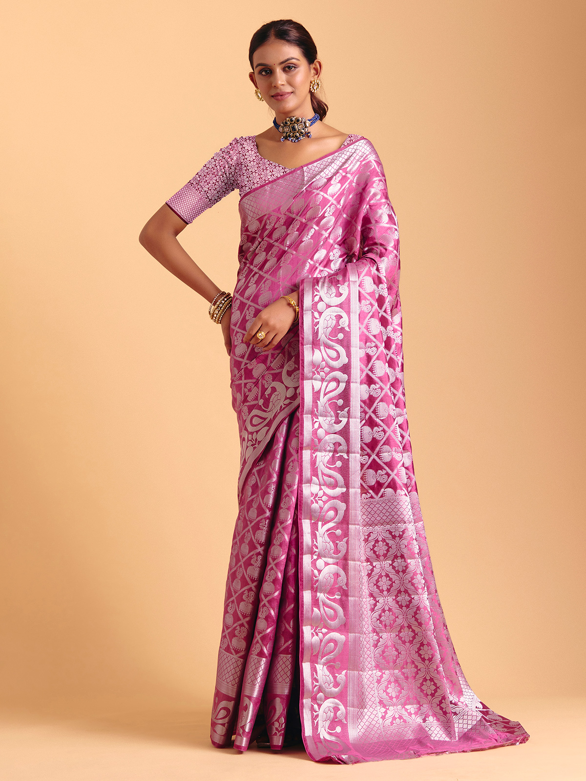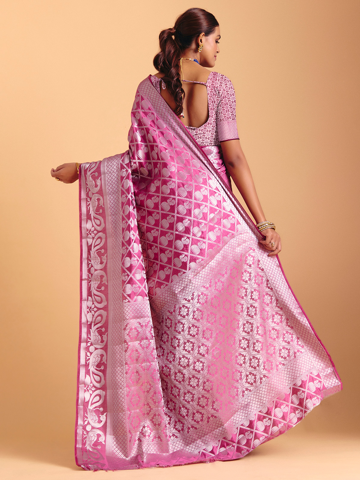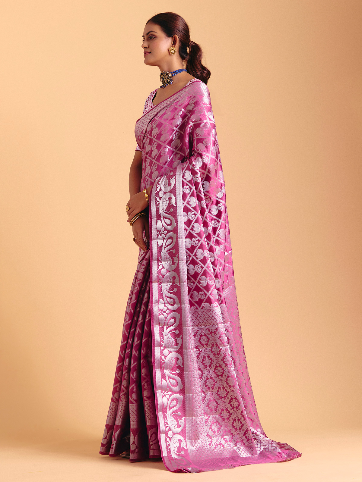 Wrapped in a serene light wine charm, this silk saree shimmers with gentle zari artistry that moves like soft light across the fabric. Its fluid drape brings effortless elegance to festive moments, completed beautifully with an unstitched blouse piece for custom styling.