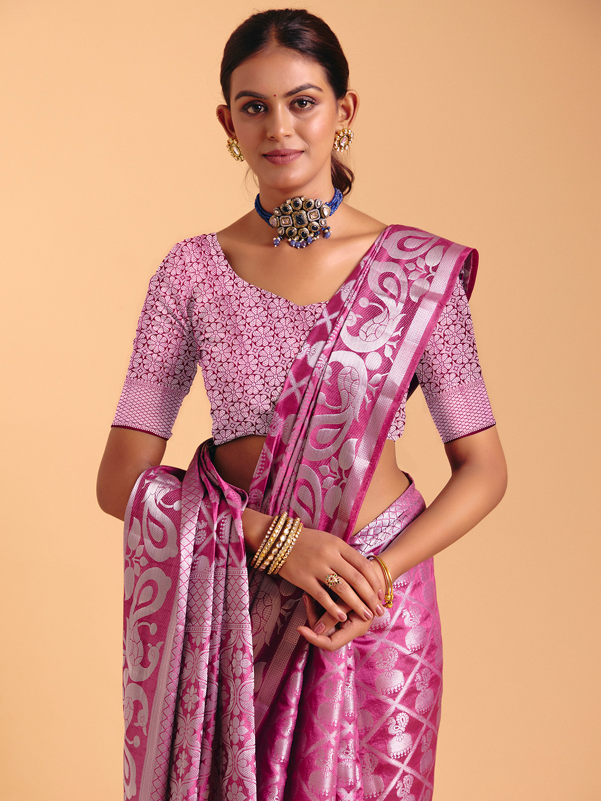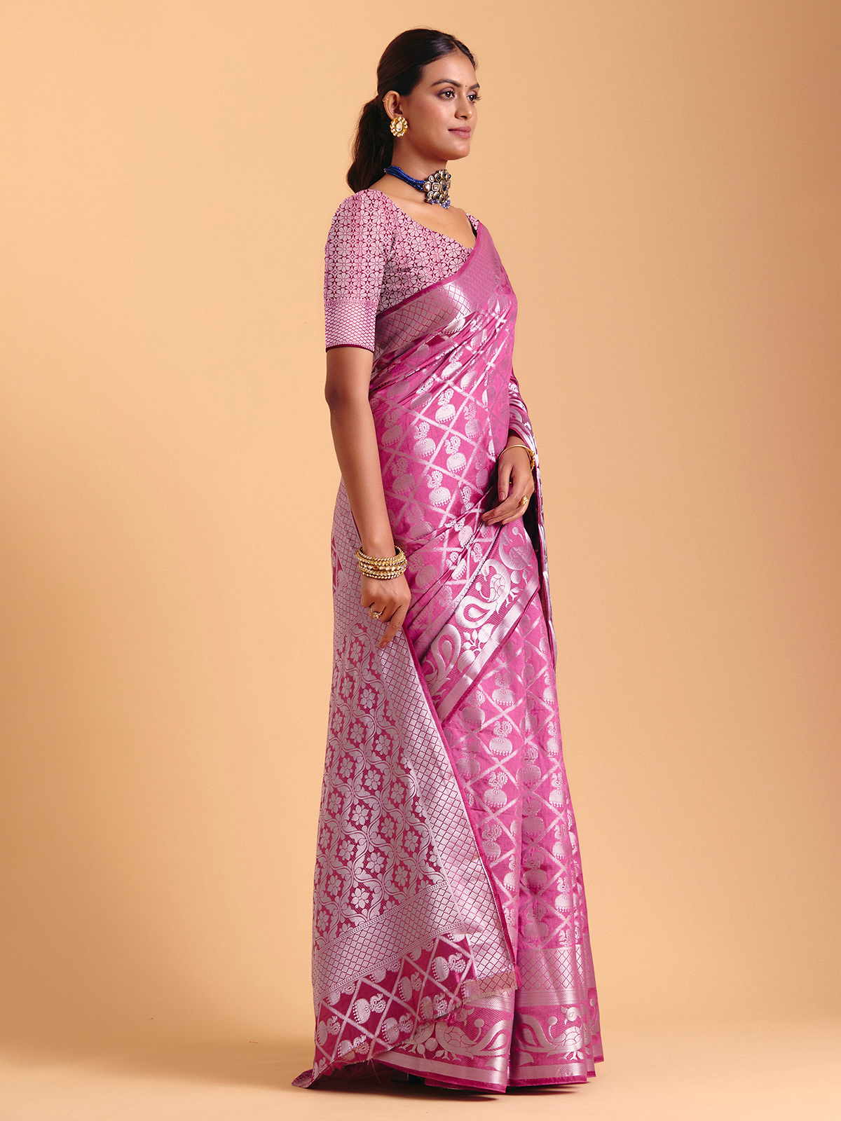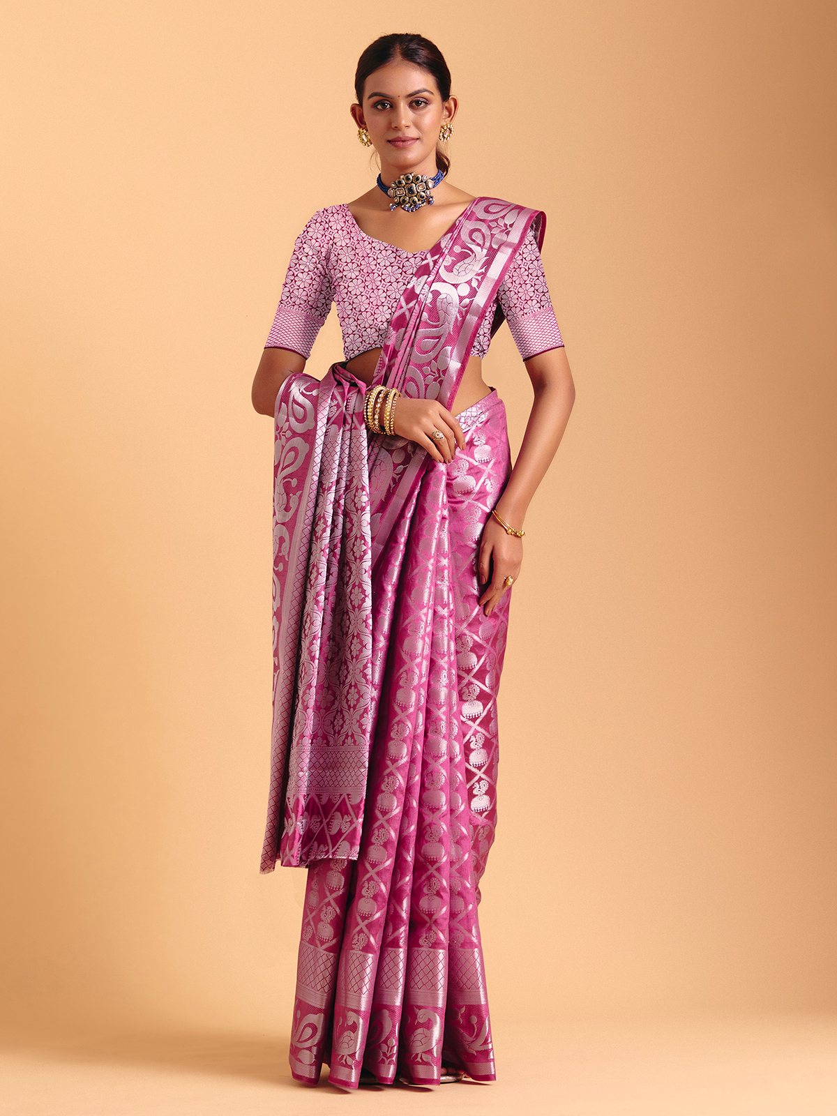 Wrapped in a serene light wine charm, this silk saree shimmers with gentle zari artistry that moves like soft light across the fabric. Its fluid drape brings effortless elegance to festive moments, completed beautifully with an unstitched blouse piece for custom styling.