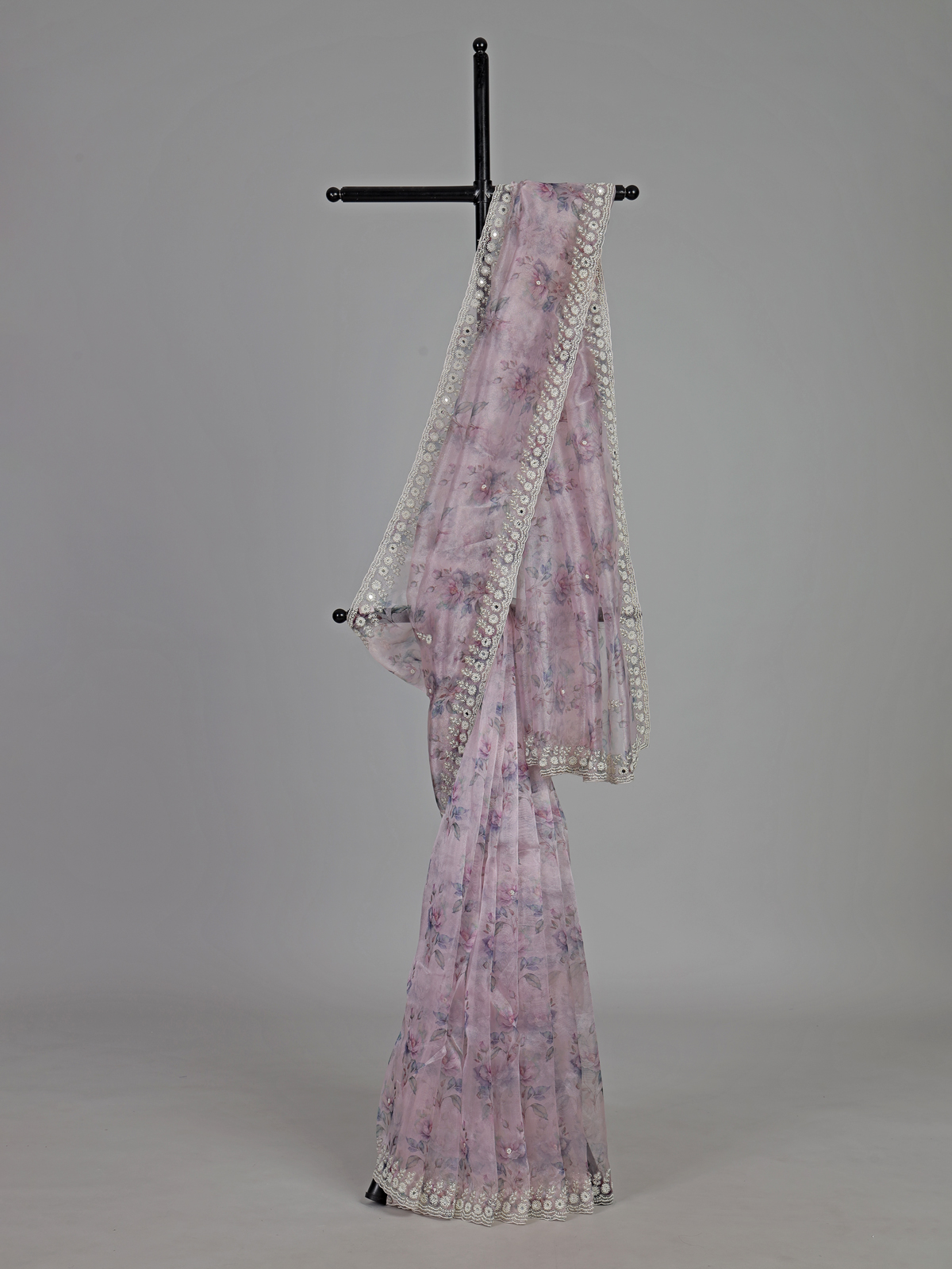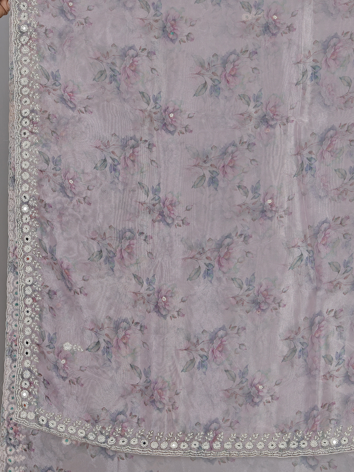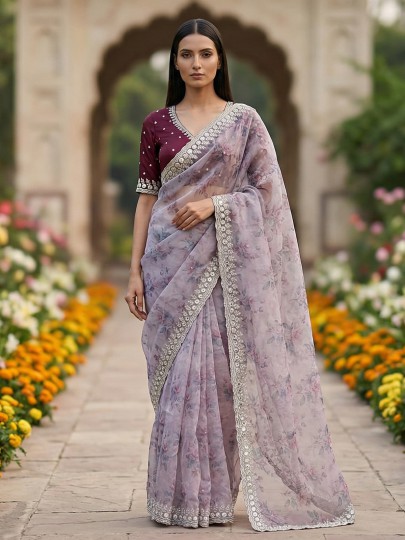 Lilac Purple Organza Tissue Mirror Work Festive Saree