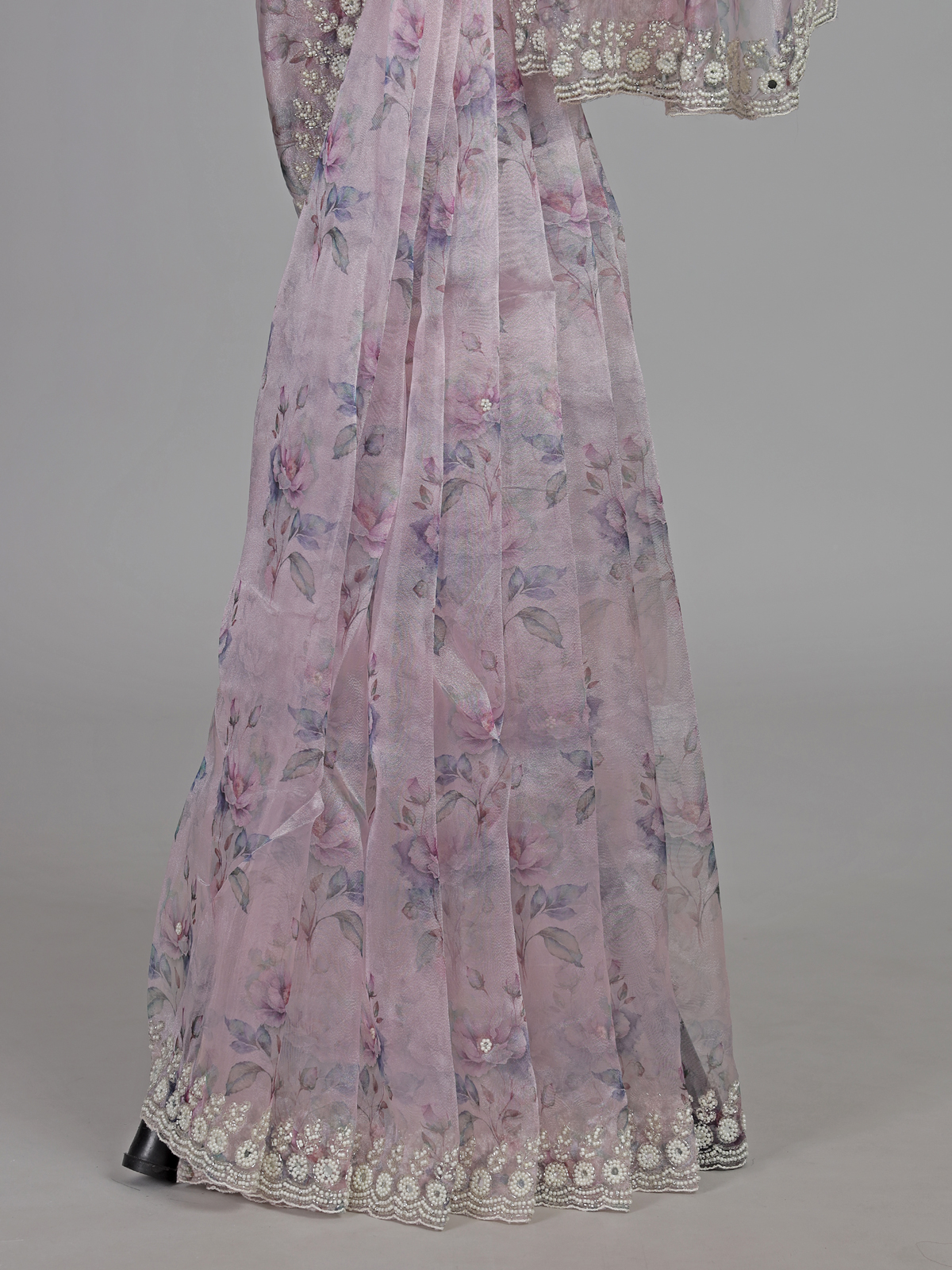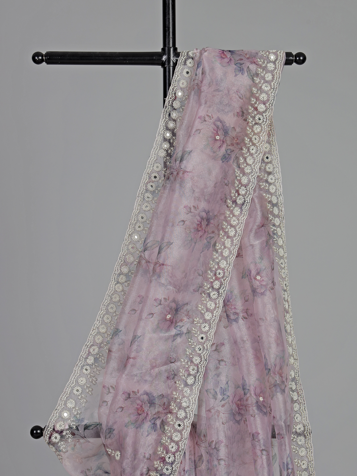 Delicate lilac purple shades define this organza tissue saree crafted with elegant floral prints. Adorned with cutdana, pearls and mirror work. It sparkles with festive charm. The crisp drape adds a graceful structure. Perfect for weddings, receptions and sangeet. It comes with an unstitched blouse piece for a complete and sophisticated ensemble.