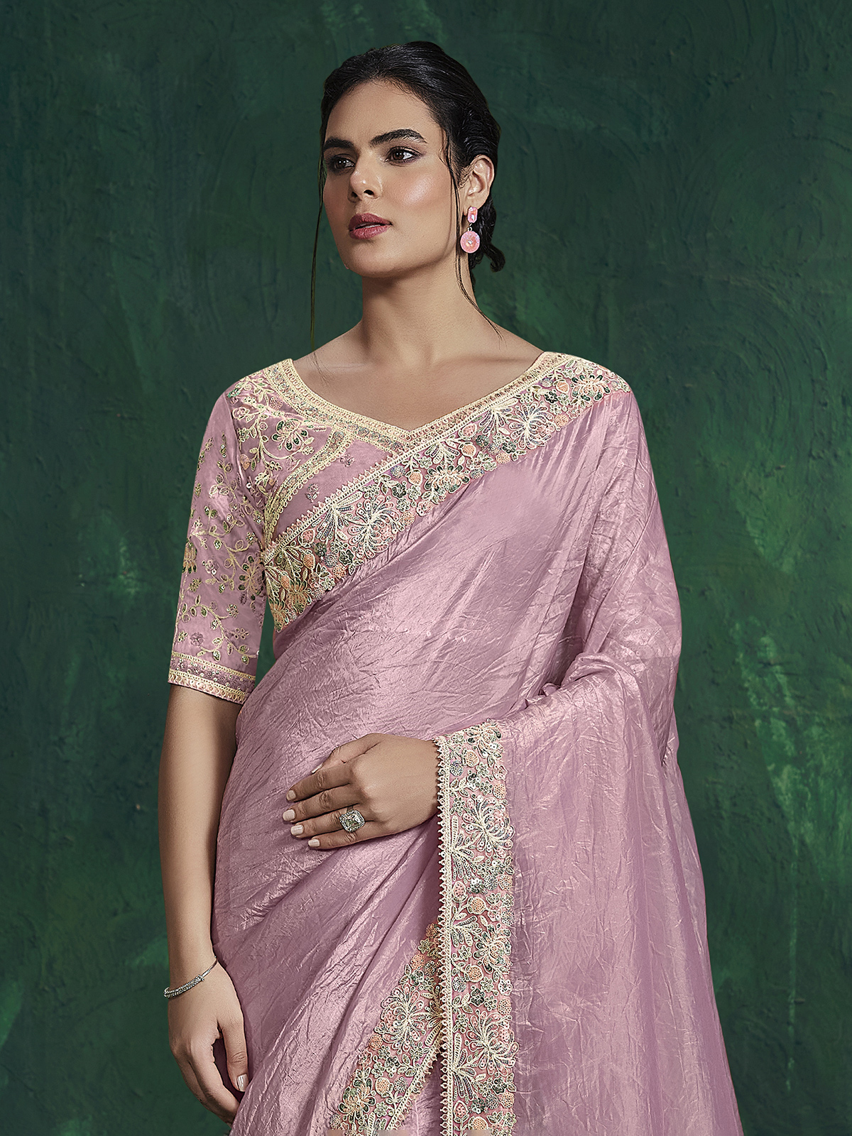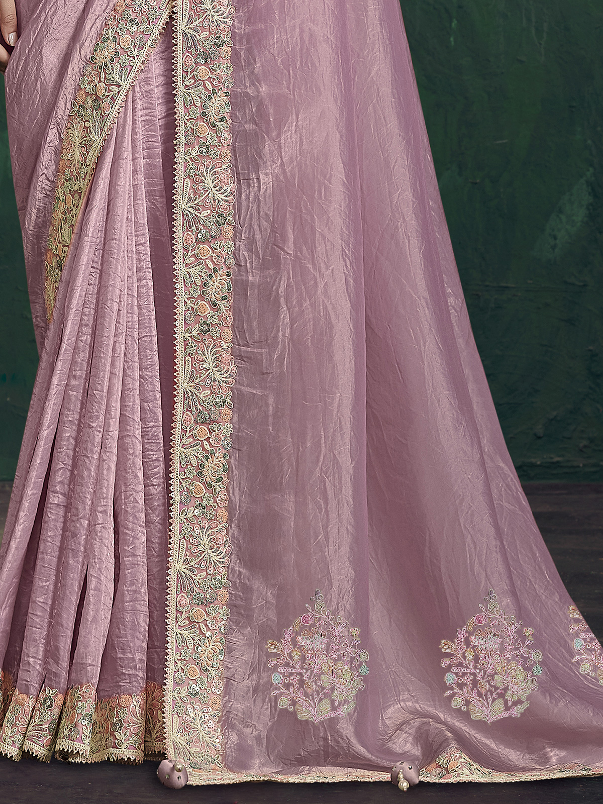 Crafted in soft lilac purple shimmer satin silk saree is adorned with embroidery and sequin work for graceful elegance. The smooth drape flatters beautifully. Paired with an unstitched blouse piece, it is perfect for weddings, receptions, festive occasions and sangeet evenings.