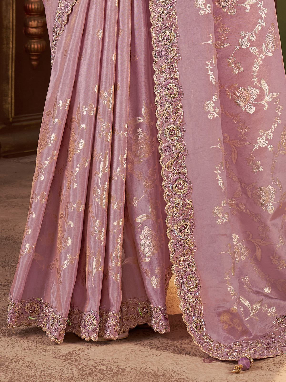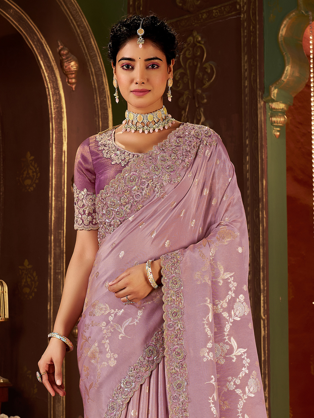 Crafted in lilac purple soft silk saree. Features elegant embroidery with sequins, thread, stone, zardosi and zari work. Teamed with an unstitched blouse piece, it suits weddings and festive celebrations beautifully.