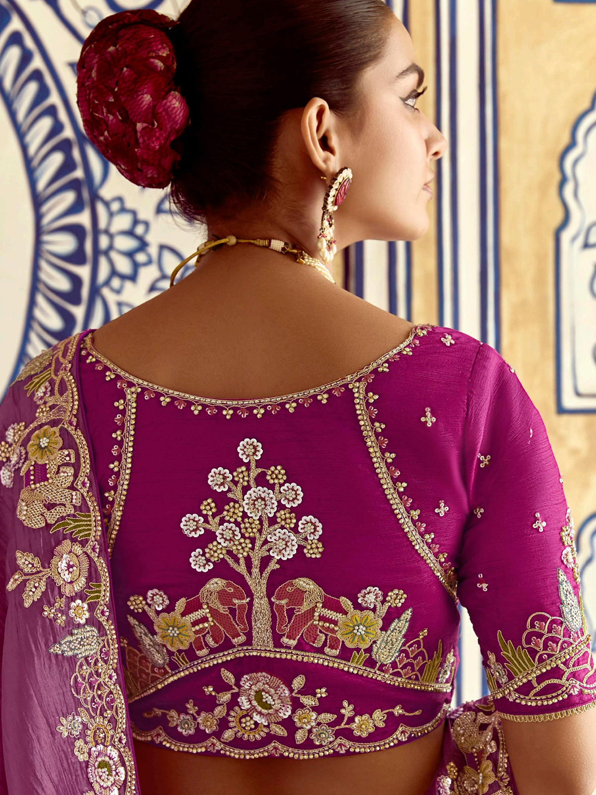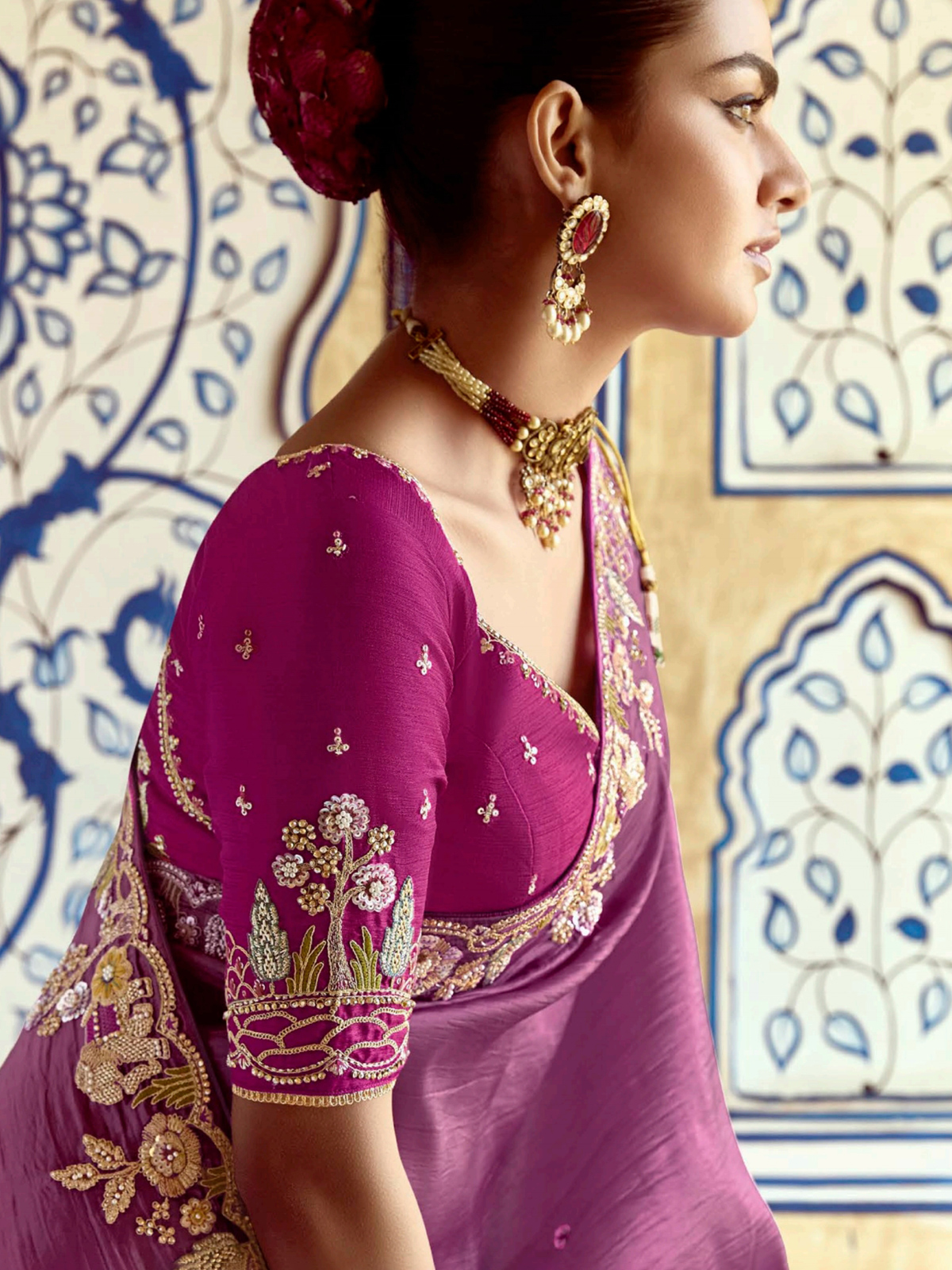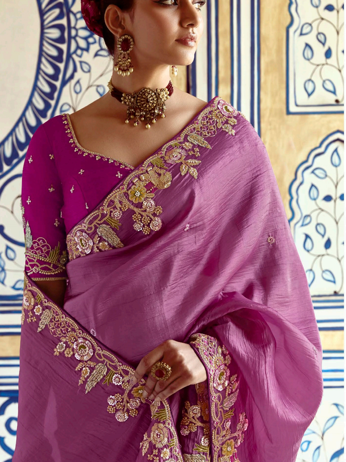 Lilac Purple Tissue Silk Saree With Resham And Bead Work