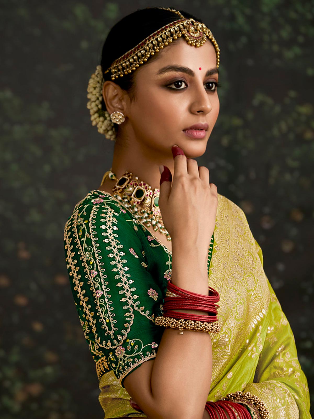 Balancing comfort and elegance seamlessly, this lime green dola silk saree is adorned with unique sequins and zari embroidery. Comes with a coordinating blouse piece.