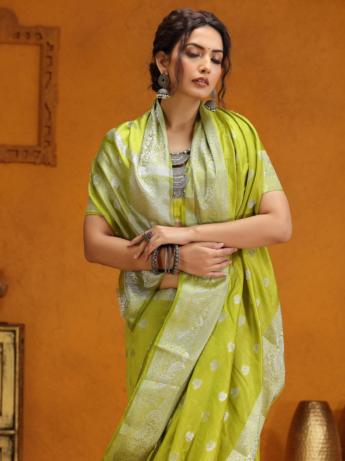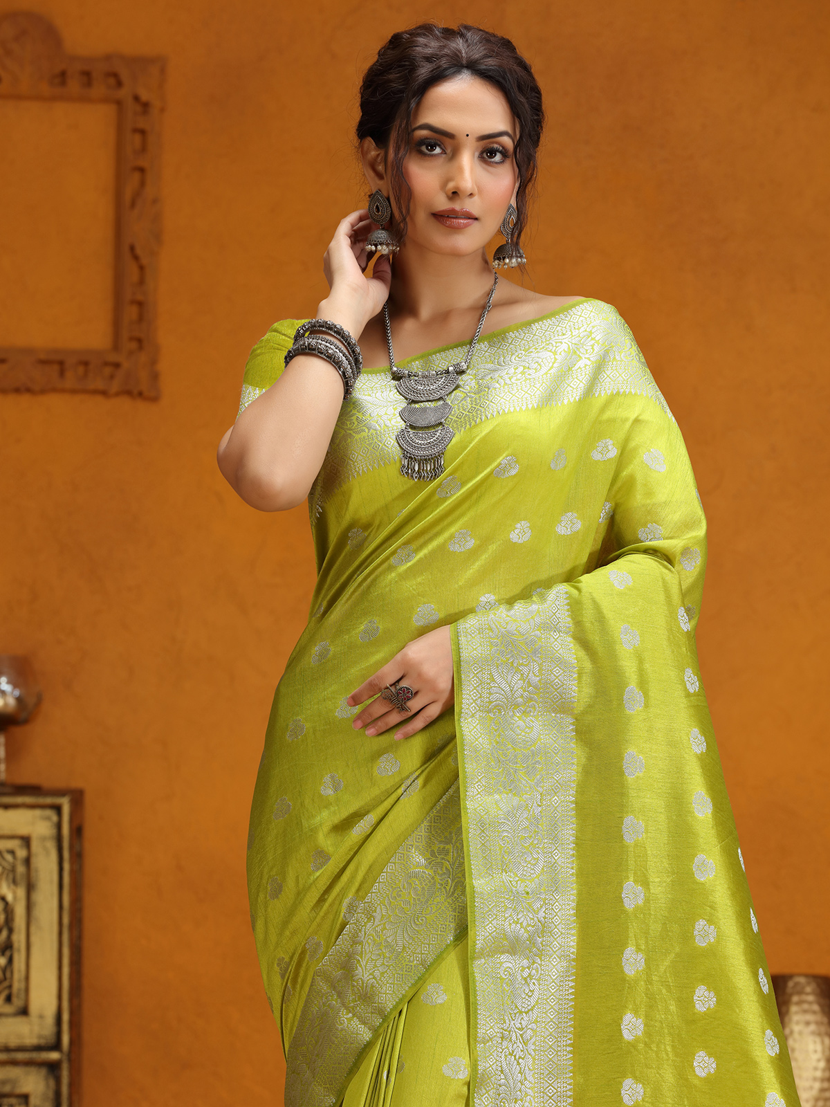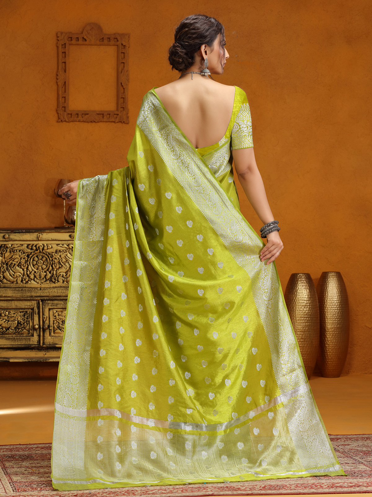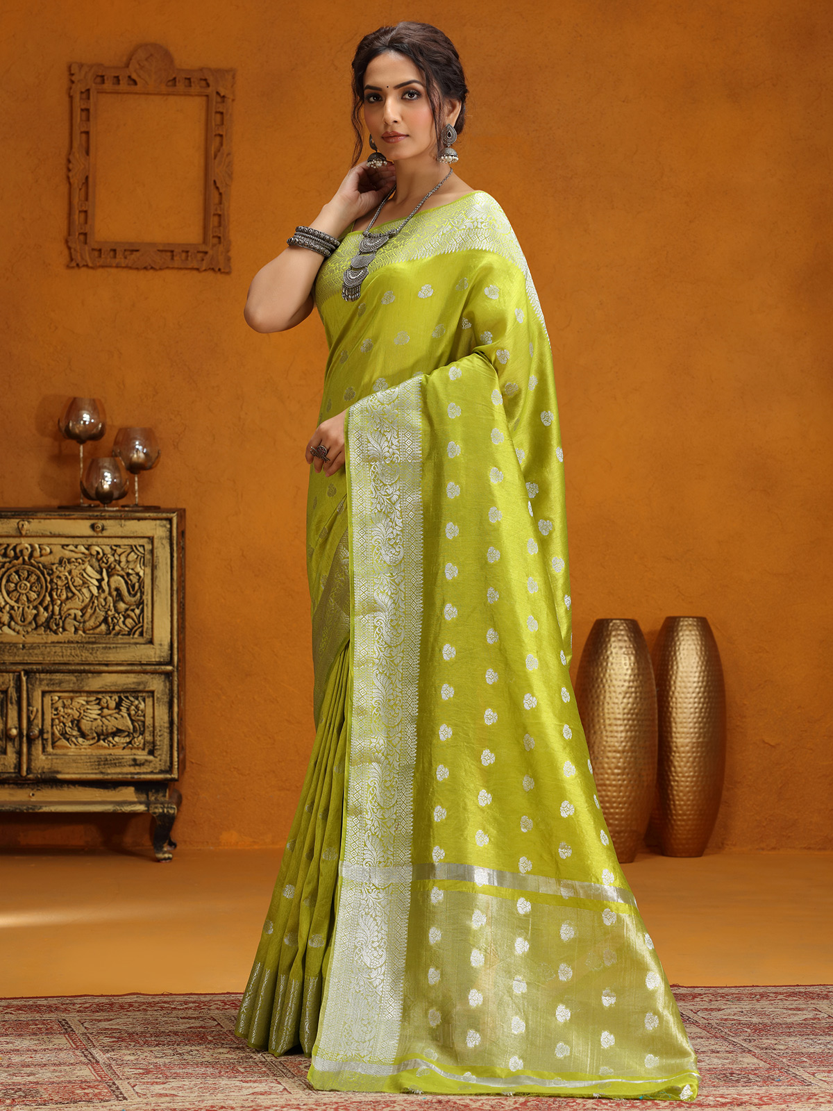 Lime Green Silk Saree With Silver Zari Weaving