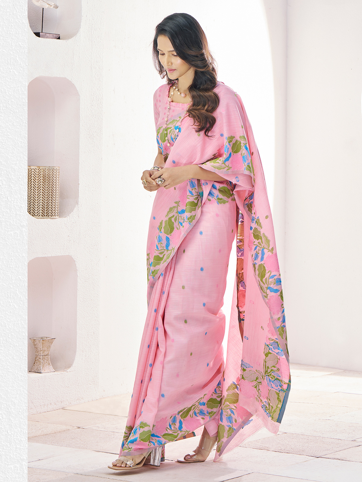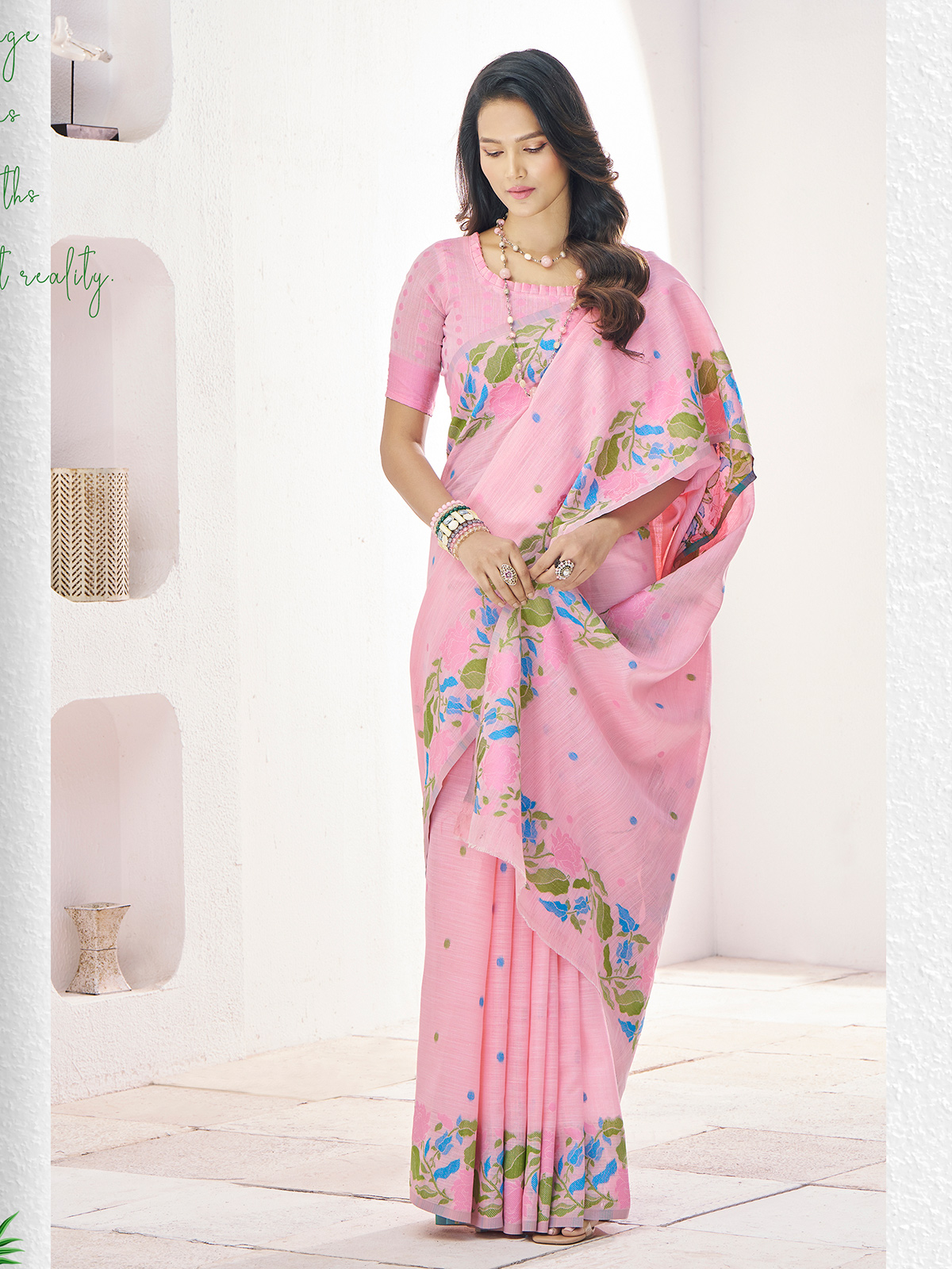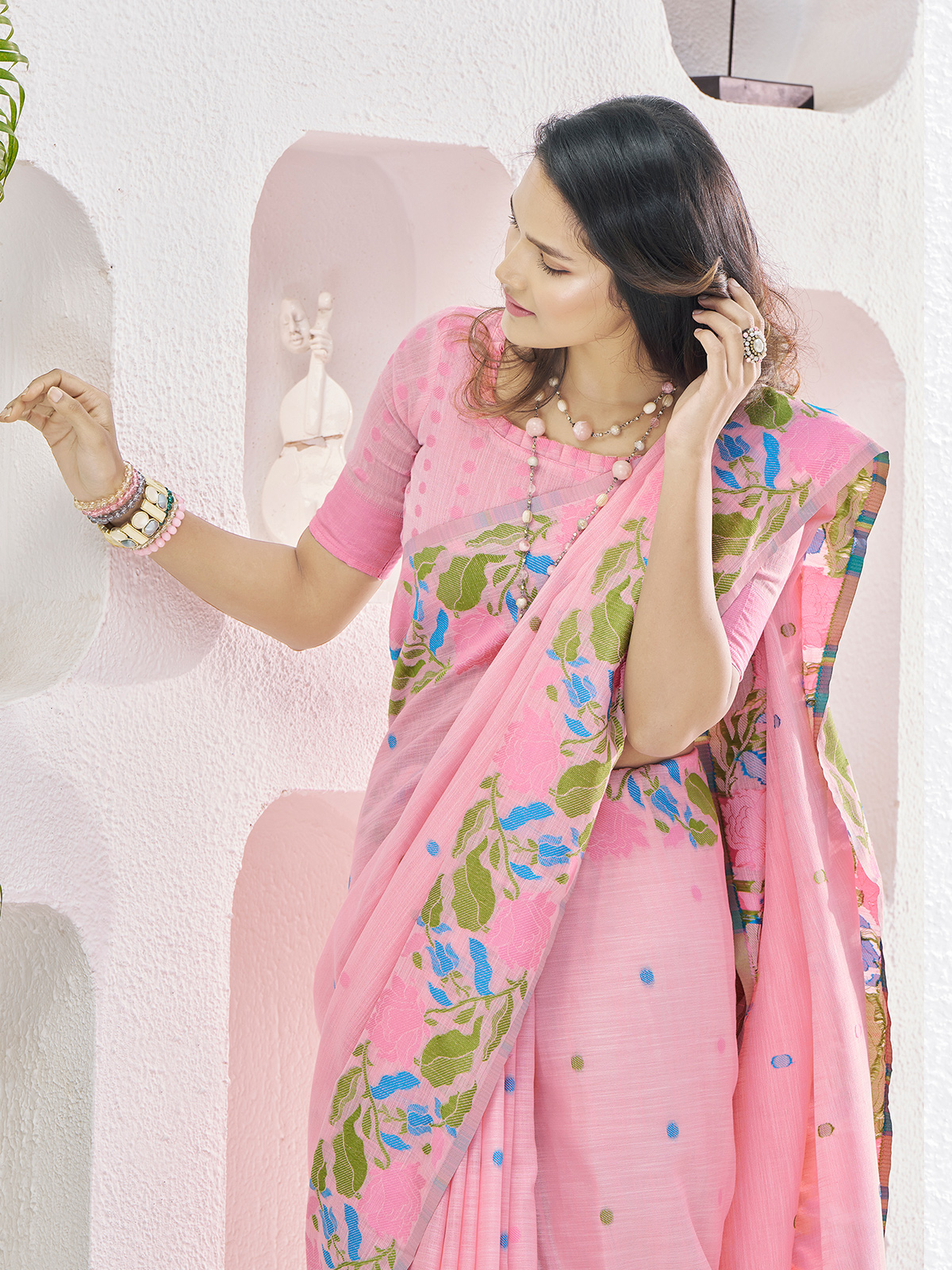 Celebrate tradition in this soft linen pink saree, blending comfort and style. The colorful thread weaving brings out a lively, festive touch, perfect for family events or cultural celebrations. Plus, it includes an unstitched blouse piece to create your desired fit.