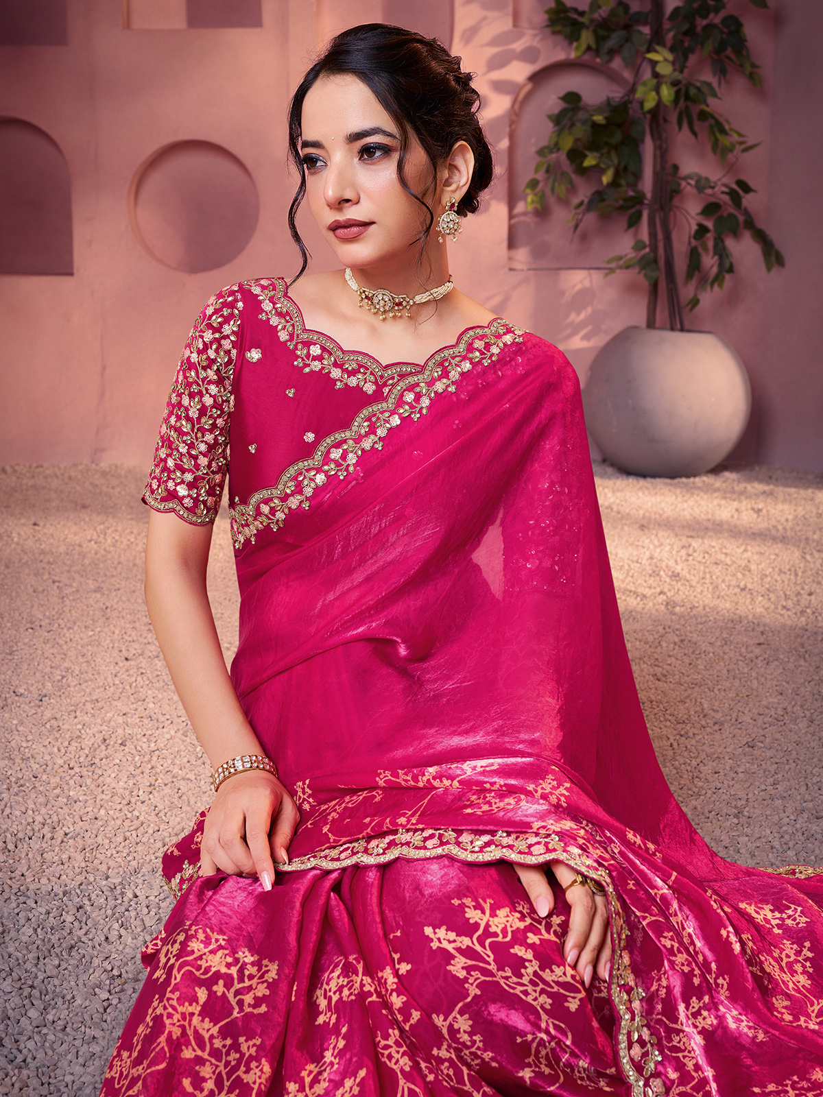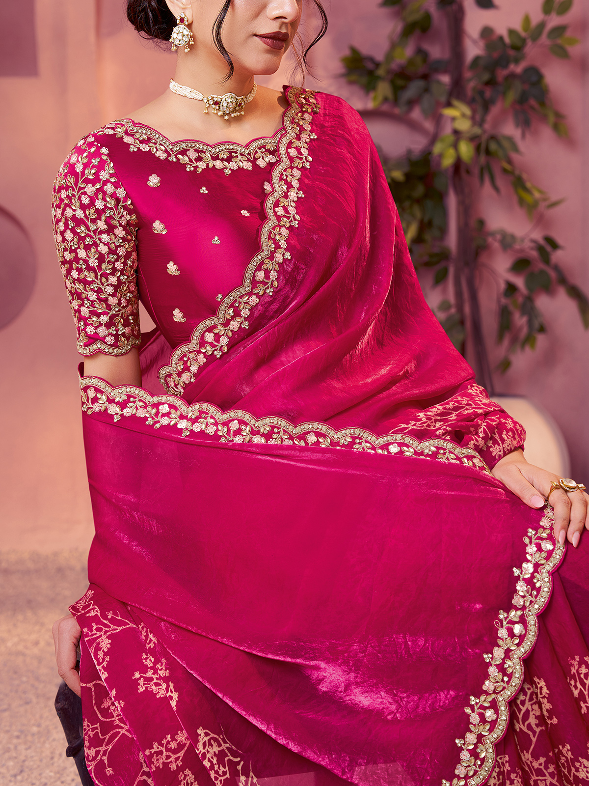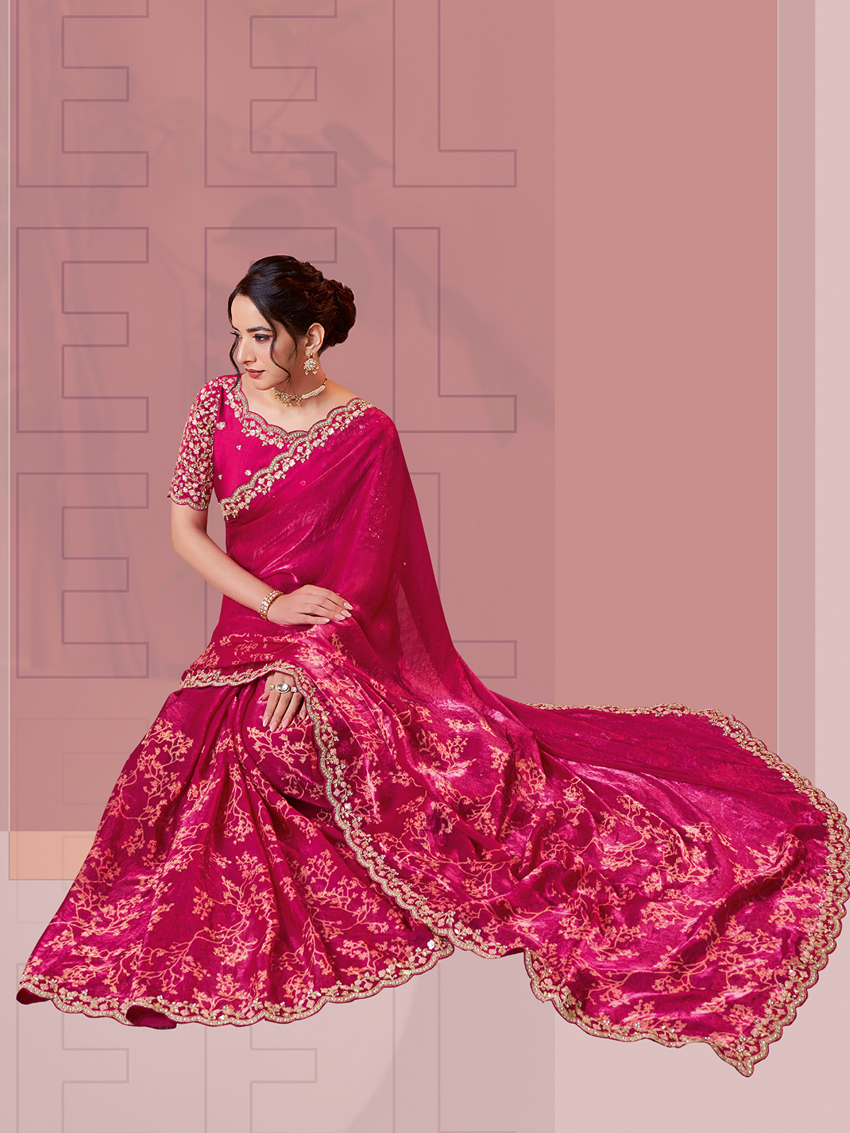 Woven in luminous magenta two-tone satin silk, this saree exudes elegance with traditional prints highlighted by thread, sequins, and diamond work. The silky texture and gleam bring wedding grandeur to life. Comes with an unstitched blouse piece.