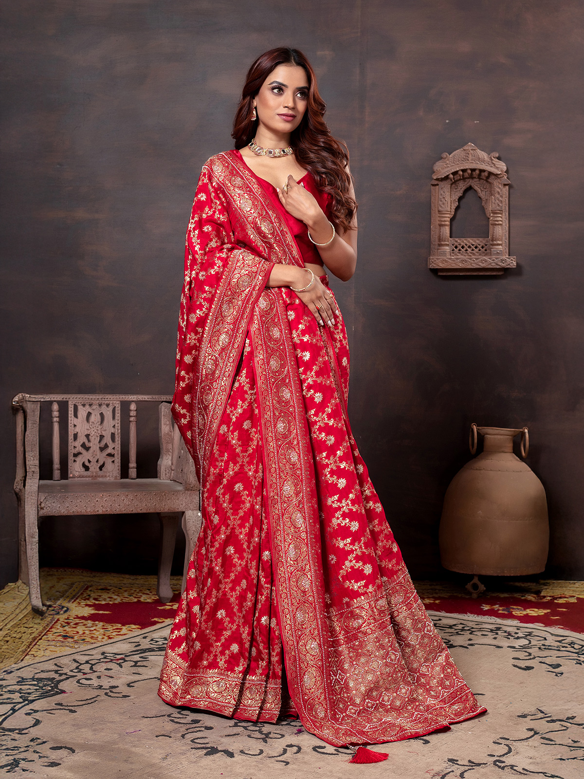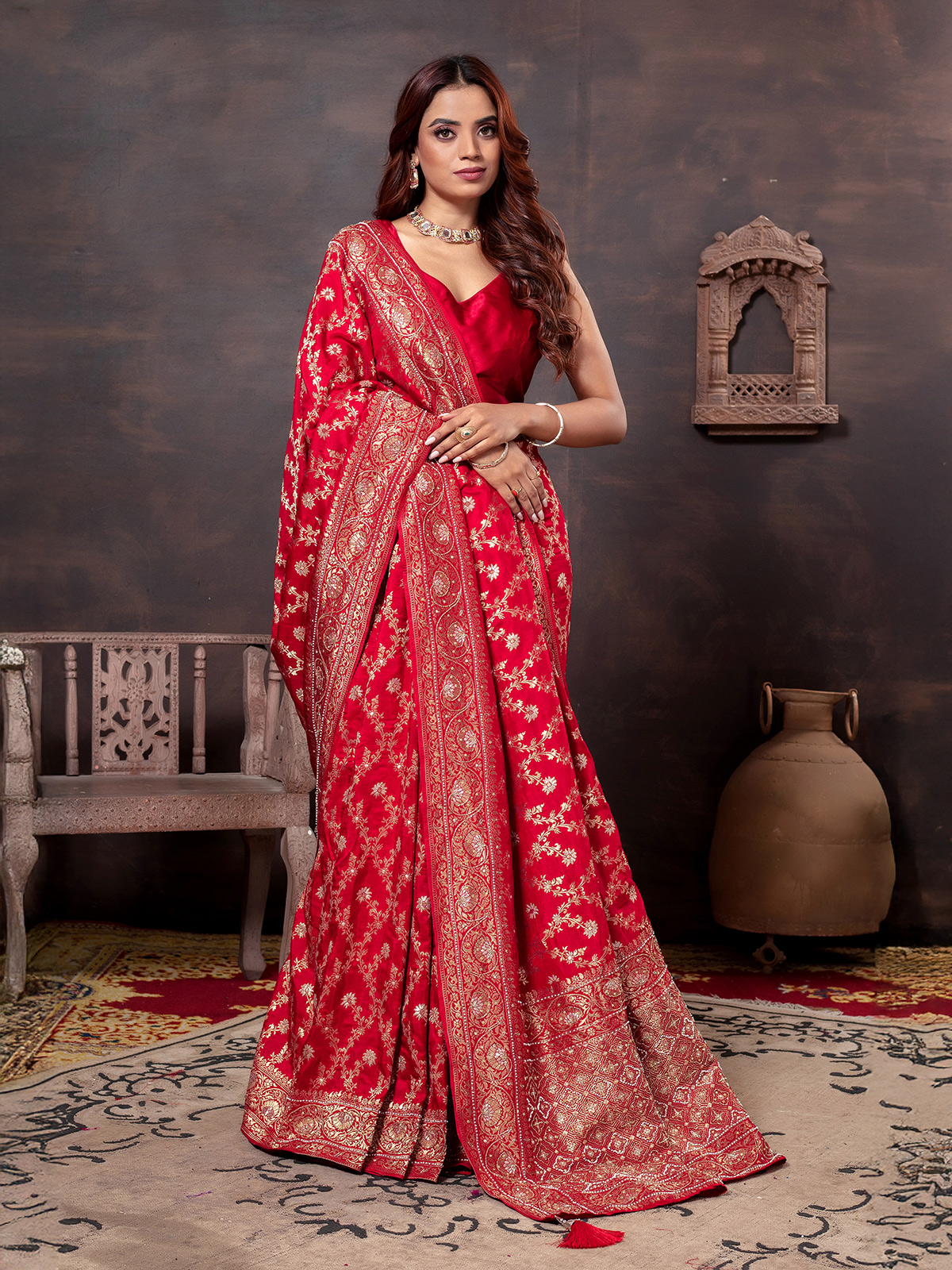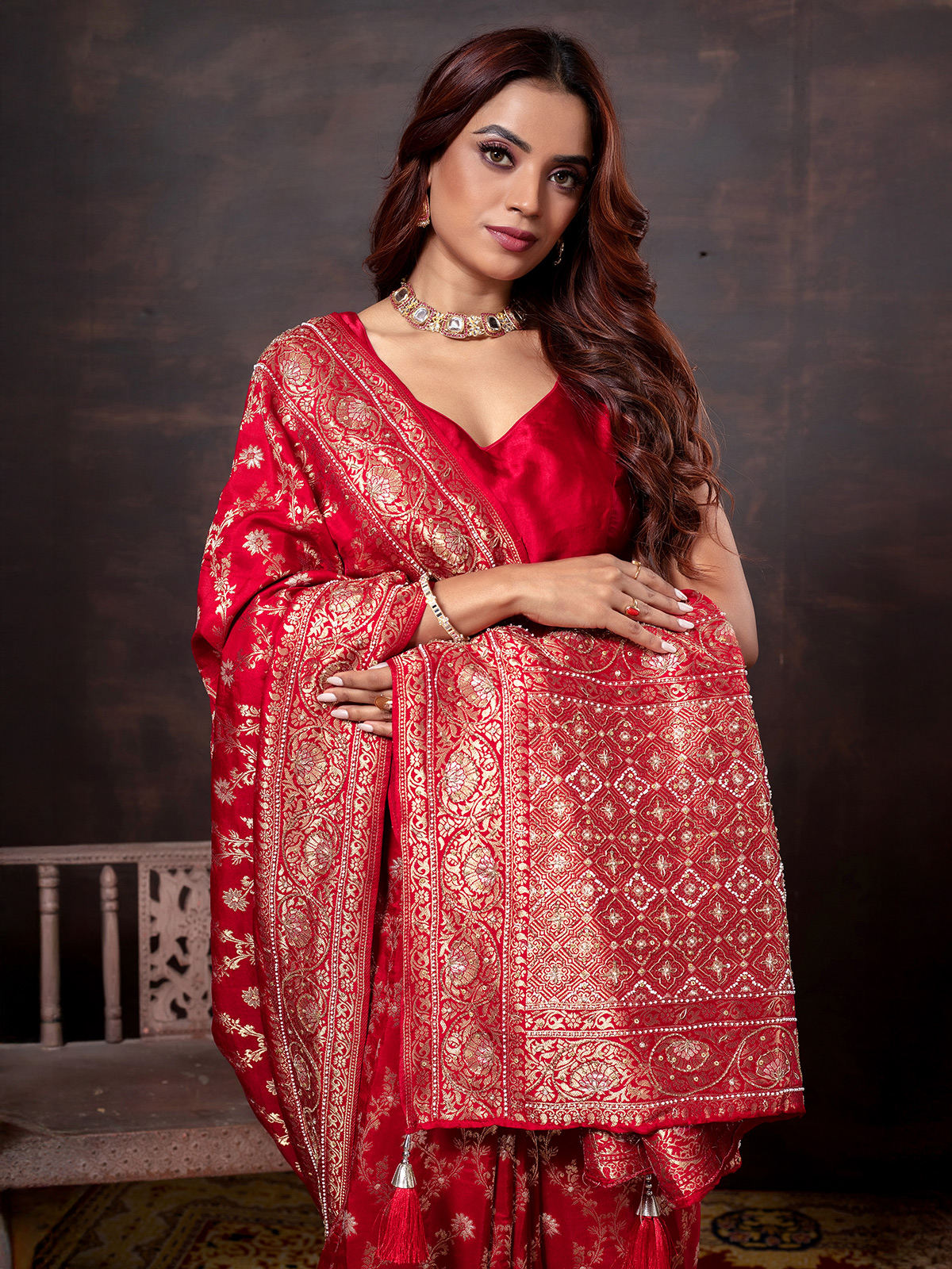Luxurious Red Beaded Dola Silk Saree