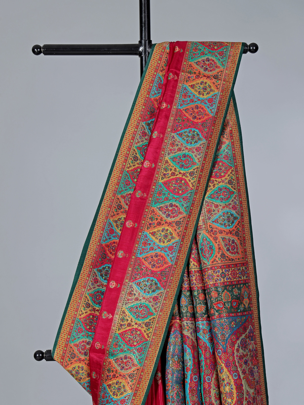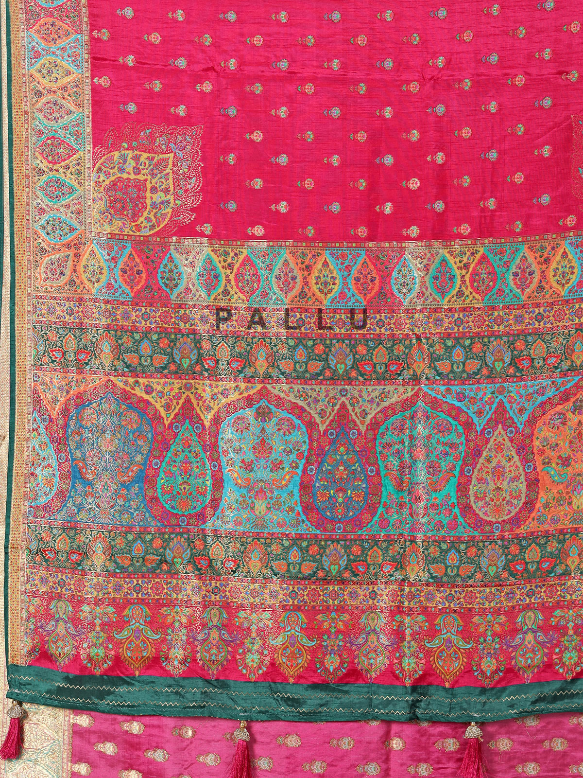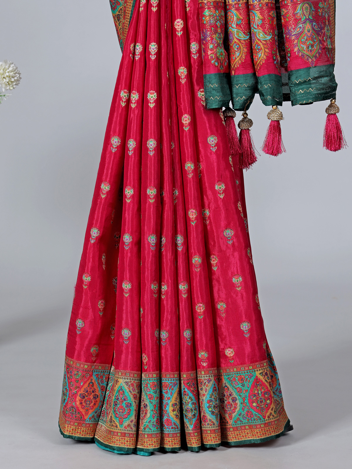 Bold and elegant, this magenta art pasmina silk saree features intricate embroidery, thread, and zari work, complemented by a striking red border and an elaborate multicolored pallu with ethnic paisley designs. Paired with an unstitched blouse, it is perfect for weddings, sangeet, receptions, and festive wear.