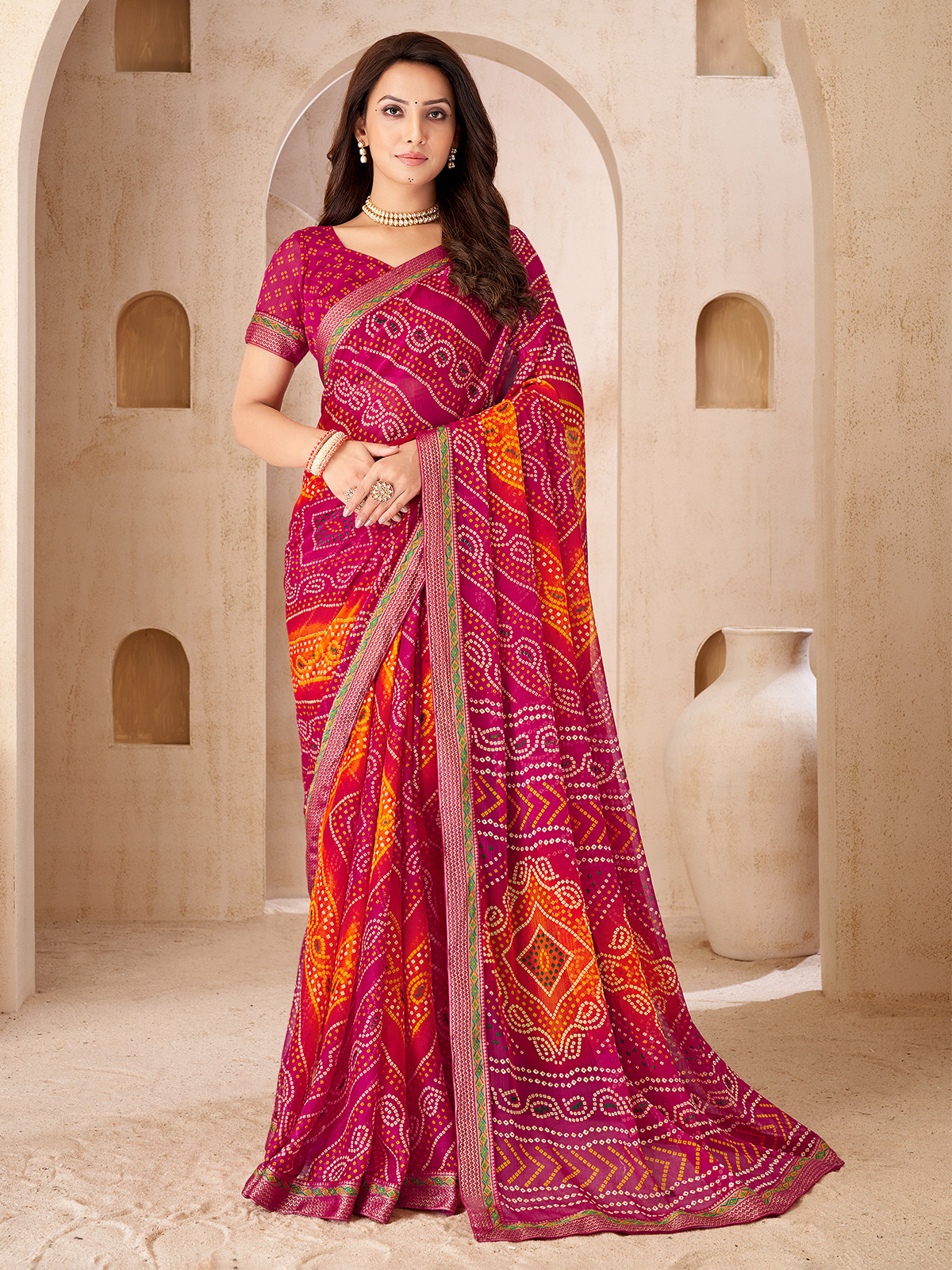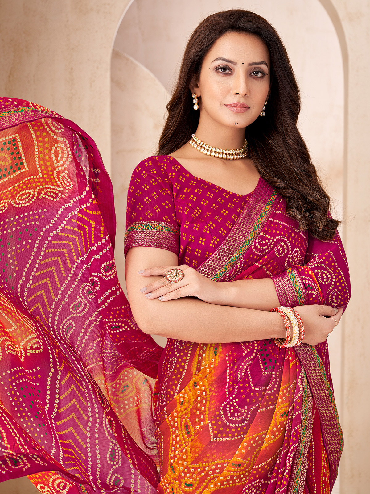 Magenta Bandhani Printed Saree In Chiffon For Festive Wear